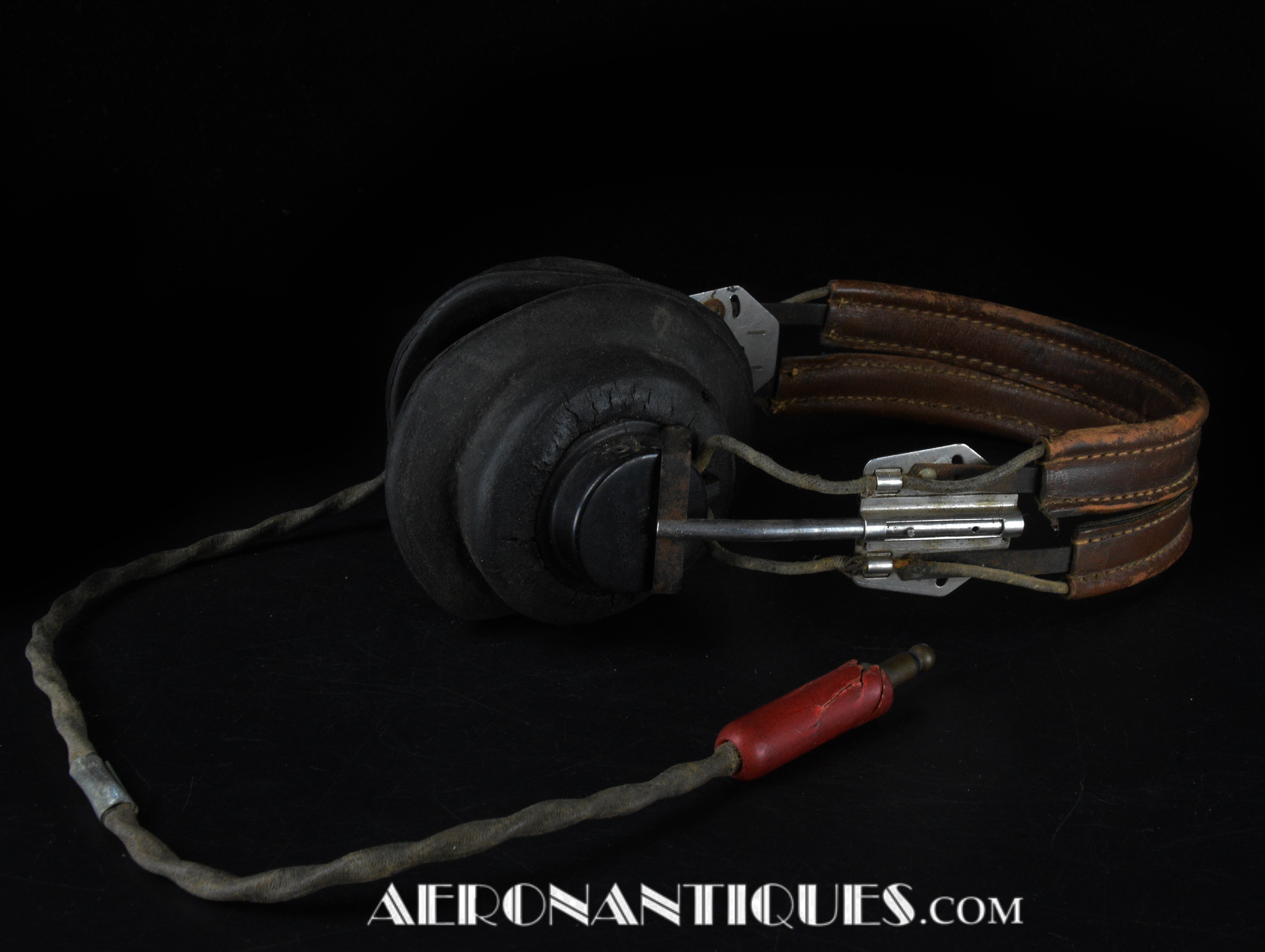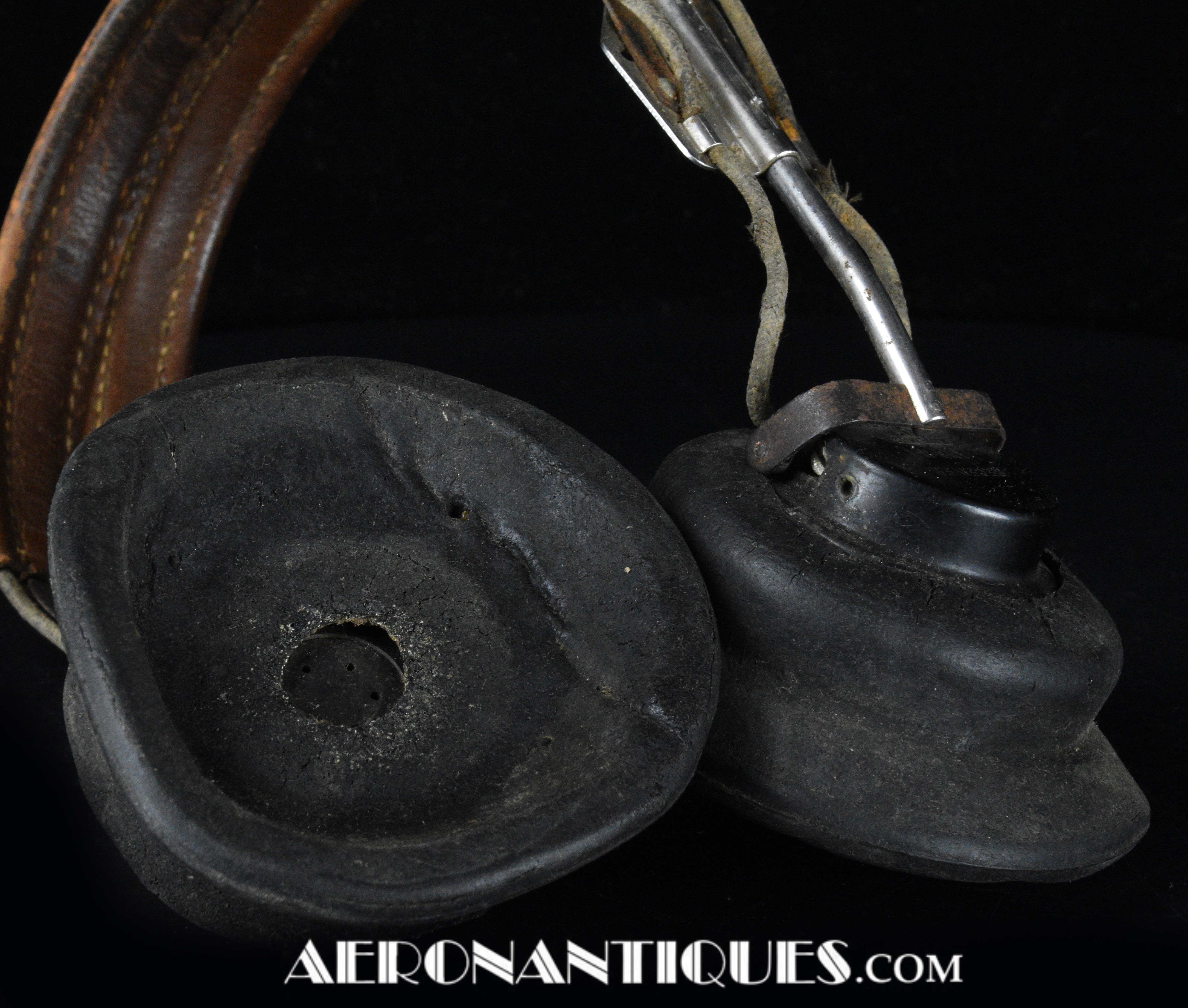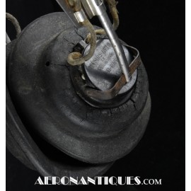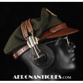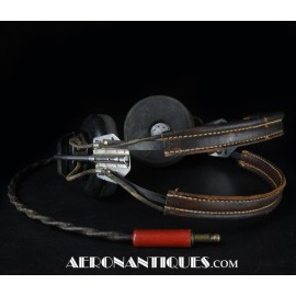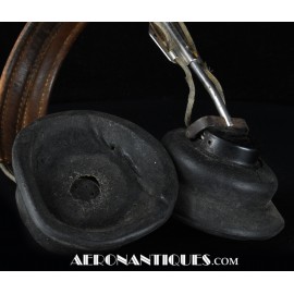 WWII US Army Air Force HS-33 headset, complete with cord and PL-354 plug. It's composed of a HB-7 leather covered frame, a pair of bakelite ANB-H-1 receivers made by CHICAGO and rare early bell shaped rubber ear pads (same as the brown ones usually seen on early HS-23 headsets). Perfect to display a 50 missions crusher hat. Hat and sunglasses are not included.