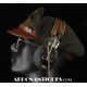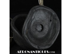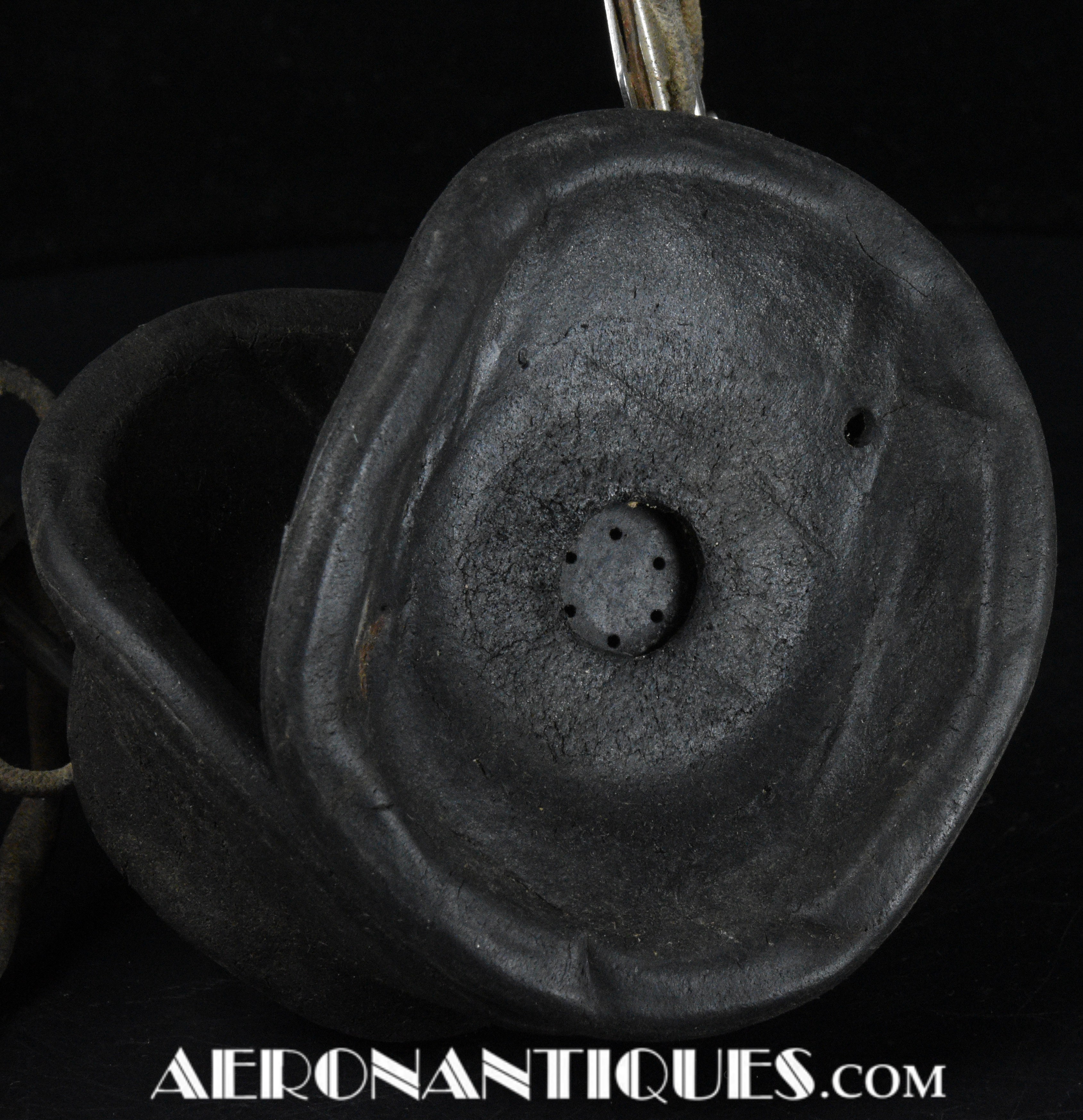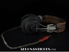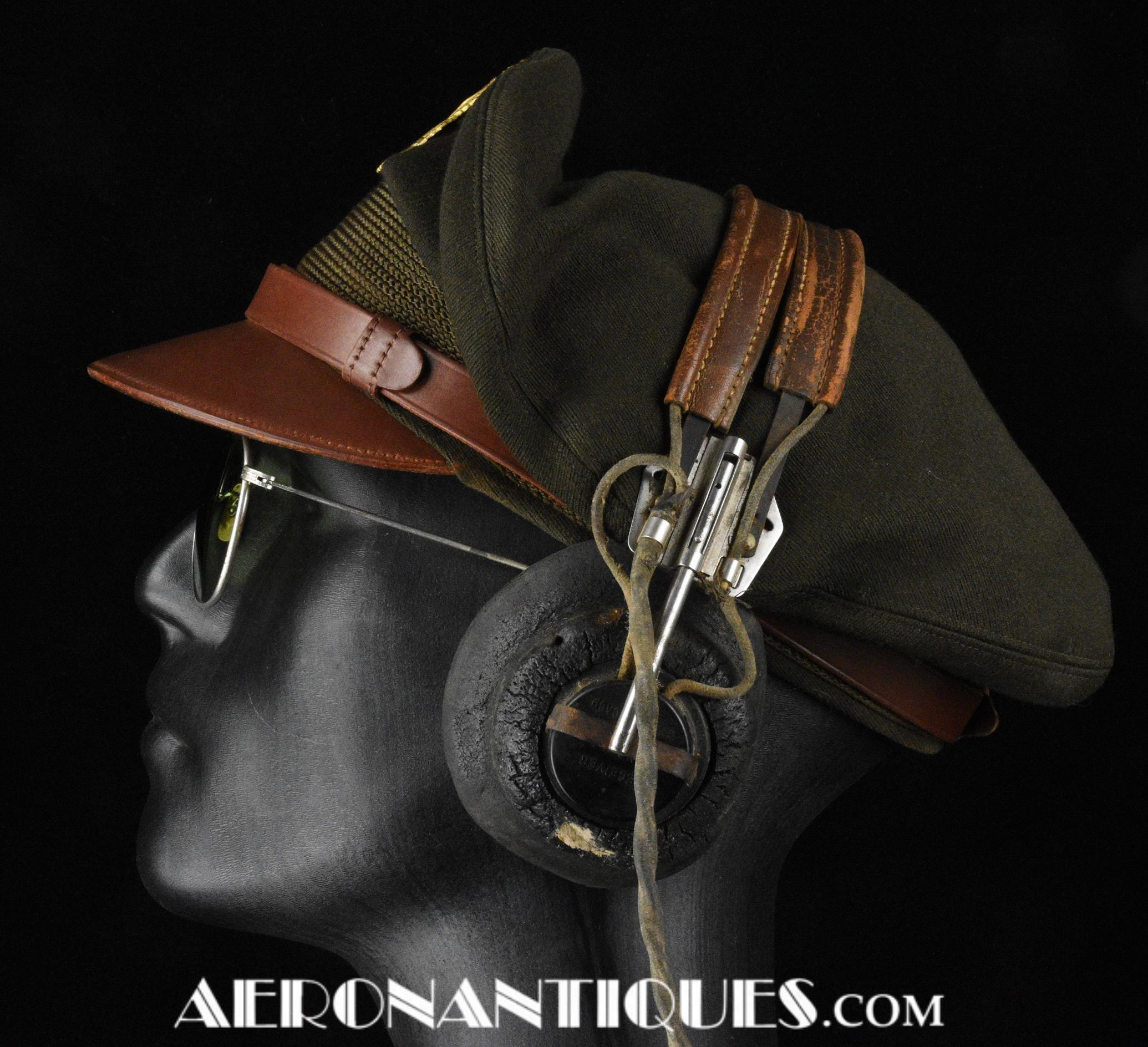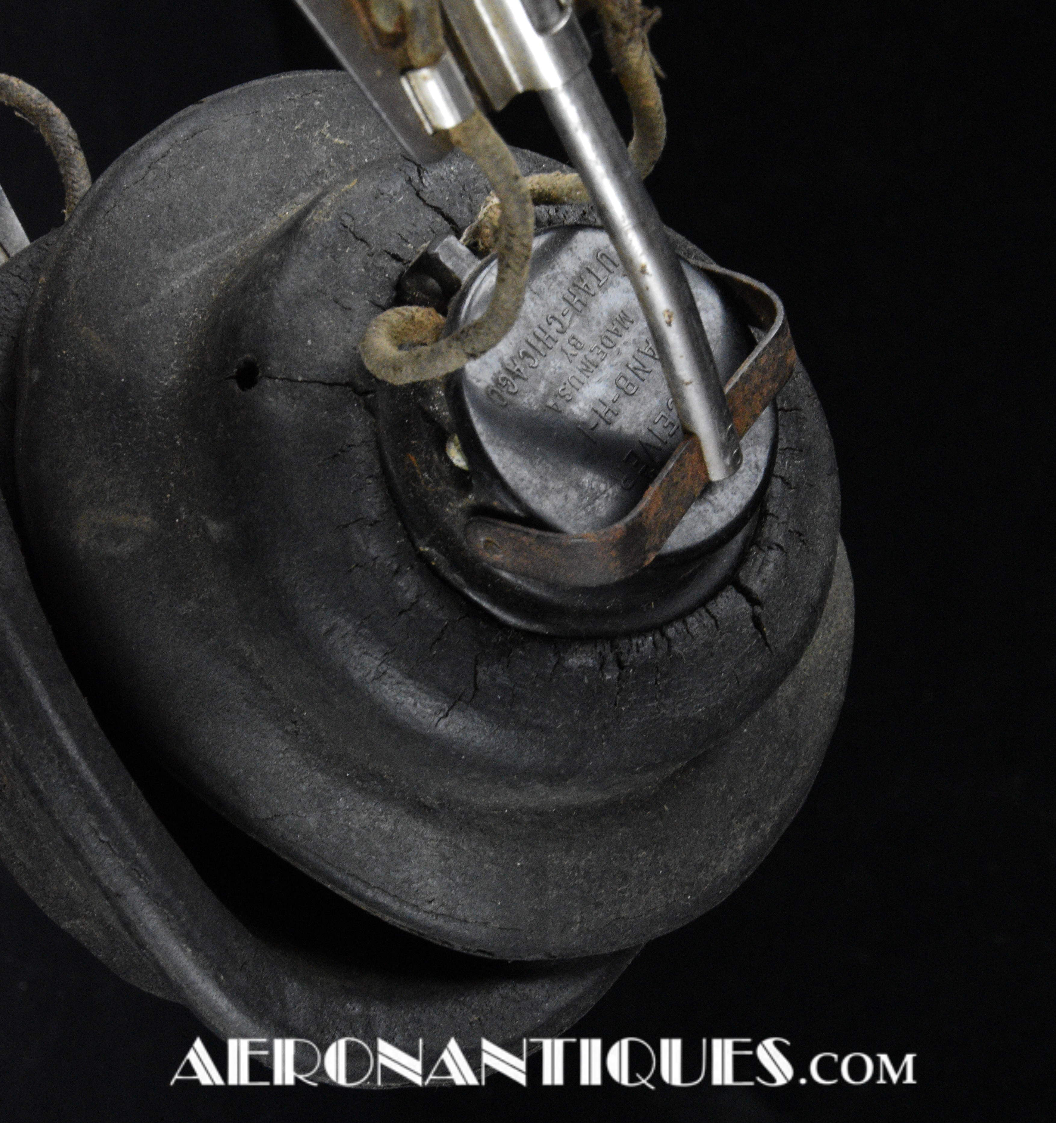 WWII US Army Air Force HS-33 headset, complete with cord and PL-354 plug. It's composed of a HB-7 leather covered frame, a pair of bakelite ANB-H-1 receivers made by CHICAGO and rare early bell shaped rubber ear pads (same as the brown ones usually seen on early HS-23 headsets). Perfect to display a 50 missions crusher hat. Hat and sunglasses are not included.
