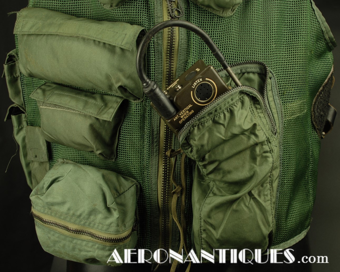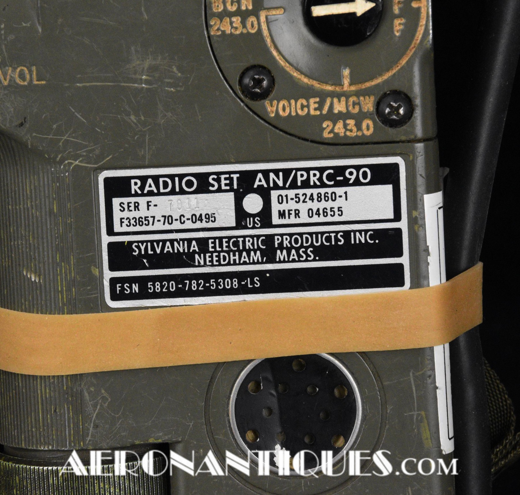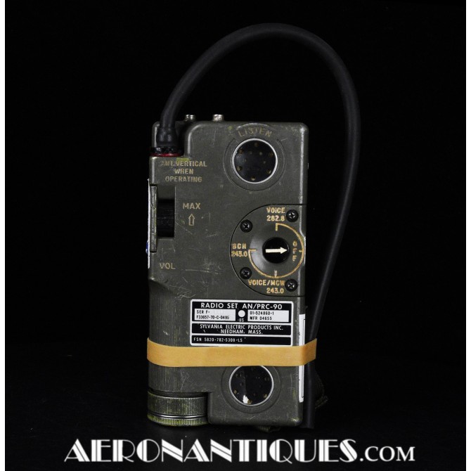 Vietnam era US Navy, Marine Corps or Air Force pilot camouflaged AN/PRC-90 survival radio. Dated 1970, made by SYLVANIA ELECTRIC PRODUCTS INC. . Complete with flexible 1/4 waves antenna. Essential to complete a US Navy SV-2 A/B or Air Force SRU-21 survival vest. Introduced in the late 60's, these survival radios were developed to establish a communication between downed pilots and their rescue & recovery teams, they were still in use in the early 2000's.