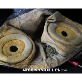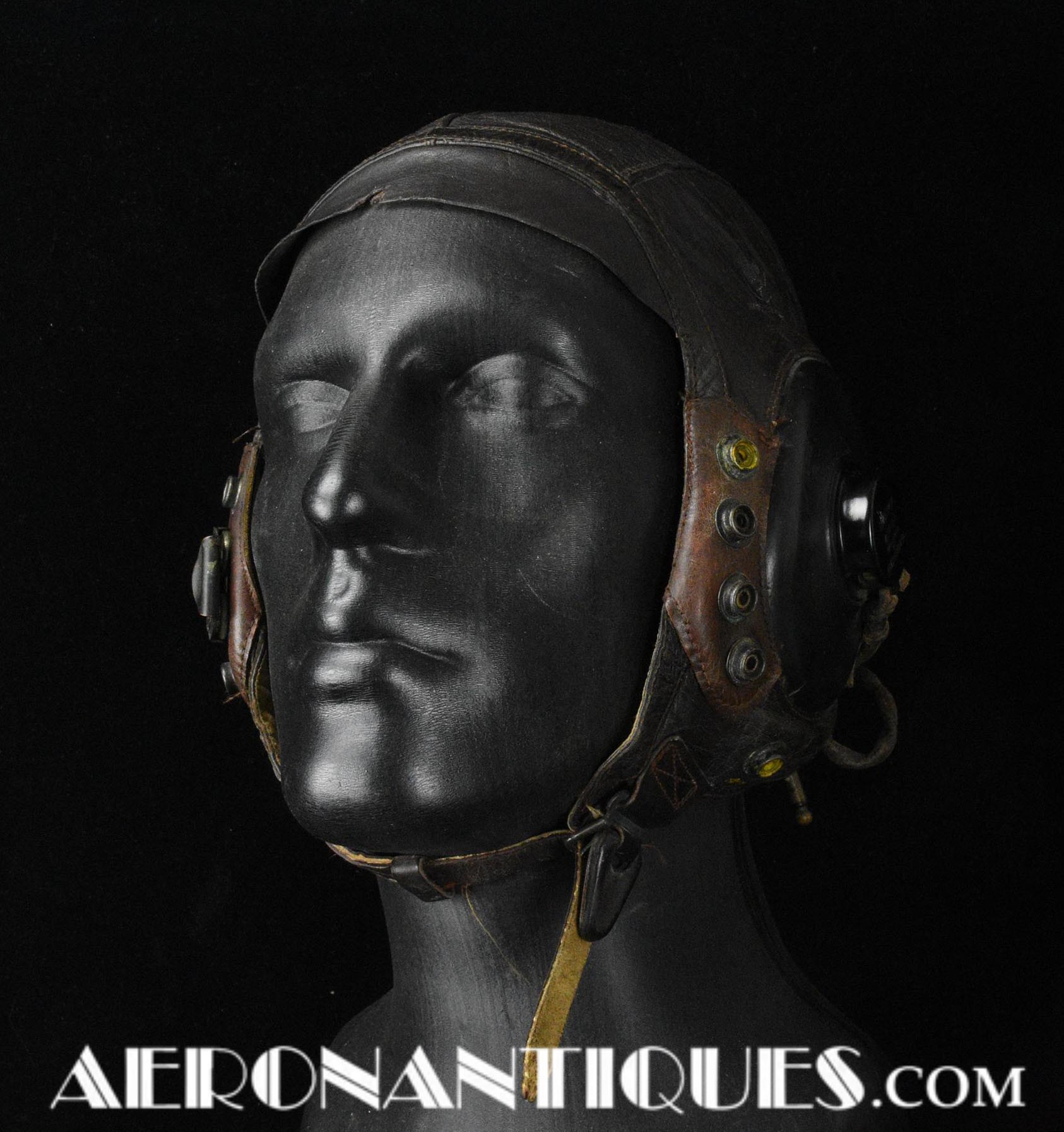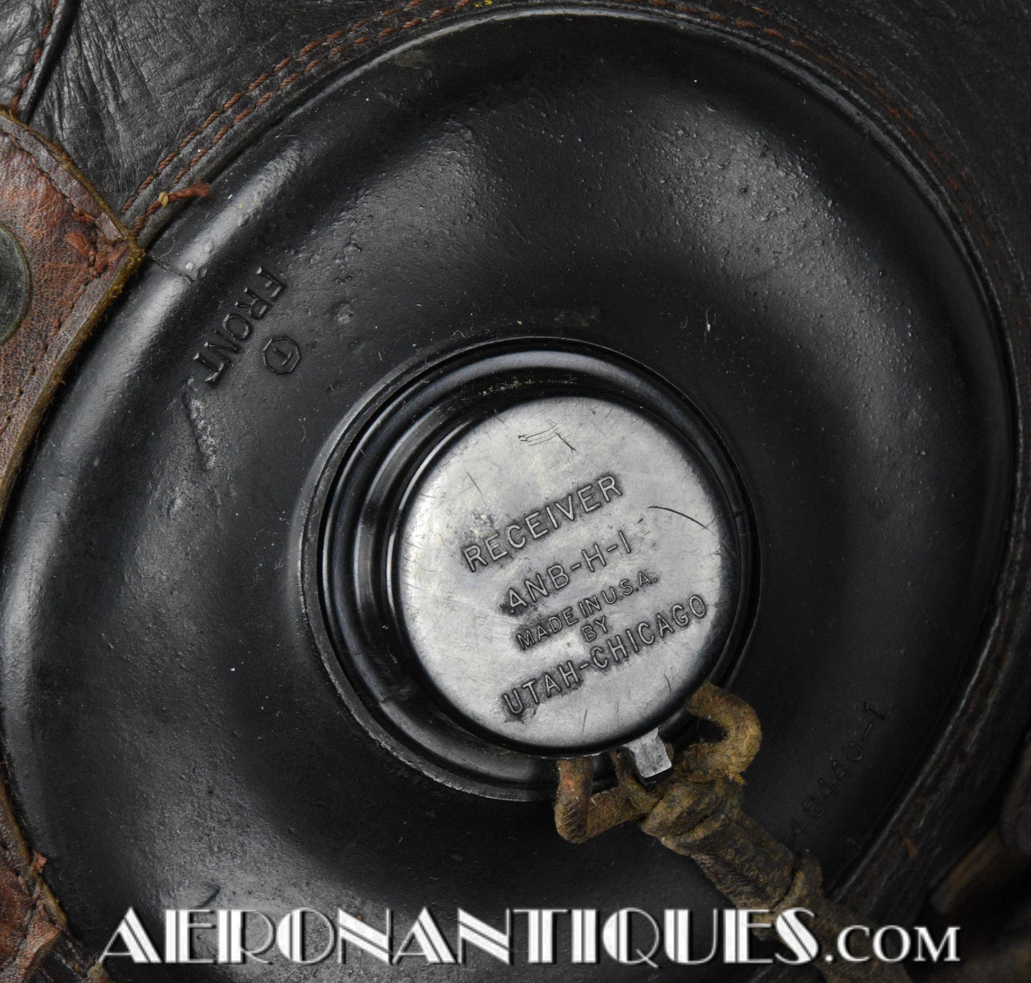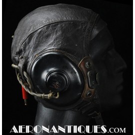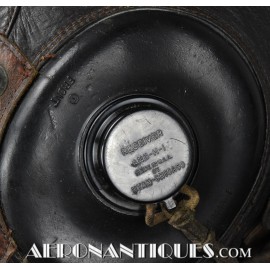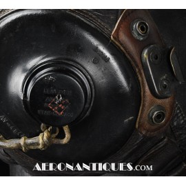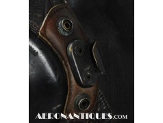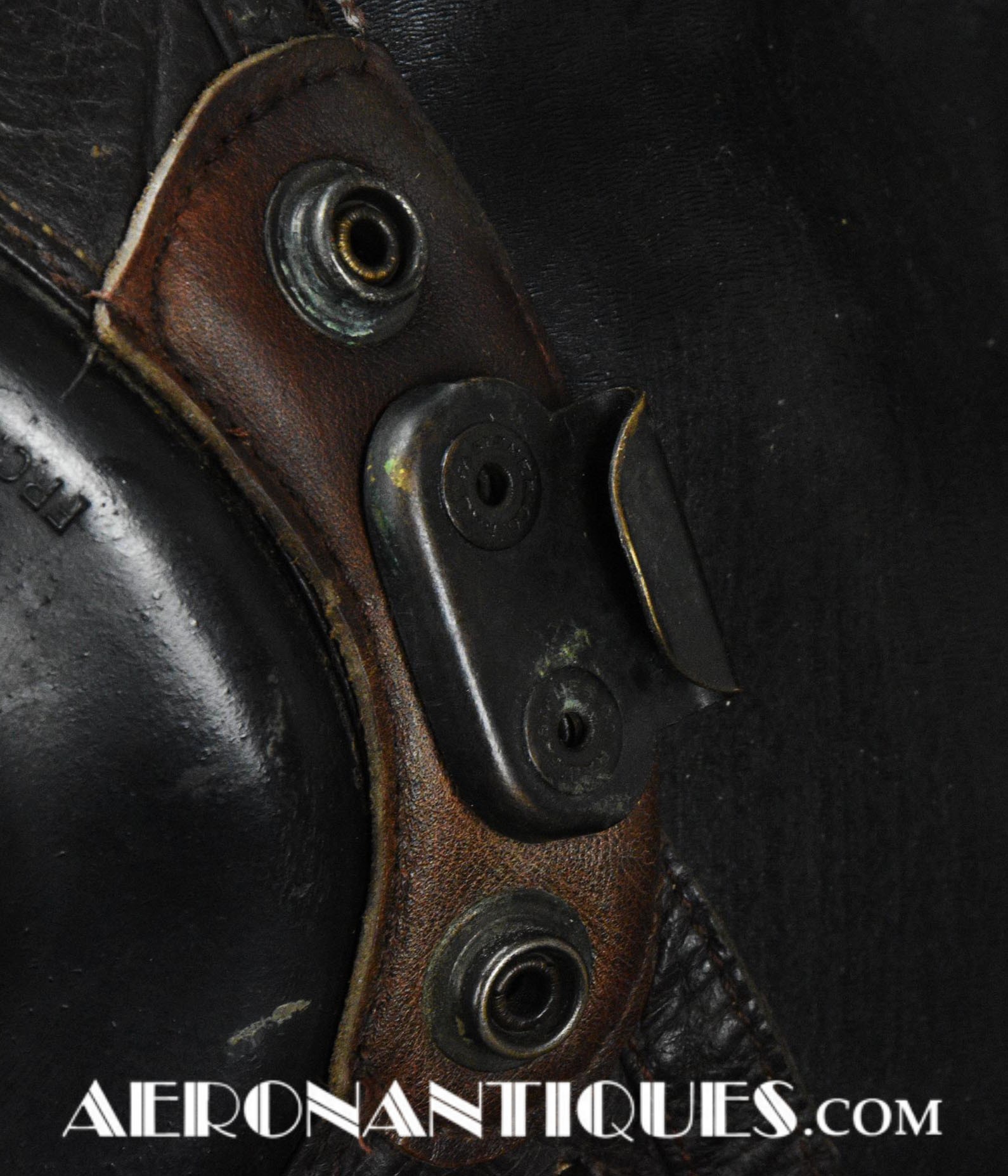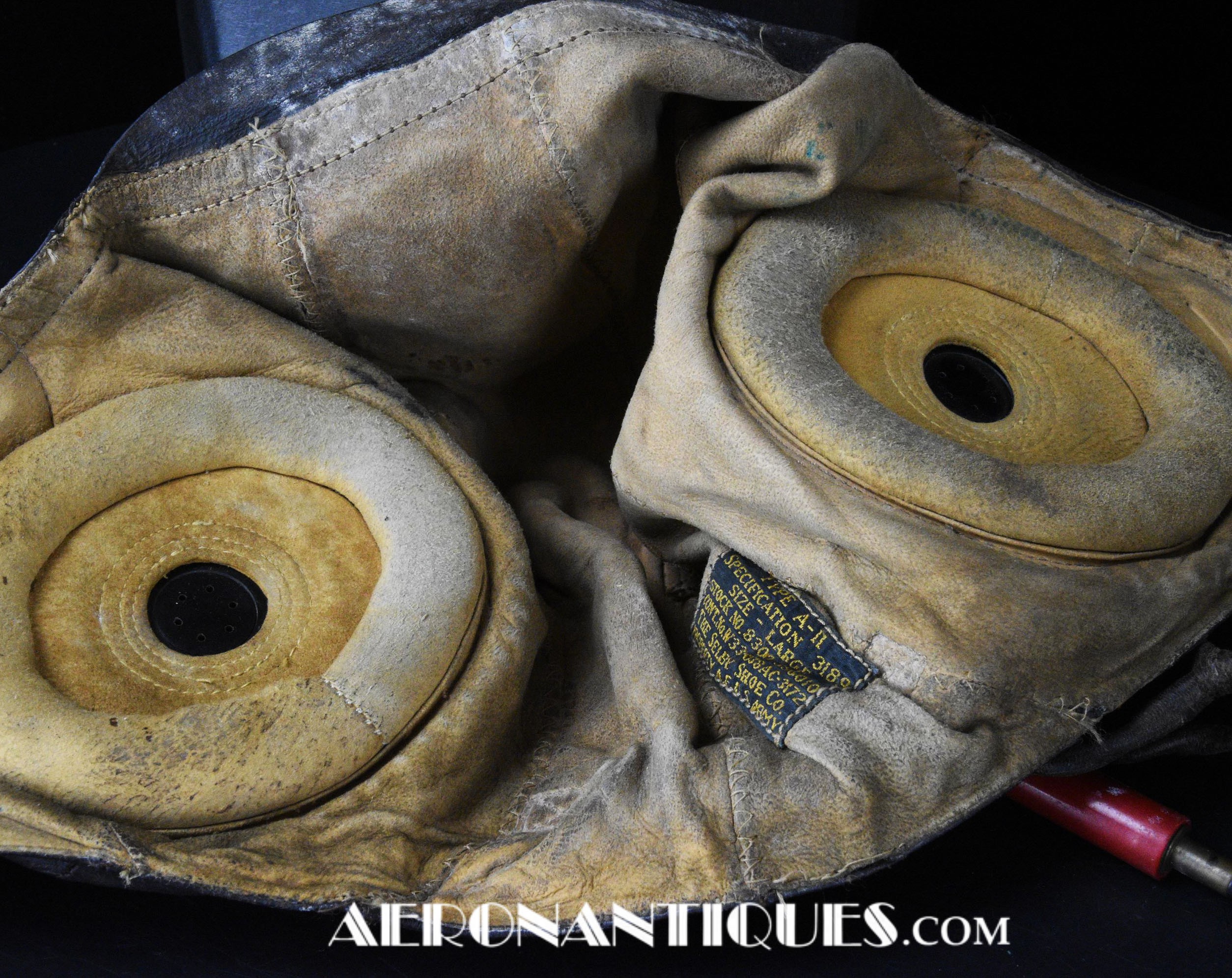 WWII US Army Air Force A-11 goatskin leather flying helmet with chamois lining, made by SELBY SHOE. , size LARGE, complete with originally fitted ANB-H-1 earphones made by "UTAH-CHICAGO", uncut cables, PL-354 jack. Oxygen mask attachment hook. 3rd pattern with 4 press studs on each side. Goggles, mask and display stand aren't included.