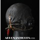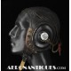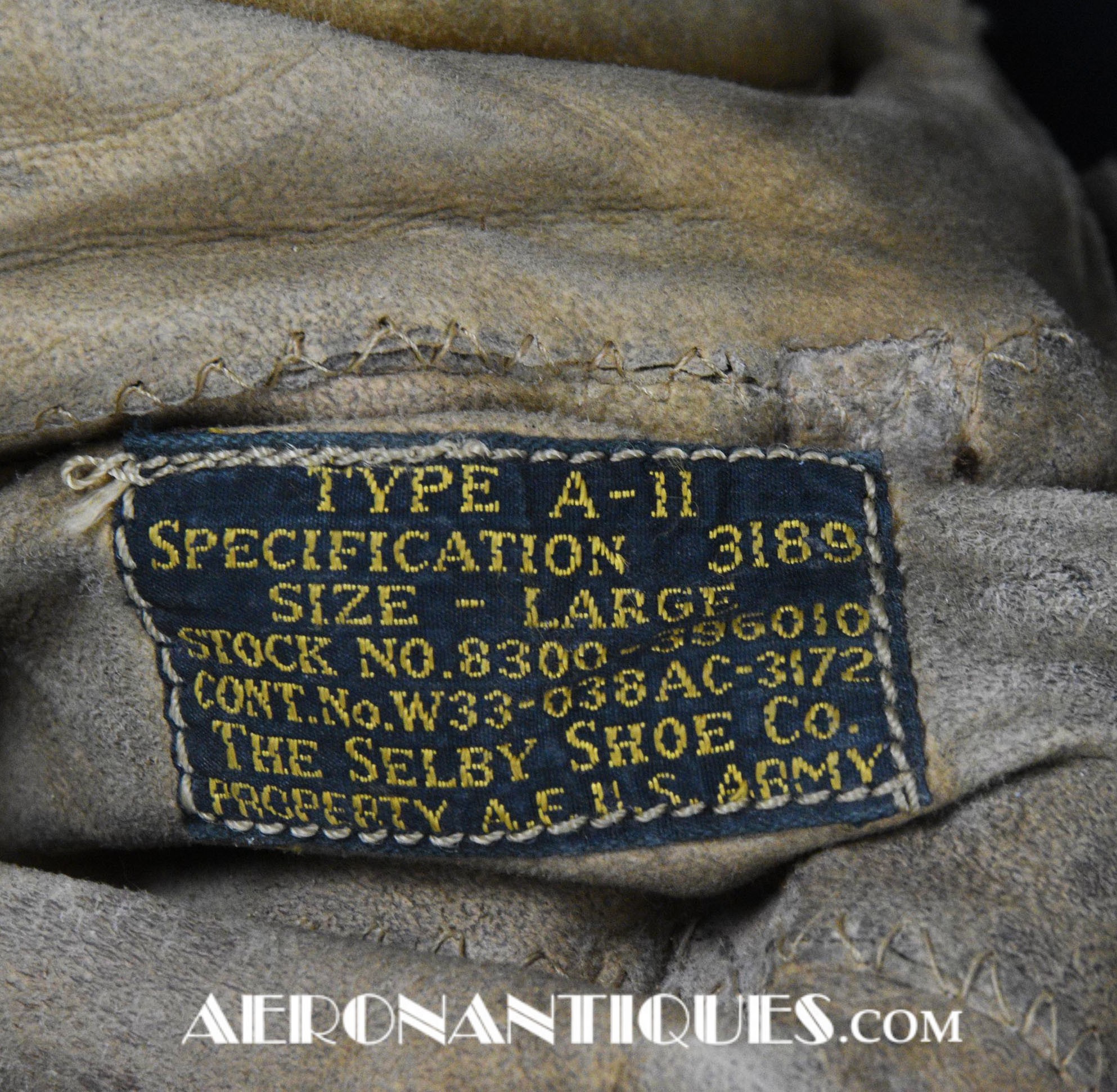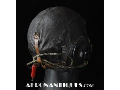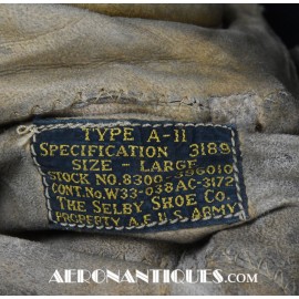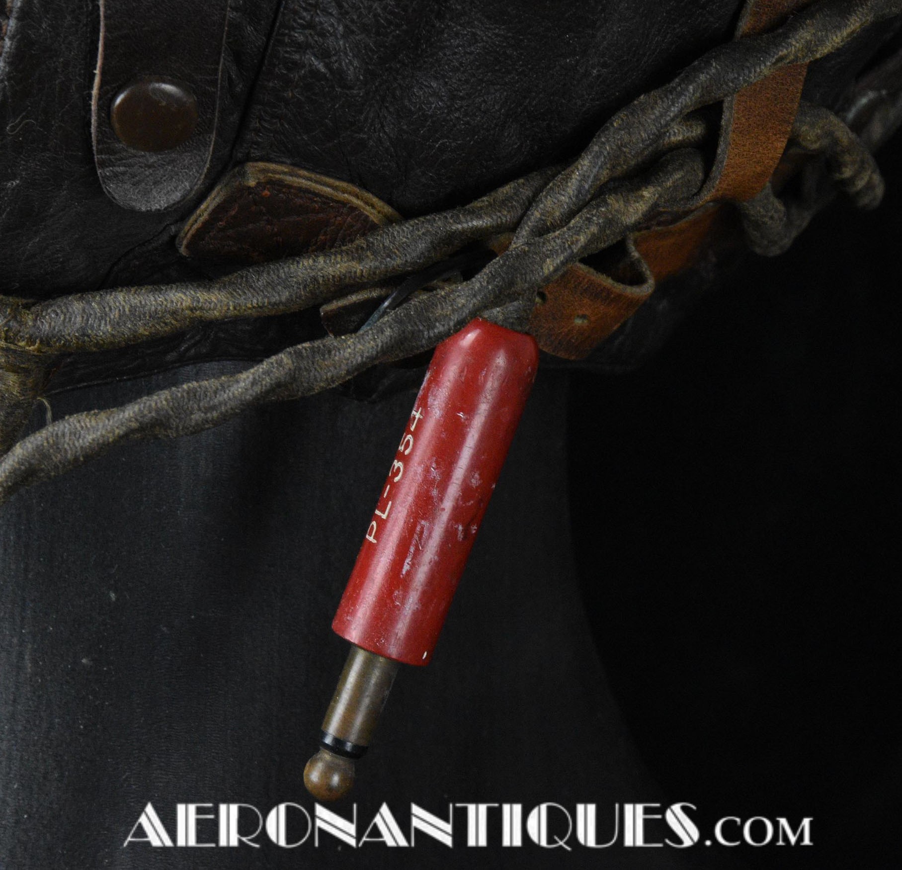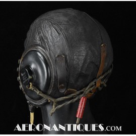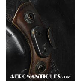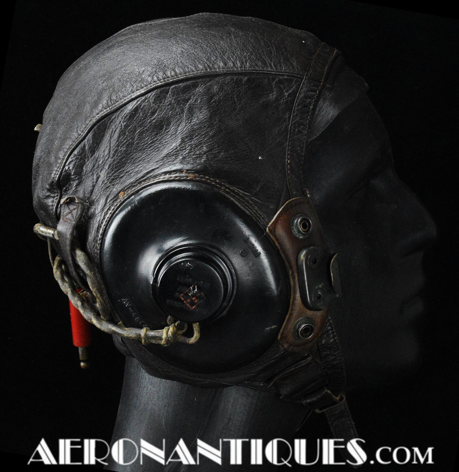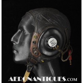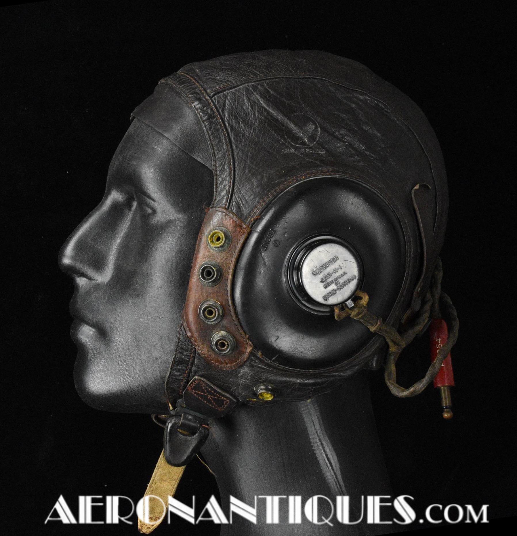WWII US Army Air Force A-11 goatskin leather flying helmet with chamois lining, made by SELBY SHOE. , size LARGE, complete with originally fitted ANB-H-1 earphones made by "UTAH-CHICAGO", uncut cables, PL-354 jack. Oxygen mask attachment hook. 3rd pattern with 4 press studs on each side. Goggles, mask and display stand aren't included.