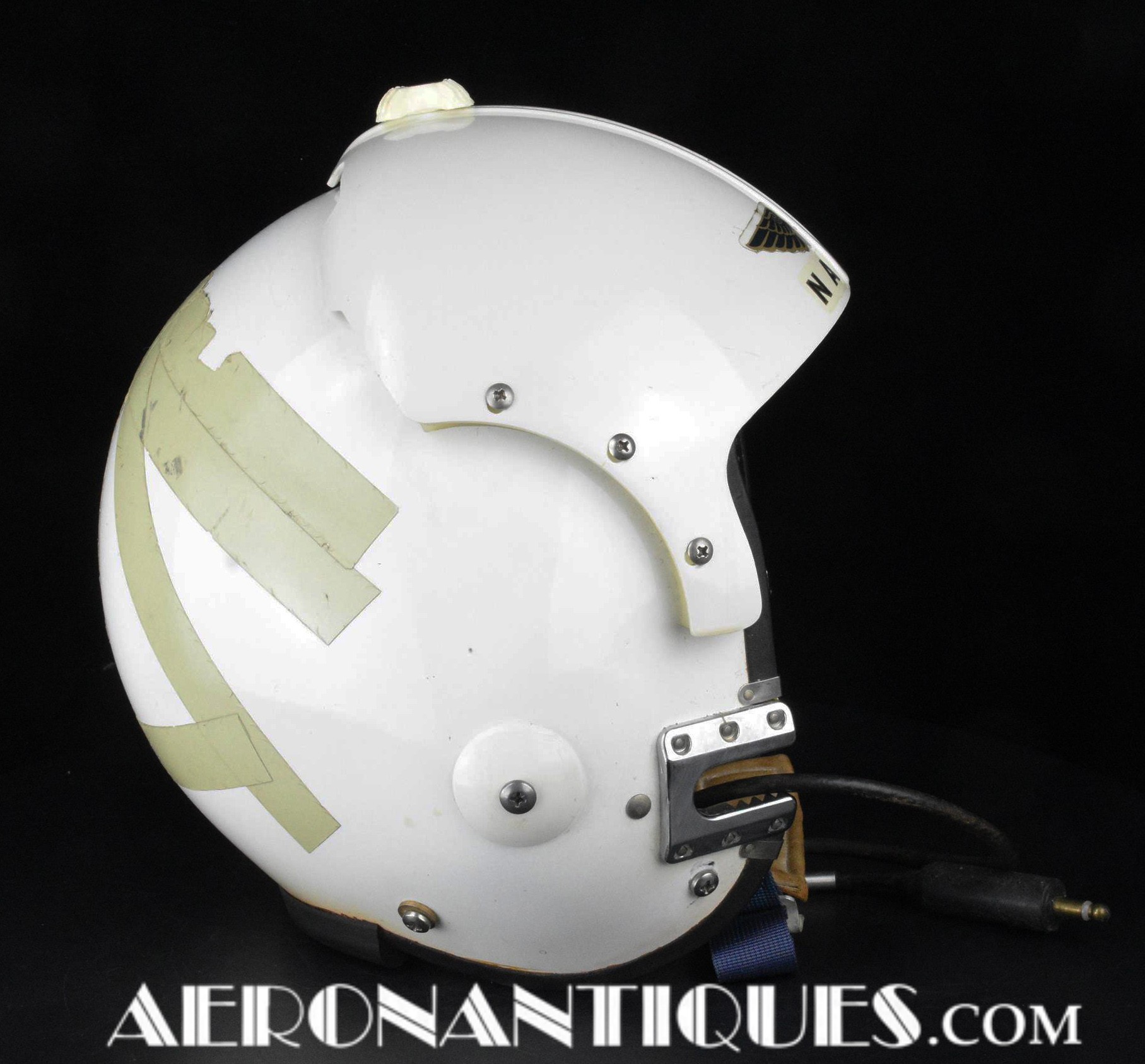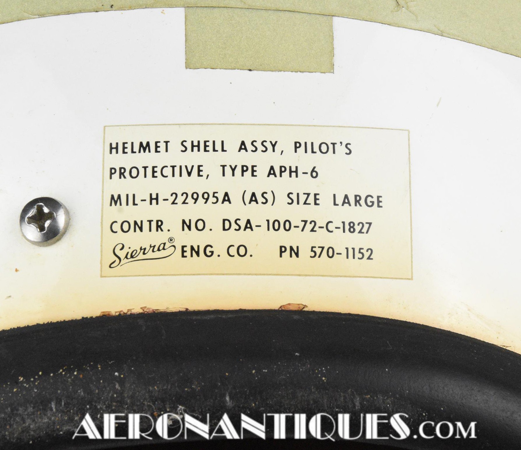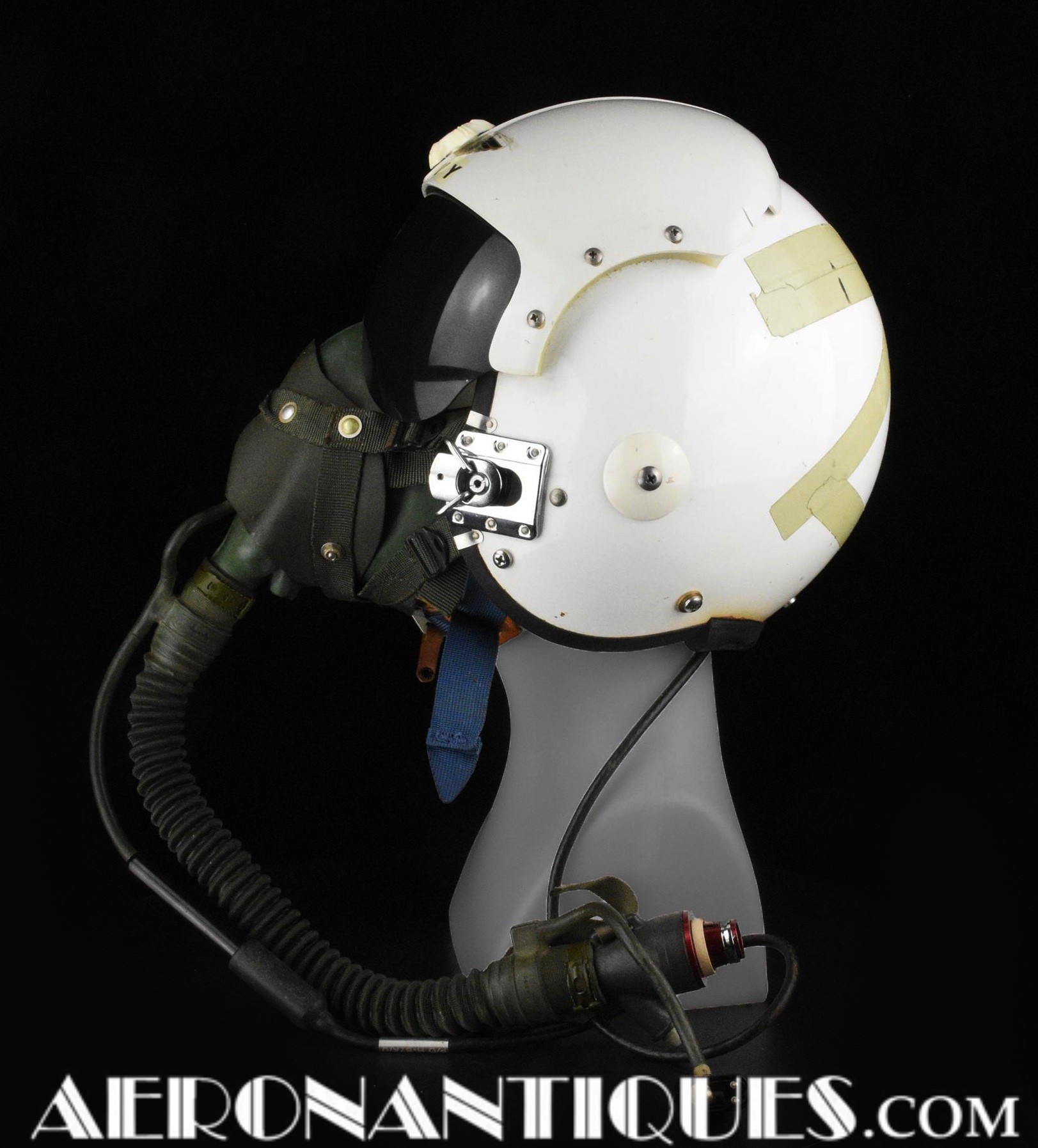 Circa 1972 US Navy jet fighter pilot flight helmet and oxygen mask. Flight helmet is an APH-6D  (3rd pattern with 2 parts styrofoam liner), made by SIERRA, complete with avionics and leather covered foam cushion pads. Single tinted visor. Rare Large size. Matching A13-A oxygen mask dated 1966, made by MSA. Size MEDIUM. MC-3/A oxygen connector. Hardman hardshell with chromed butterfly fasteners. Rigger made oxygen mask carrying bag.  Outstanding condition. Display included.