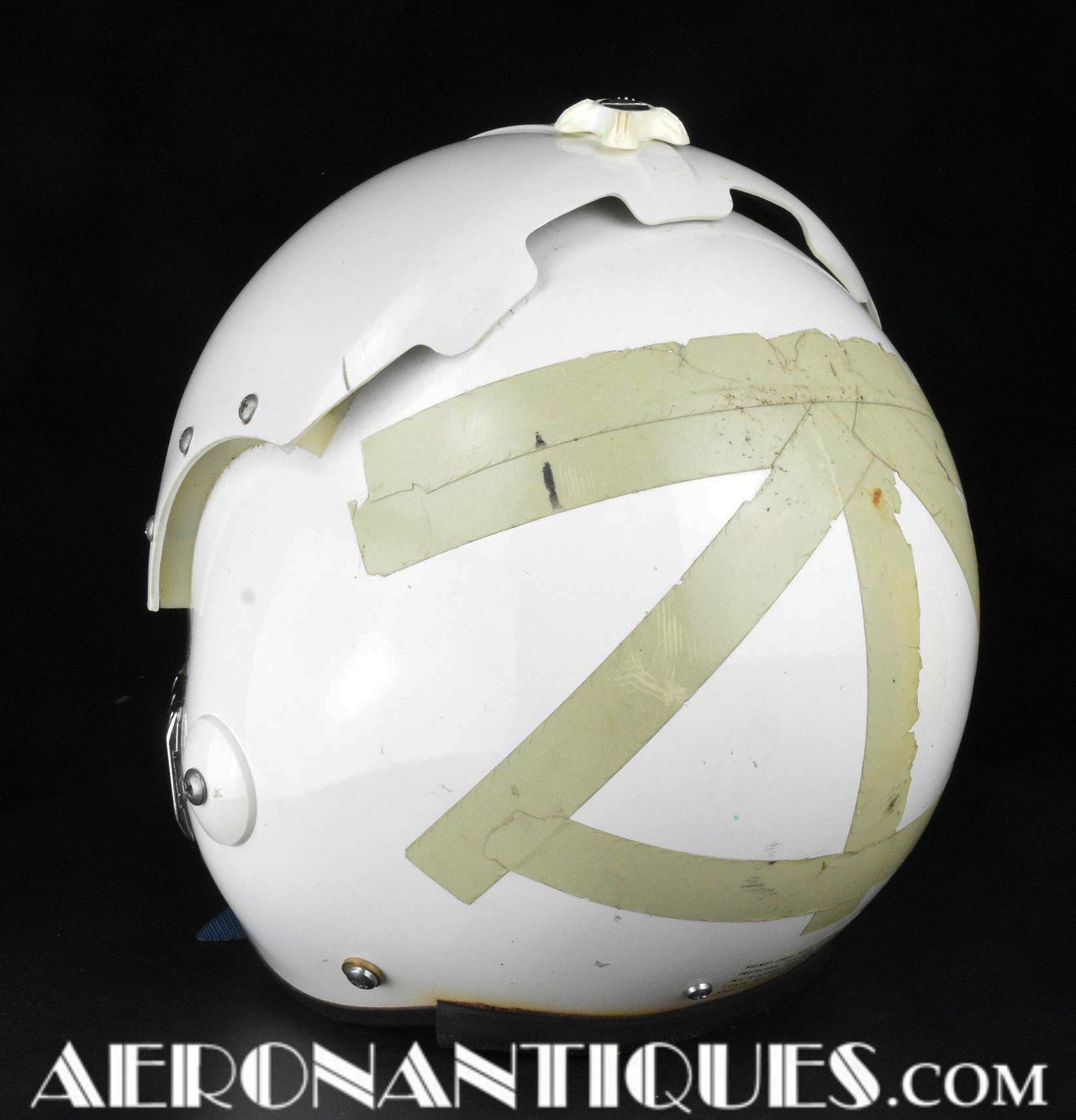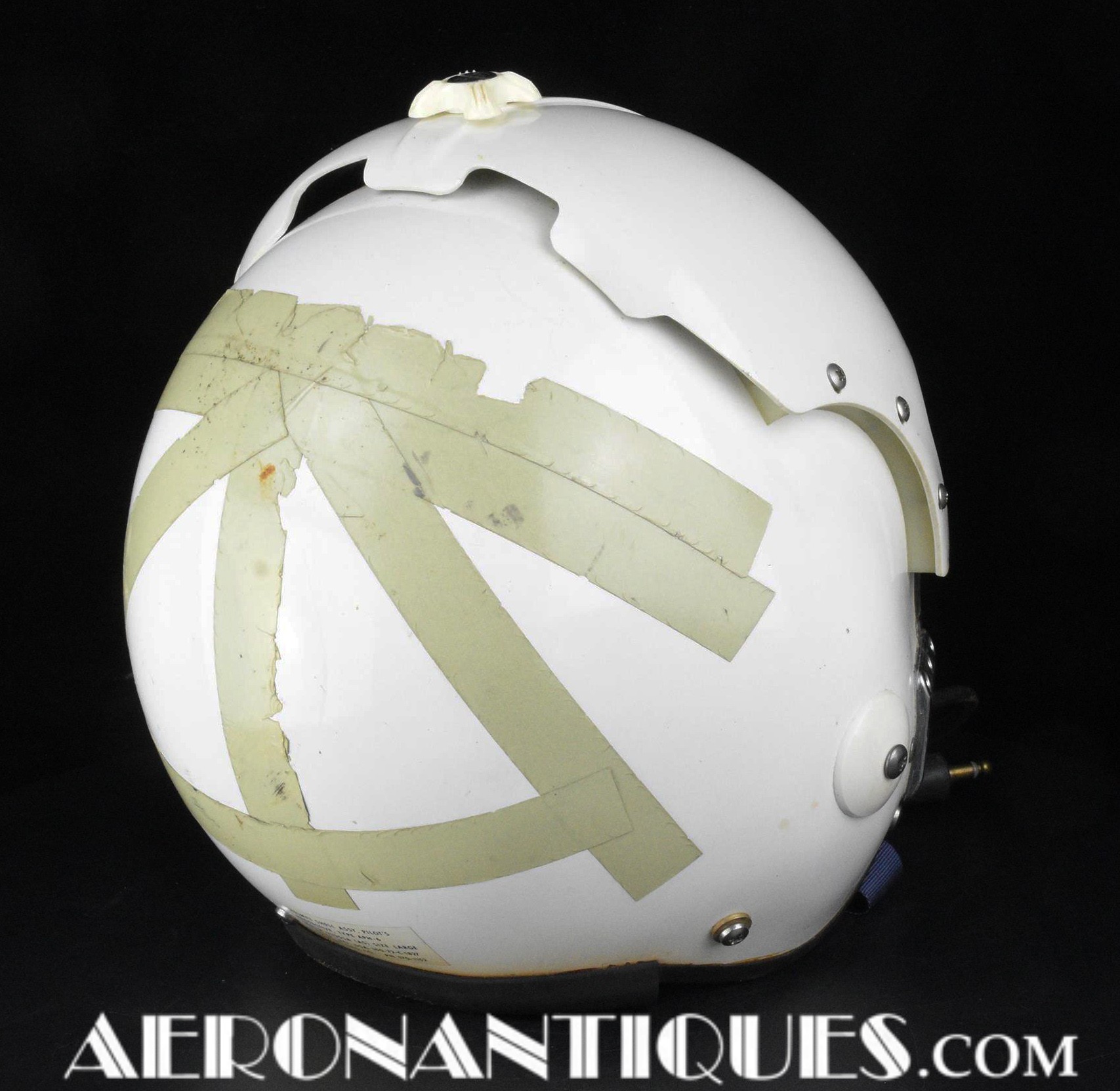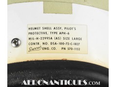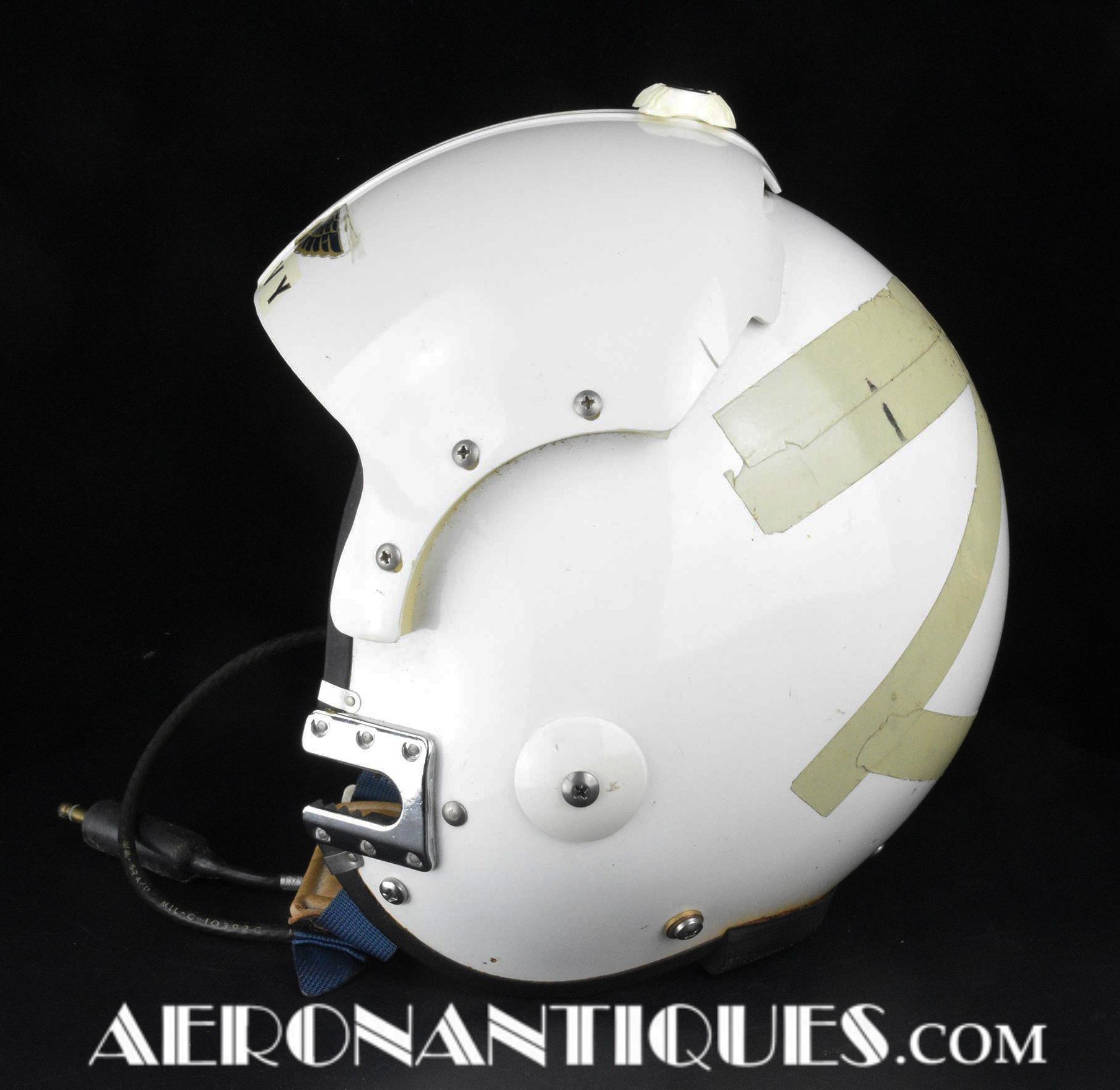 Circa 1972 US Navy jet fighter pilot flight helmet and oxygen mask. Flight helmet is an APH-6D  (3rd pattern with 2 parts styrofoam liner), made by SIERRA, complete with avionics and leather covered foam cushion pads. Single tinted visor. Rare Large size. Matching A13-A oxygen mask dated 1966, made by MSA. Size MEDIUM. MC-3/A oxygen connector. Hardman hardshell with chromed butterfly fasteners. Rigger made oxygen mask carrying bag.  Outstanding condition. Display included.