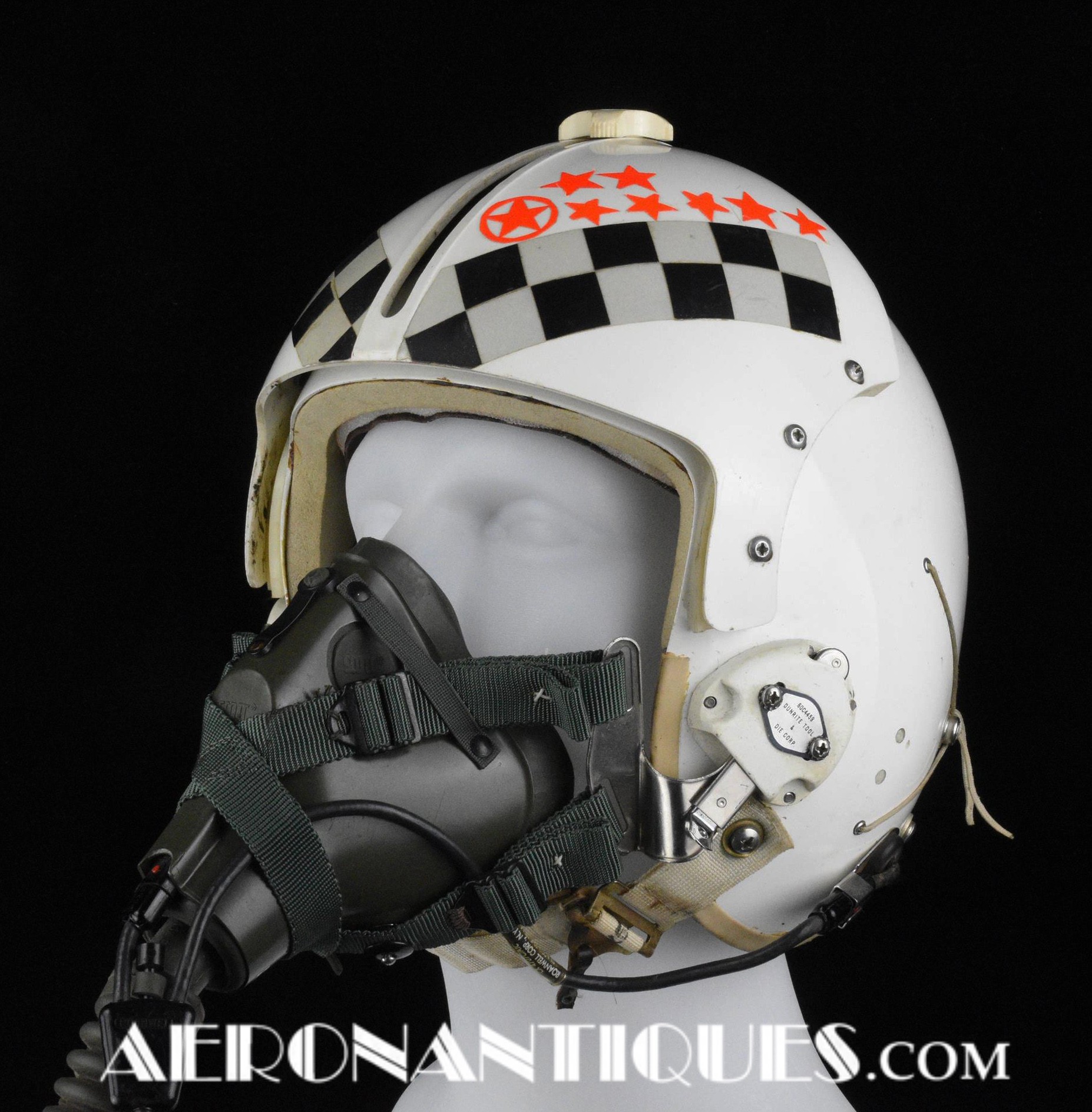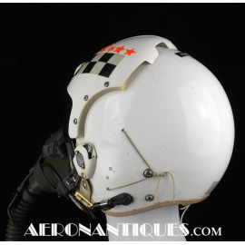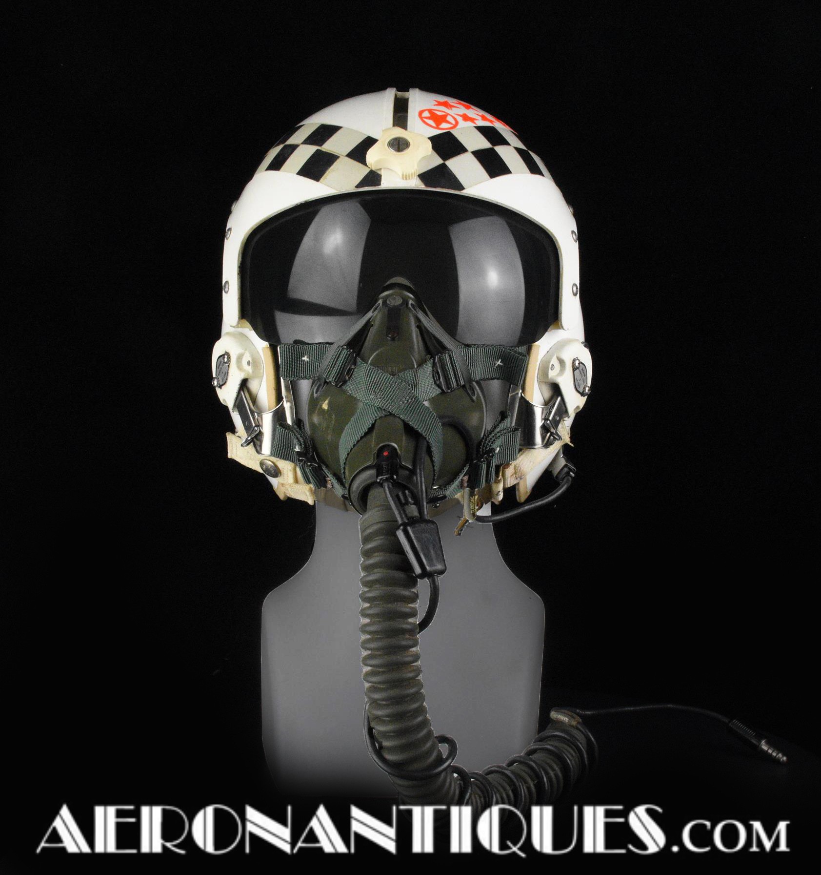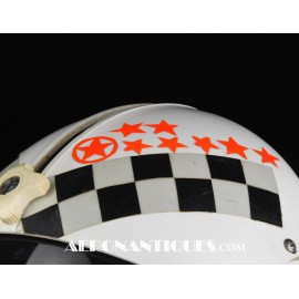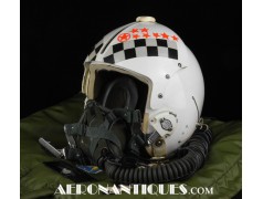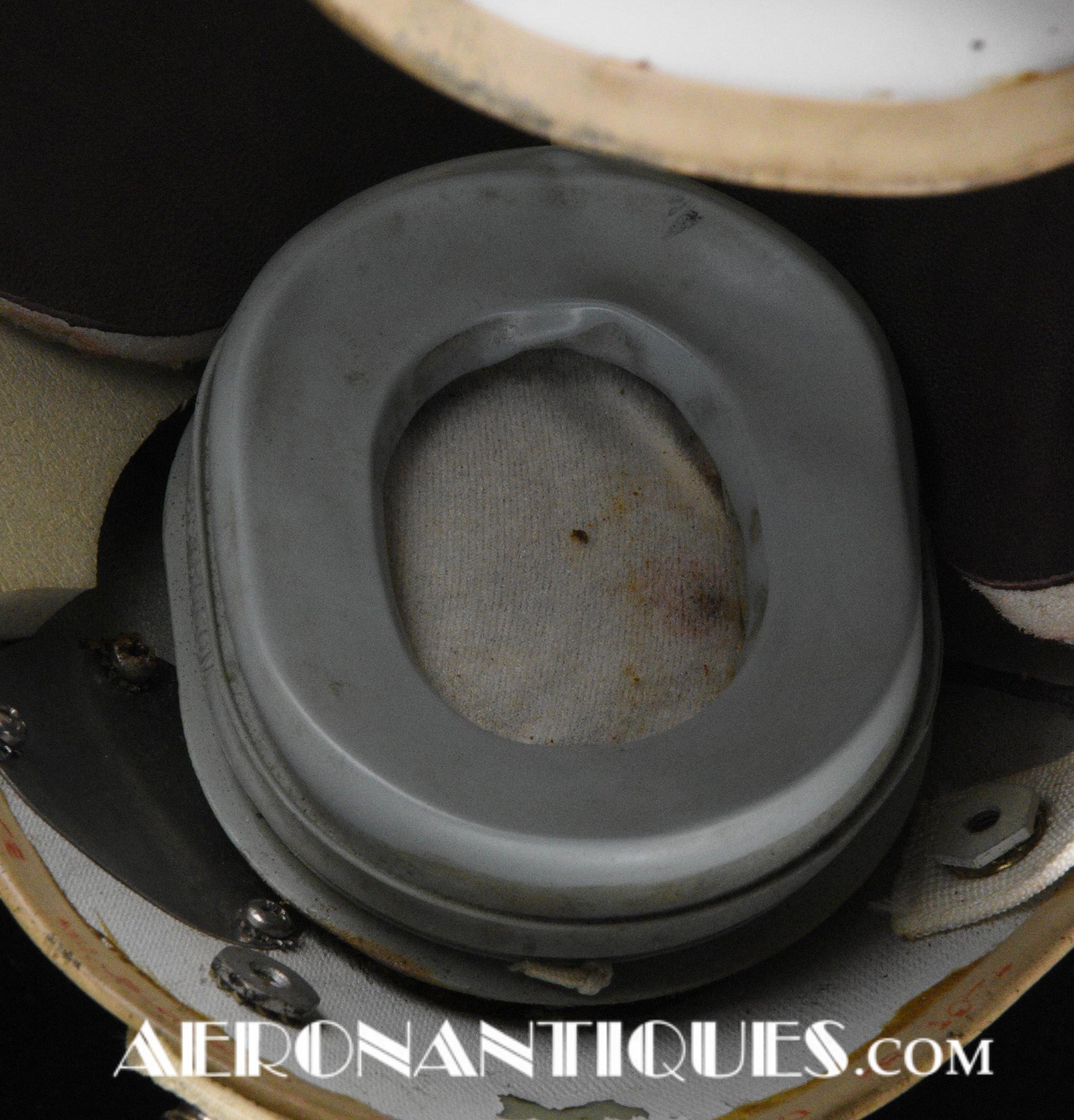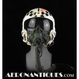 Early 80's 113th Tactical Fighter Squadron era HGU-2A/P US Air Force flight helmet, complete with avionics, size LARGE. Single tinted visor has been customized with unit's black and white checkerboard stripes made of reflective tape with red/orange kill stars also made from reflective tape. Head lining made of leather covered foam pads. Matching MBU-5 oxygen mask made by SCOTT, size REGULAR-NARROW, dated 1983 with offset bayonets with a rare free of cracks hardshell. Also included is the original carrying bag. Nice matching set, former property of a Weapons System Operator on McDonnell Douglas F-4E Phantom II. Display head included.