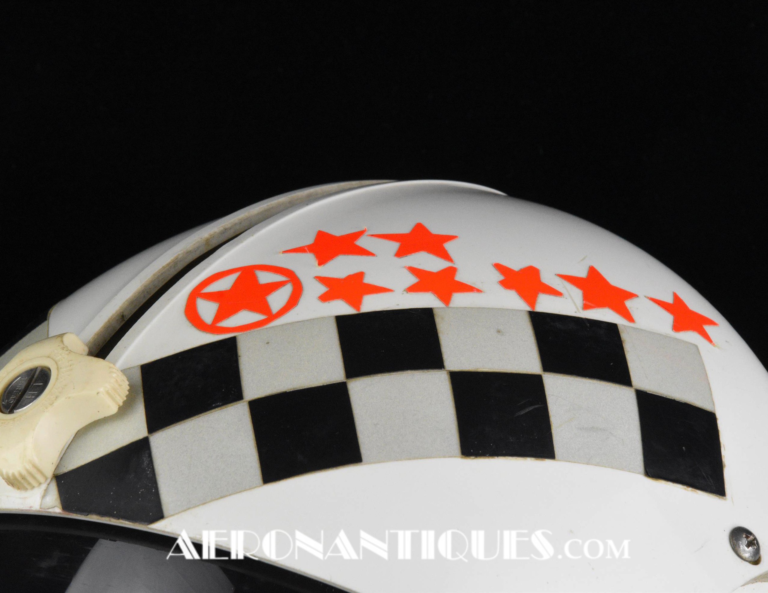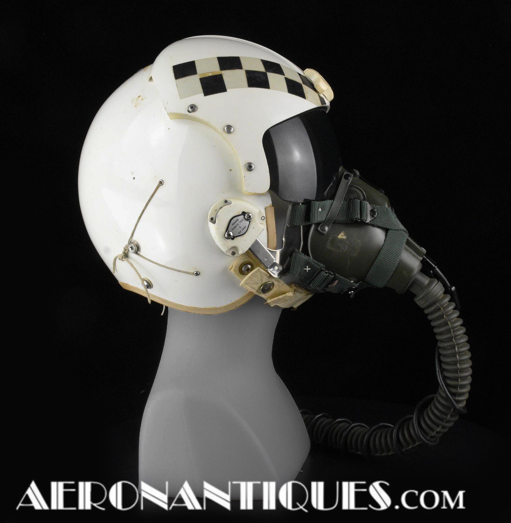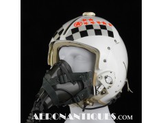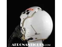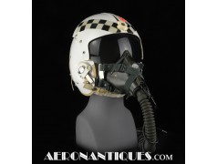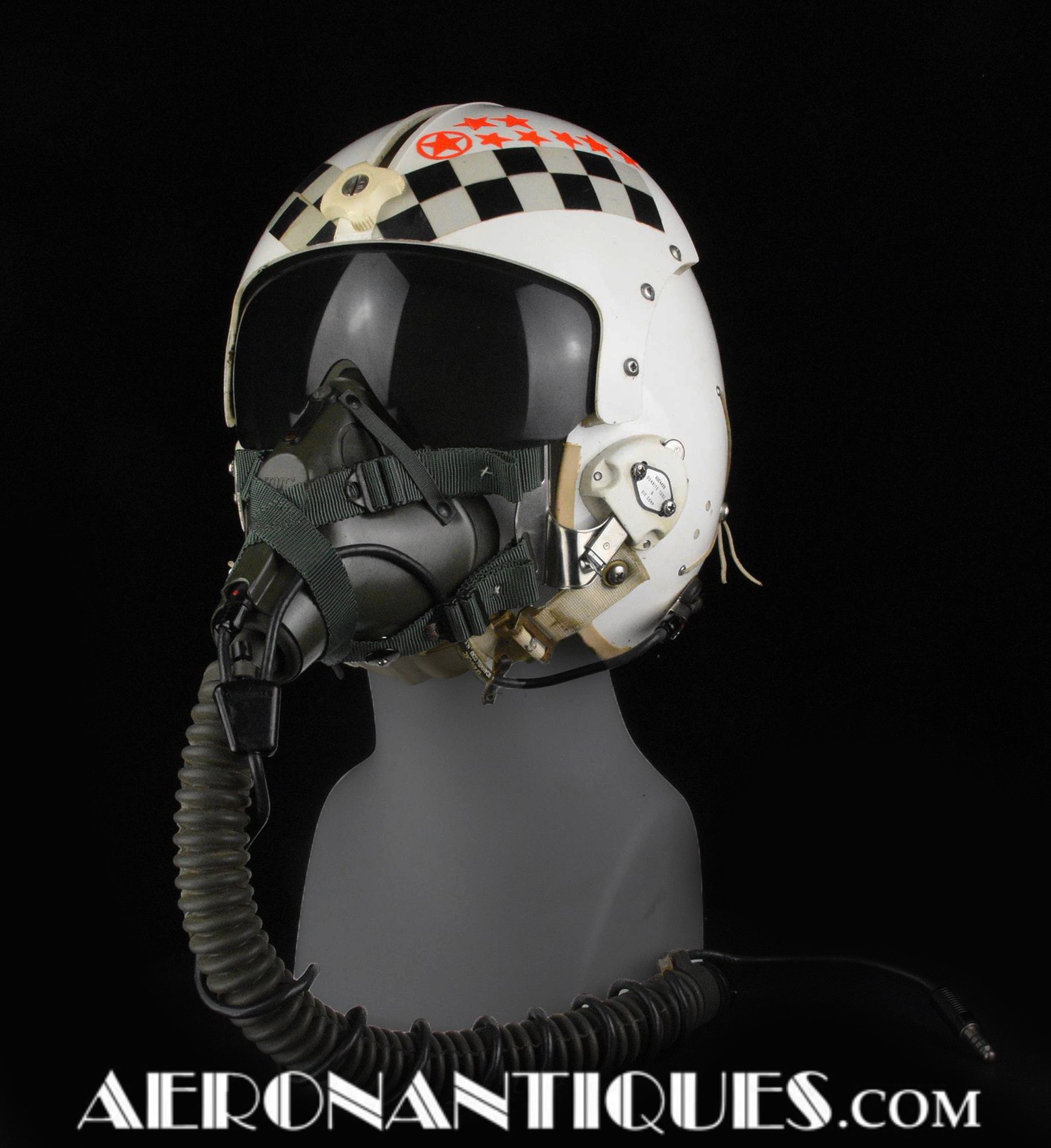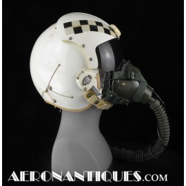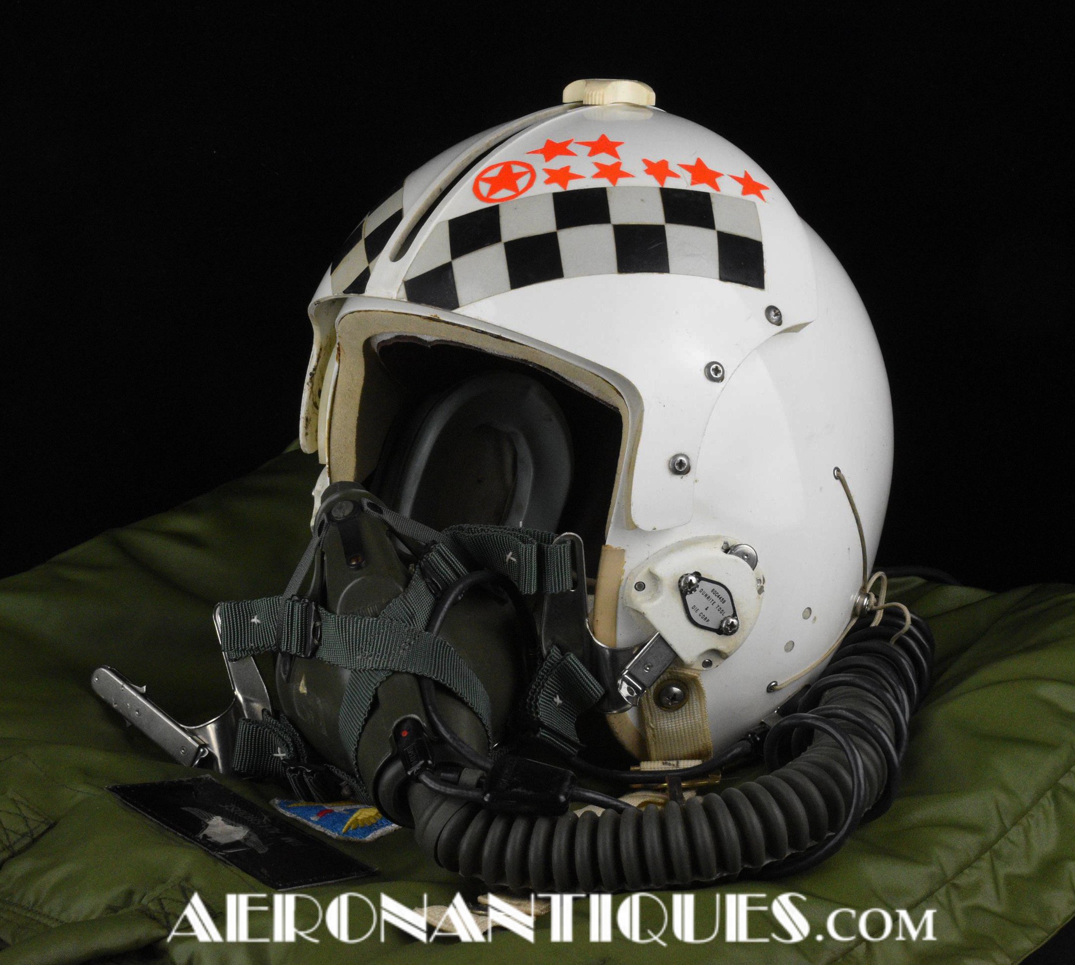 Early 80's 113th Tactical Fighter Squadron era HGU-2A/P US Air Force flight helmet, complete with avionics, size LARGE. Single tinted visor has been customized with unit's black and white checkerboard stripes made of reflective tape with red/orange kill stars also made from reflective tape. Head lining made of leather covered foam pads. Matching MBU-5 oxygen mask made by SCOTT, size REGULAR-NARROW, dated 1983 with offset bayonets with a rare free of cracks hardshell. Also included is the original carrying bag. Nice matching set, former property of a Weapons System Operator on McDonnell Douglas F-4E Phantom II. Display head included.