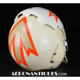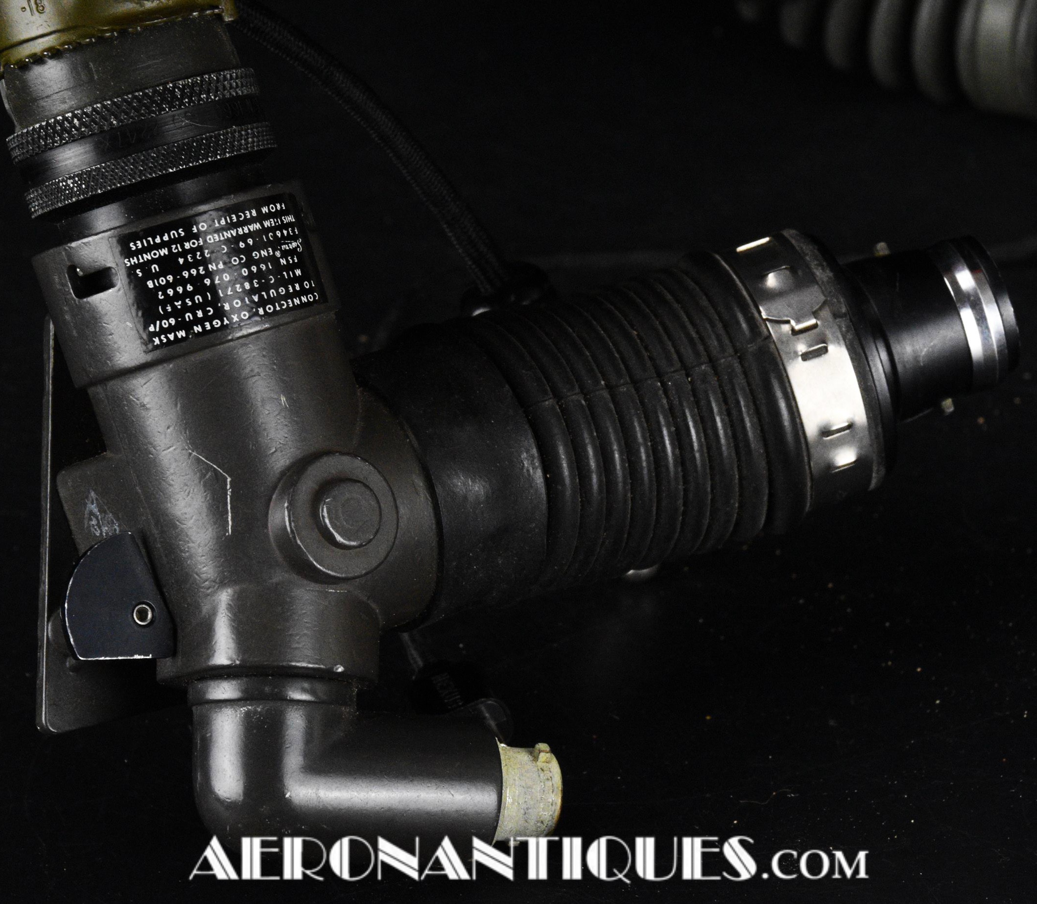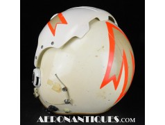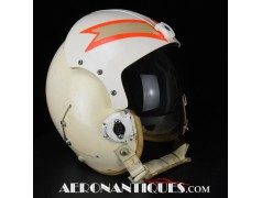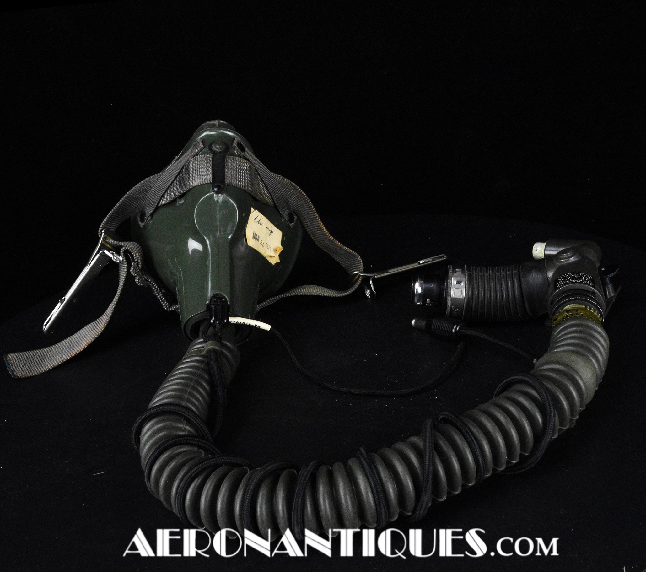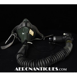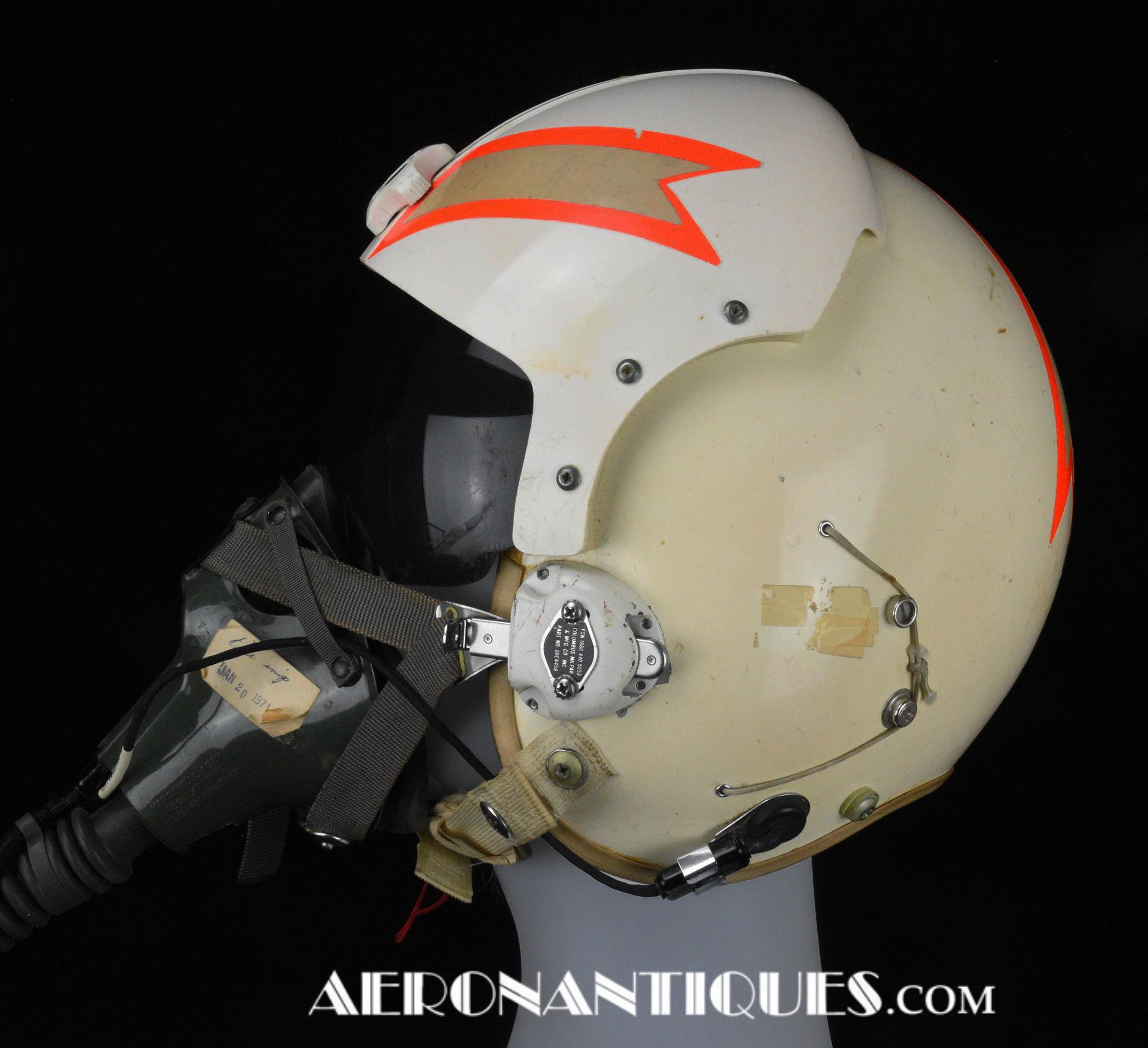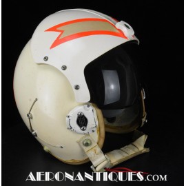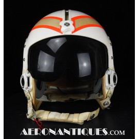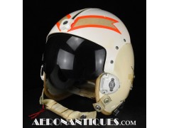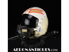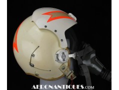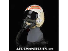Complete US Air Force jet pilot helmet and oxygen mask set, circa 1967-1970. The helmet is a large HGU-2A/P model, complete with its H-154 AIC earphones with adjustable mounts and a microphone plug for the oxygen mask. The visor cover and the helmet shell have been originally covered with regulation white and orange reflective tape. The oxygen mask is a Sierra MBU-5 model, dated 1967, regular-wide size, equipped with a microphone, cord and plug, and straight bayonet fittings. It is completed by its 1969 CRU-60/P connector, allowing connection of the emergency oxygen supply and the aircraft's oxygen circulation system to the mask. A complete, matching set from the Vietnam War era, in superb condition. The display stand is included.