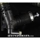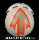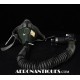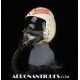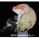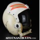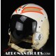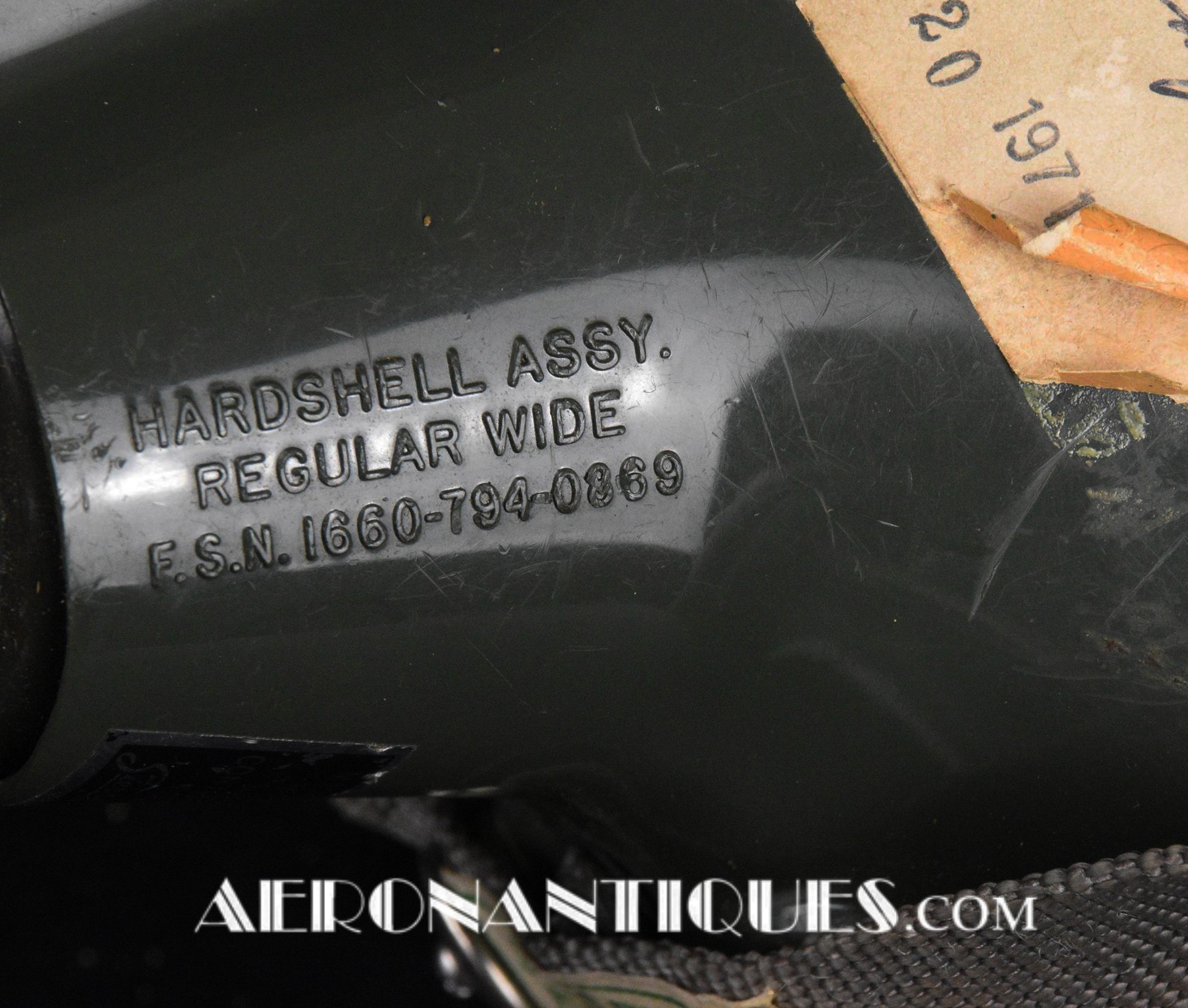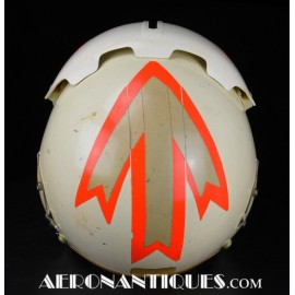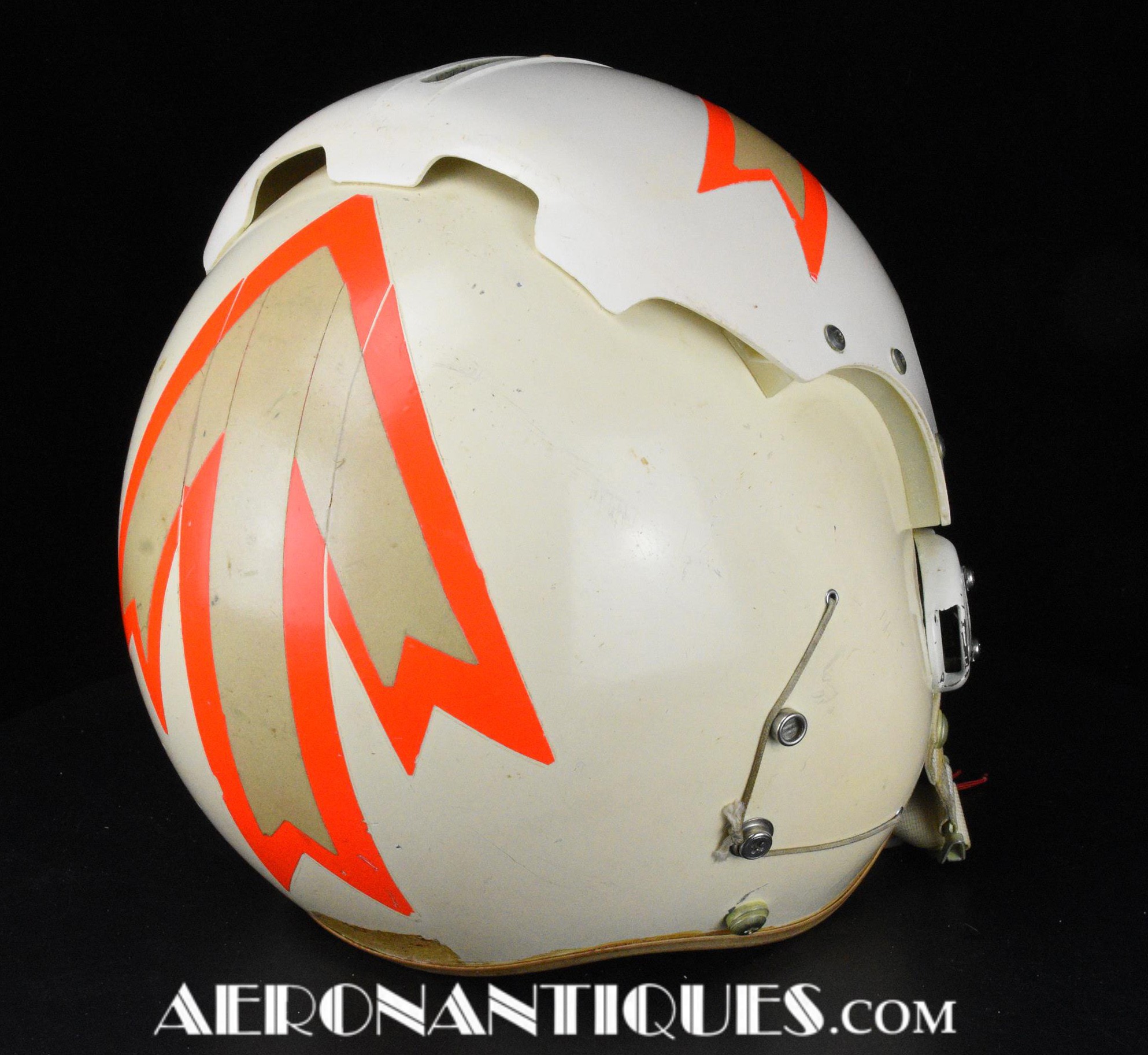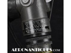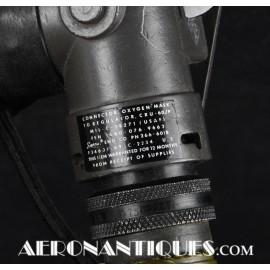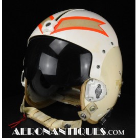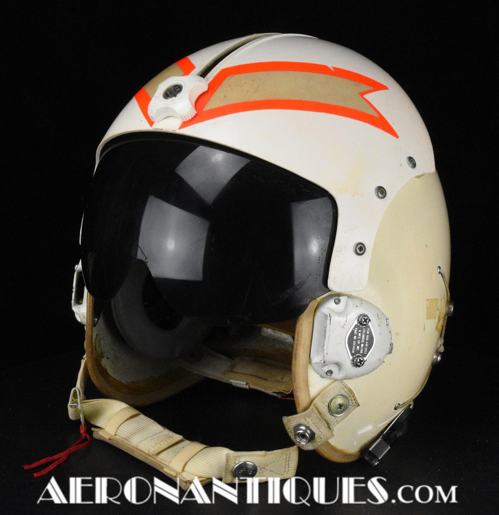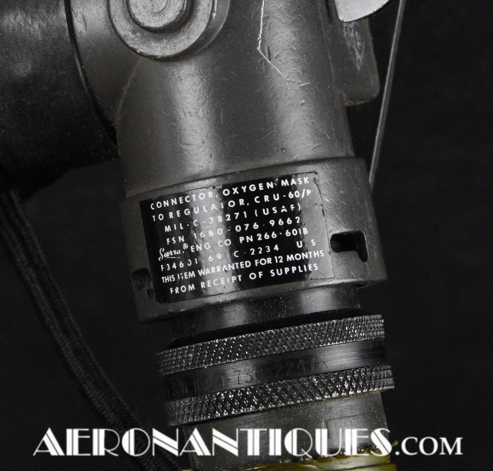Complete US Air Force jet pilot helmet and oxygen mask set, circa 1967-1970. The helmet is a large HGU-2A/P model, complete with its H-154 AIC earphones with adjustable mounts and a microphone plug for the oxygen mask. The visor cover and the helmet shell have been originally covered with regulation white and orange reflective tape. The oxygen mask is a Sierra MBU-5 model, dated 1967, regular-wide size, equipped with a microphone, cord and plug, and straight bayonet fittings. It is completed by its 1969 CRU-60/P connector, allowing connection of the emergency oxygen supply and the aircraft's oxygen circulation system to the mask. A complete, matching set from the Vietnam War era, in superb condition. The display stand is included.