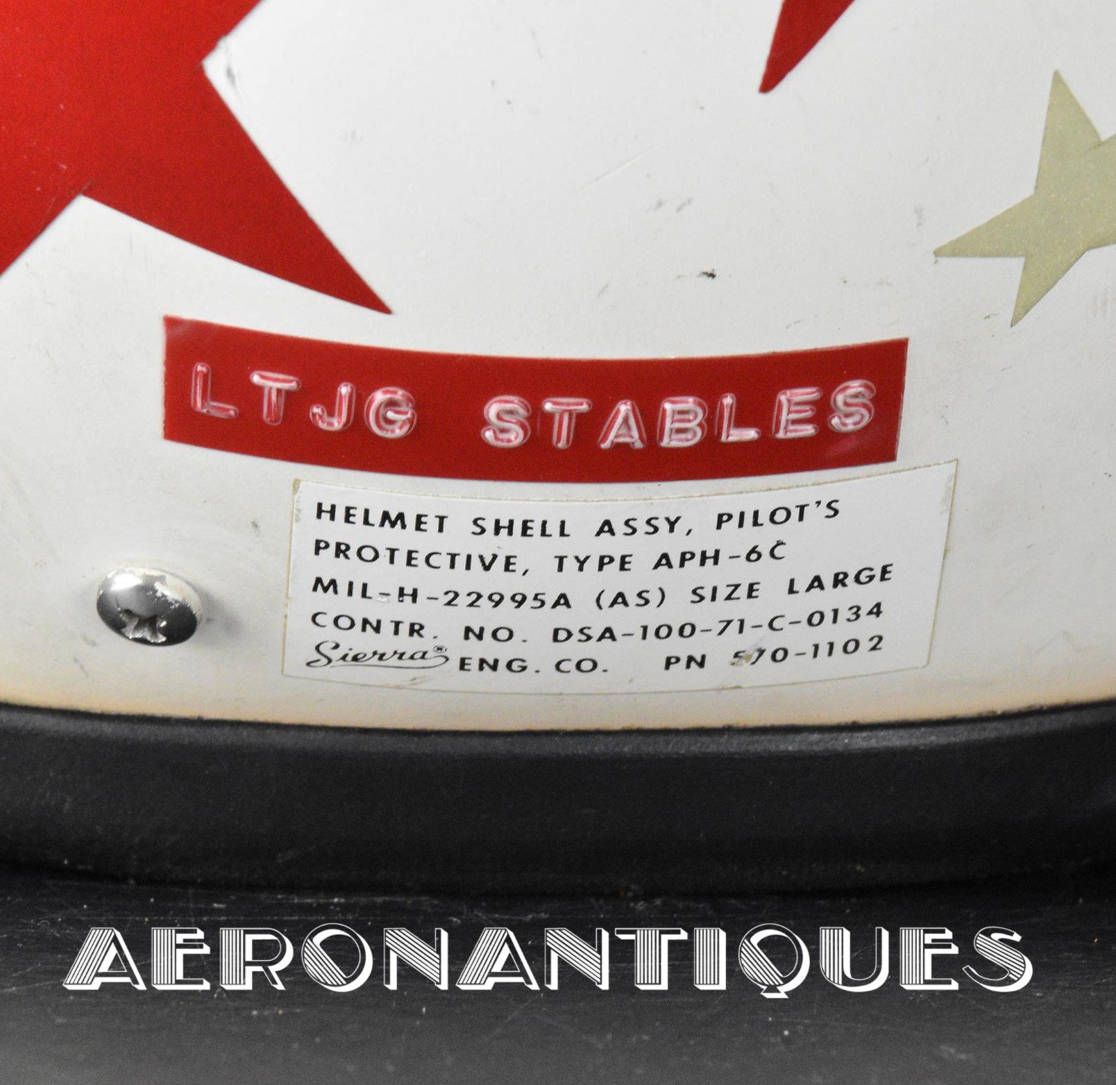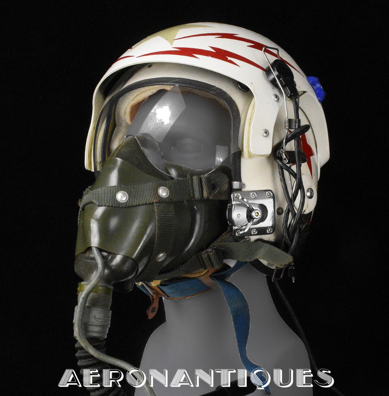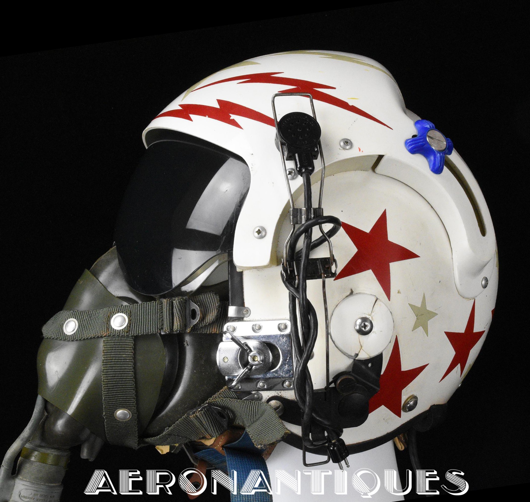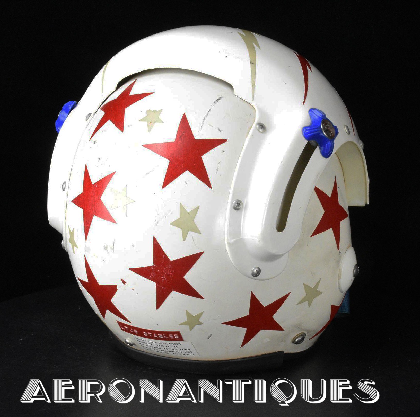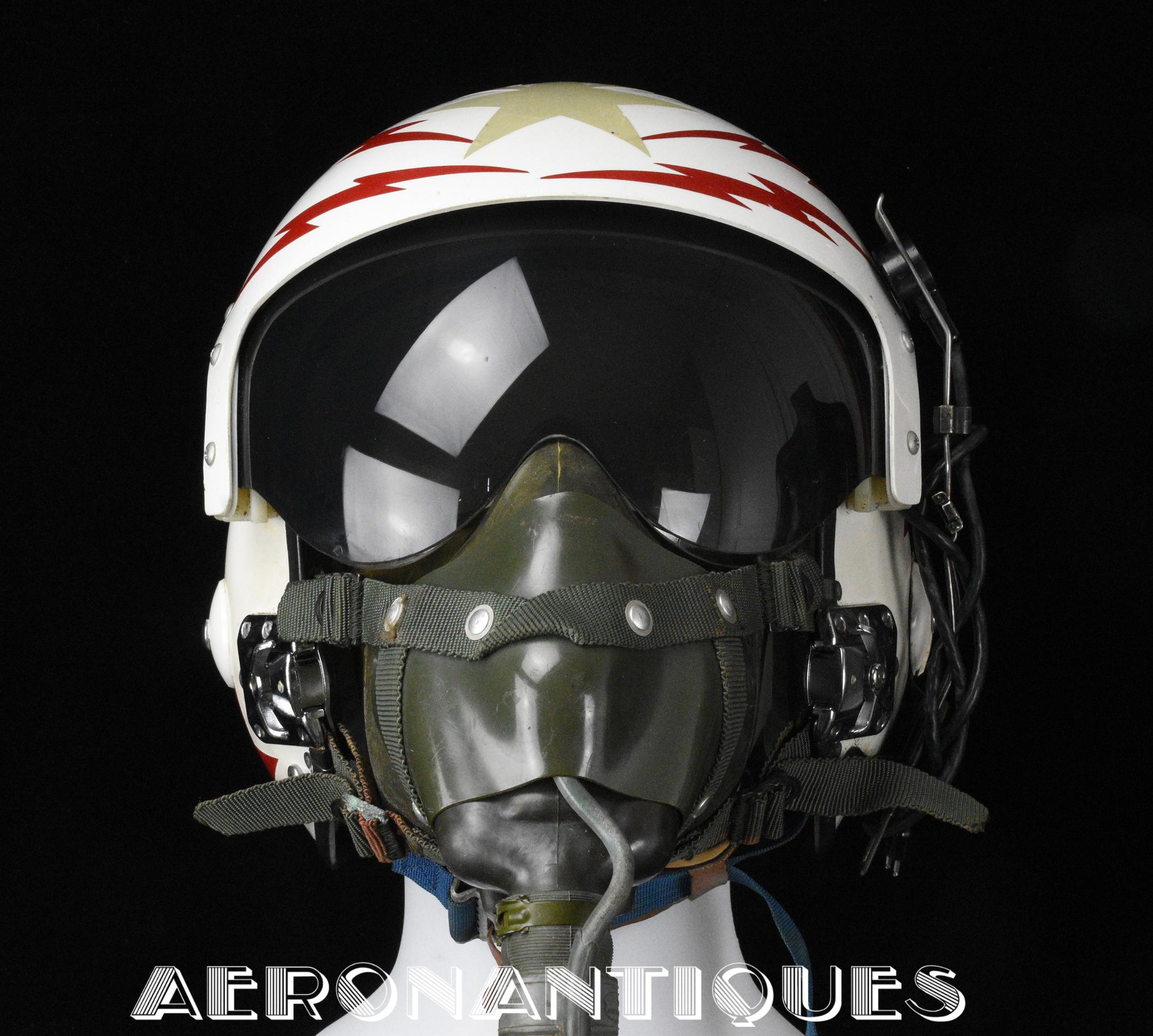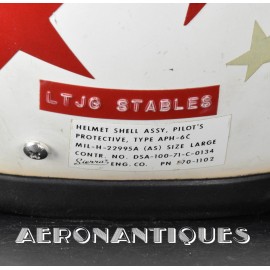 Vietnam era APH-6C US Navy pilots helmet and A-13A oxygen mask set issued to a US Navy pilot. 1971 dated APH-6C helmet made by SIERRA is complete with avionics and leather cushion pads. Double tinted and clear visors. Lightning bolts and stars shaped reflective adhesive tape on shell and visors housing. Boom mic. Size LARGE. Matching A13-A/MS-22001 oxygen mask made by SIERRA dated 1968. Size LARGE. MC-3/A connector. Hardman hardshell with butterfly fasteners. Excellent condition. Display is included.