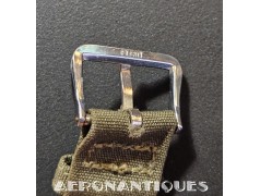 WWII US Navy pilot type A-11 wristwatch, made by ELGIN. 34 mm diameter including the crown. Runs great with 36 hrs reserve. Circa 1942 16 jewels grade 539 mechanical winding movement with setting/winding crown at 3 o'clock. Hacking function. Nickel plated steel case. R-88-W-800 US Navy reference number. Original OD#7 cotton bracelet with nickel plated buckle stamped ELGIN. Perfect to complete a pilot mannequin display or simply wear.