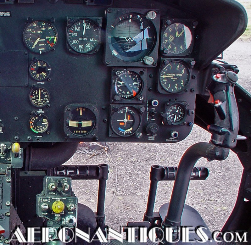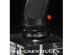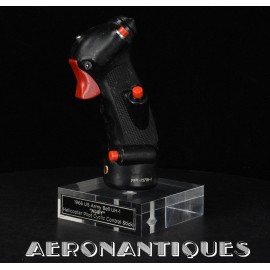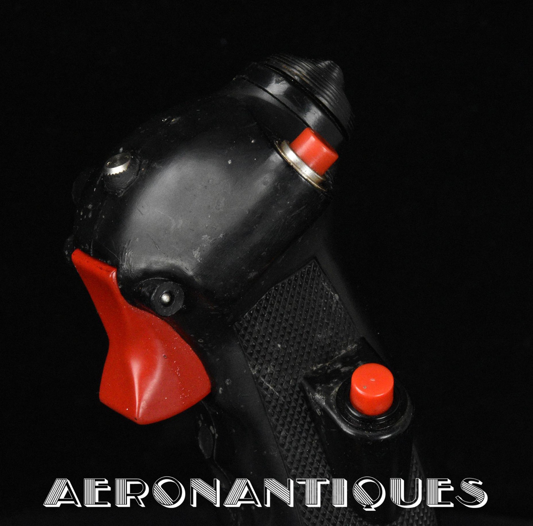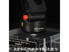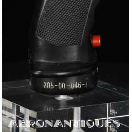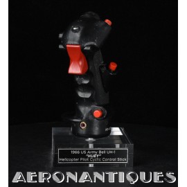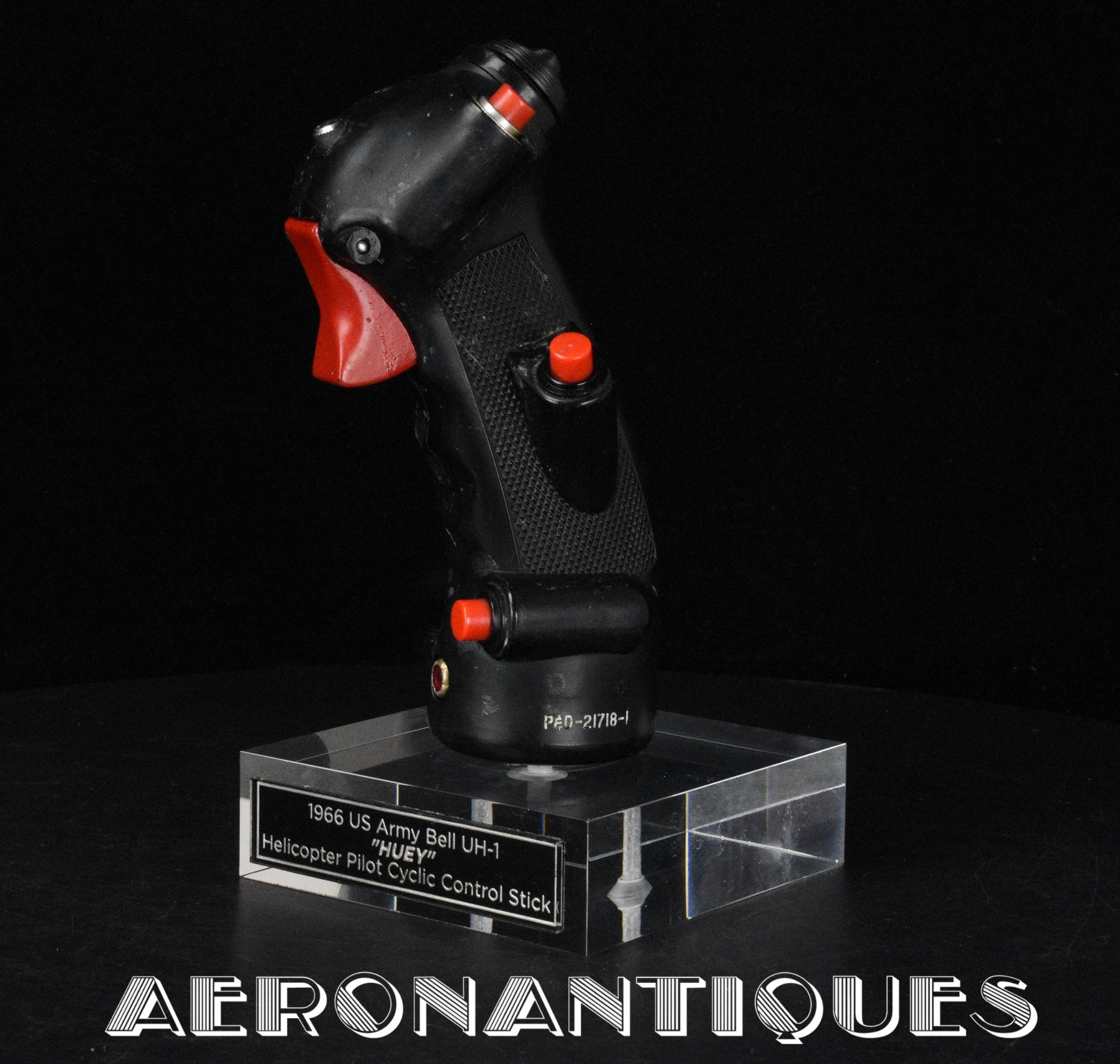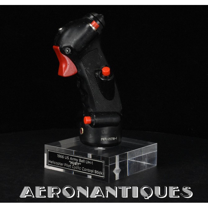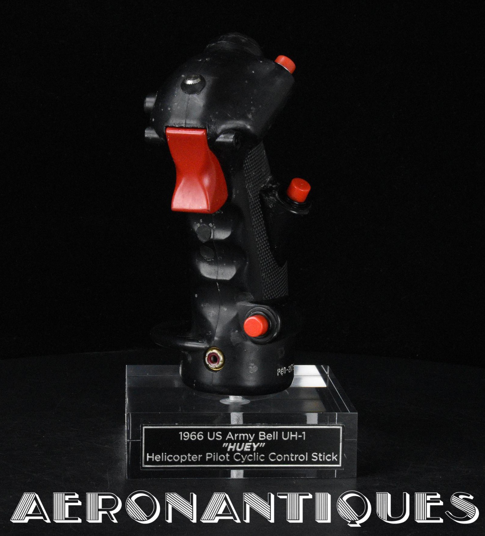 US Army Bell UH-1 Huey helicopter cyclic control stick. BELL part number 205-001-046-1. Complete with all buttons clicking. Displayed on a plexiglass base. A beautiful and evocative decorative piece representing this iconic Vietnam War helicopter. Rare.