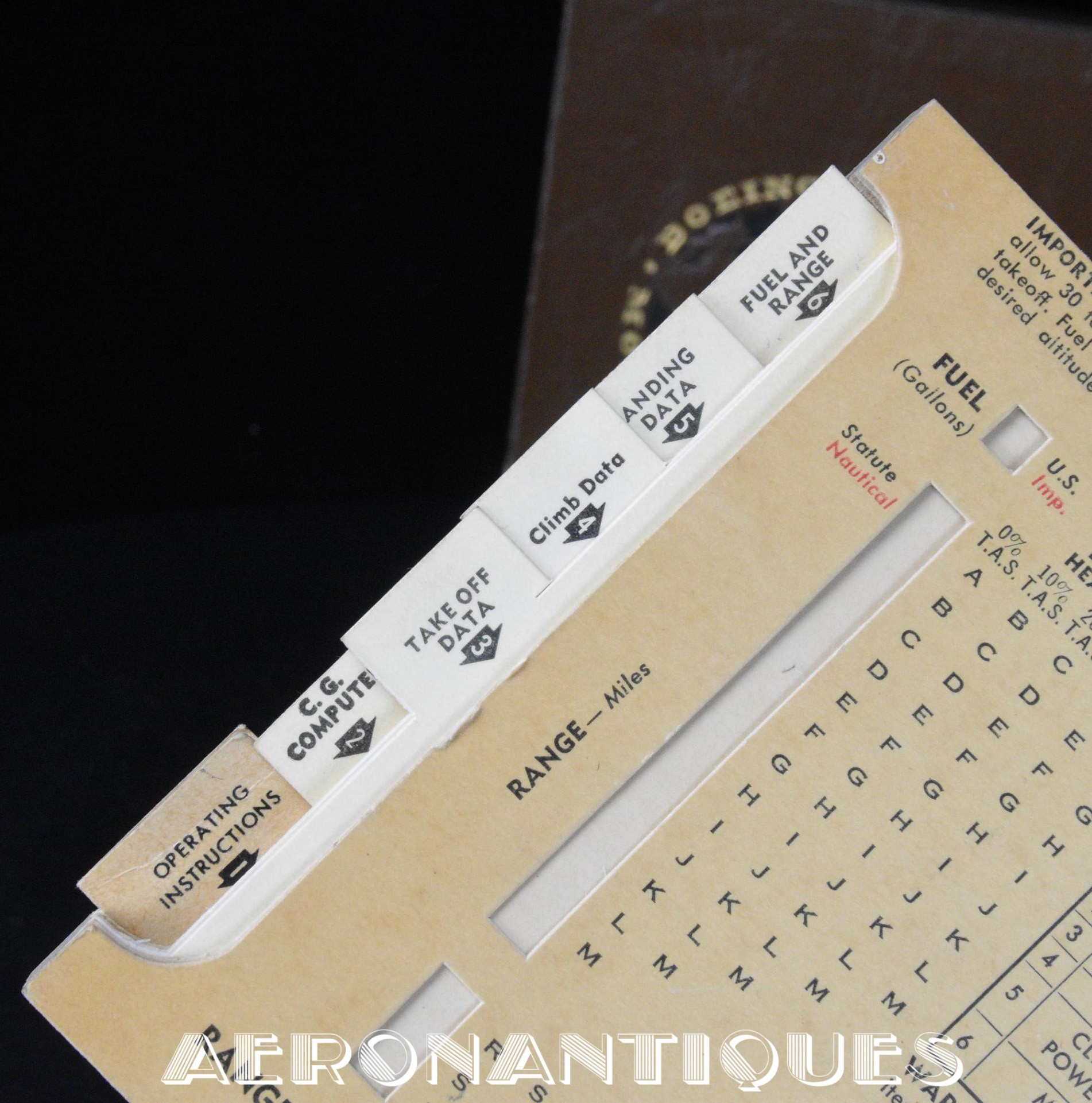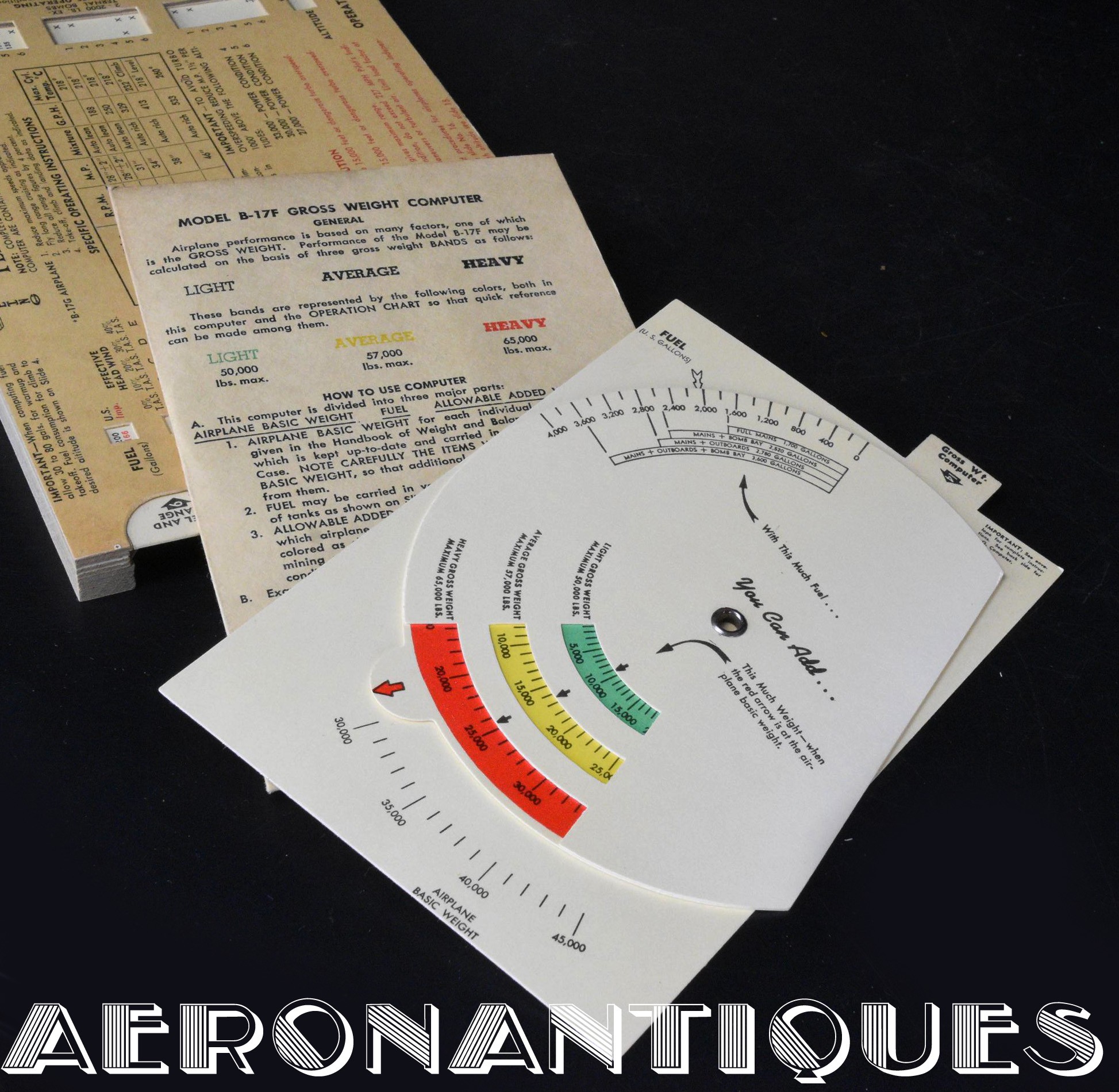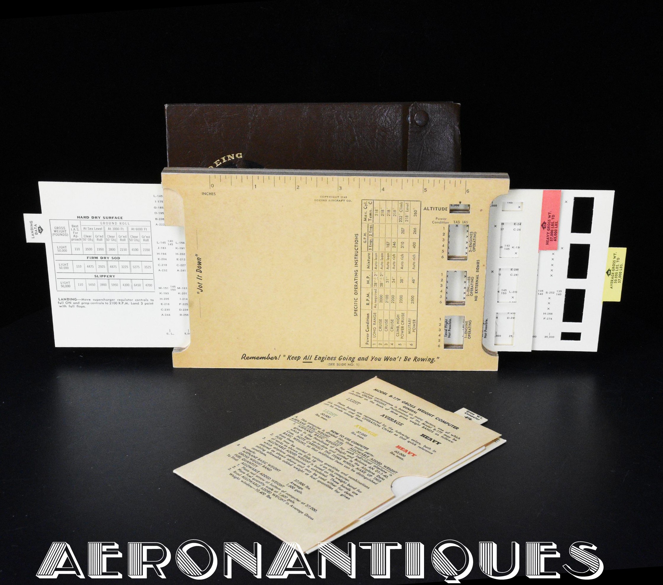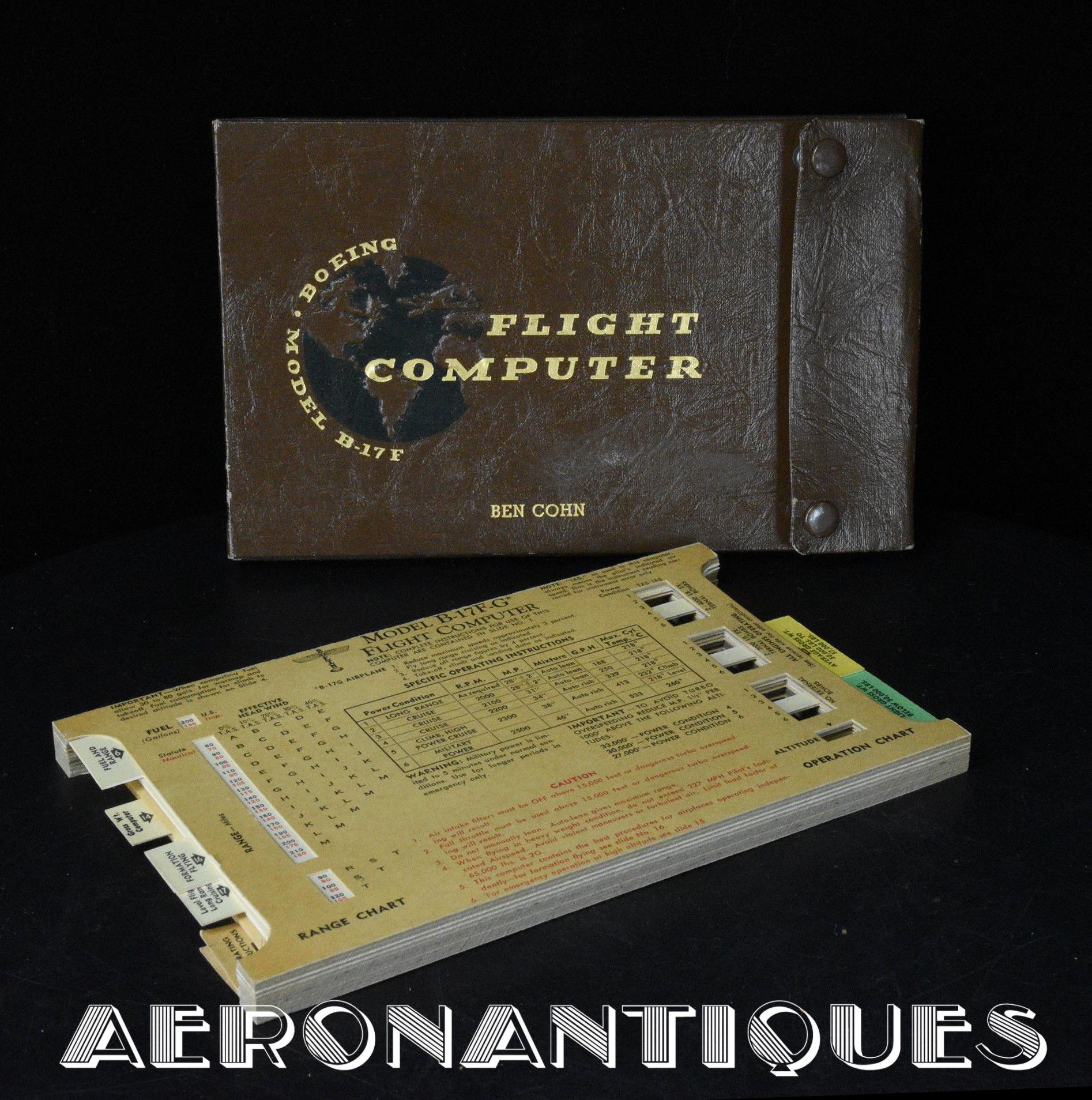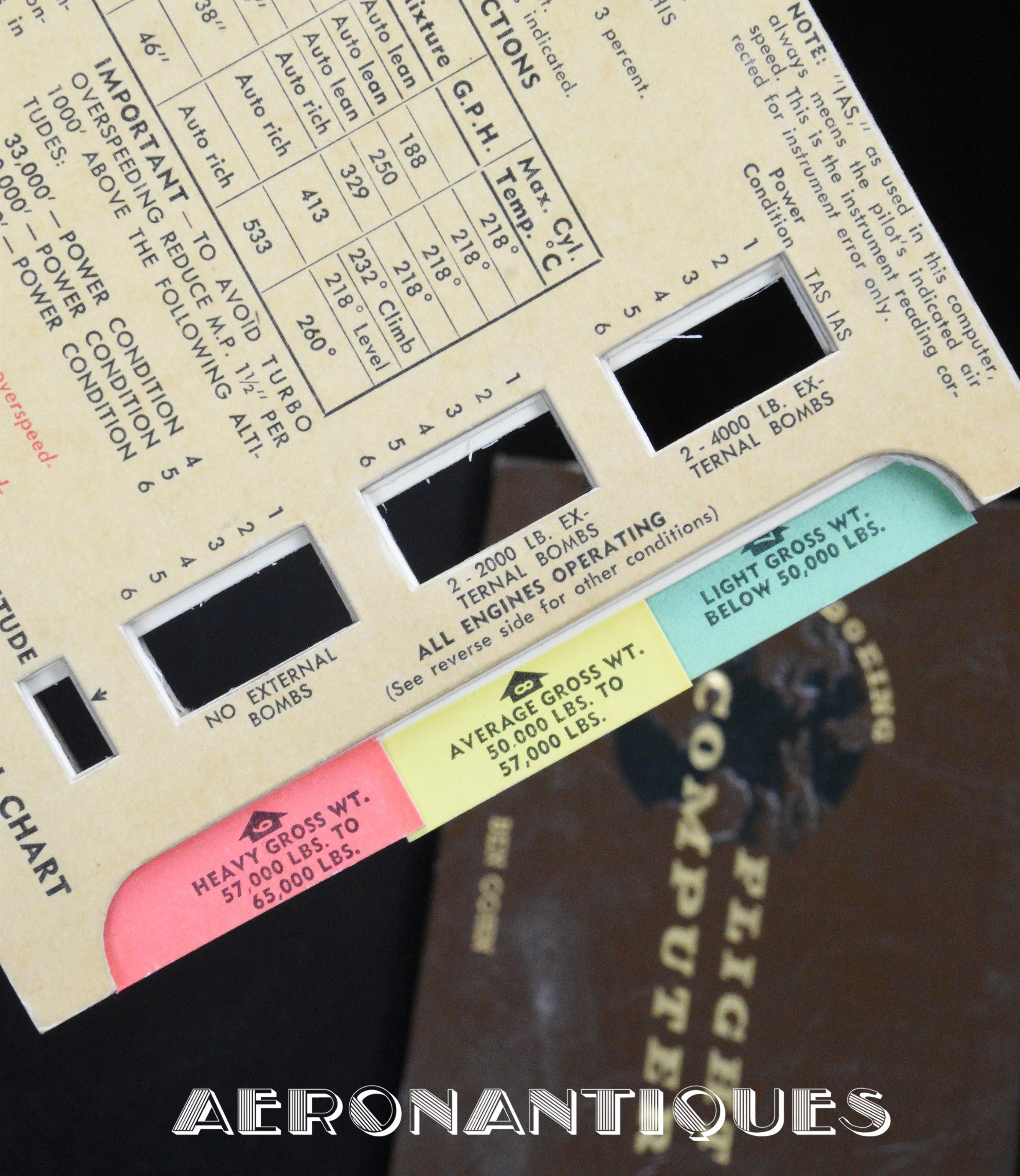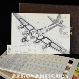 outstanding and rare flight computer for Boeing B-17 versions F & G "Flying Fortress" bomber aircrafts. Dated 1943. Complete with its original carrying case. 6 sliding formula cards and 18 numbered tabs. A weight calculation disc and a flight instruction booklet.A must for any lover of this iconic WWII US Army Air Force Bomber. Dimensions: 210 mm x 130 mm x 20 mm