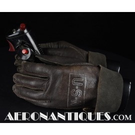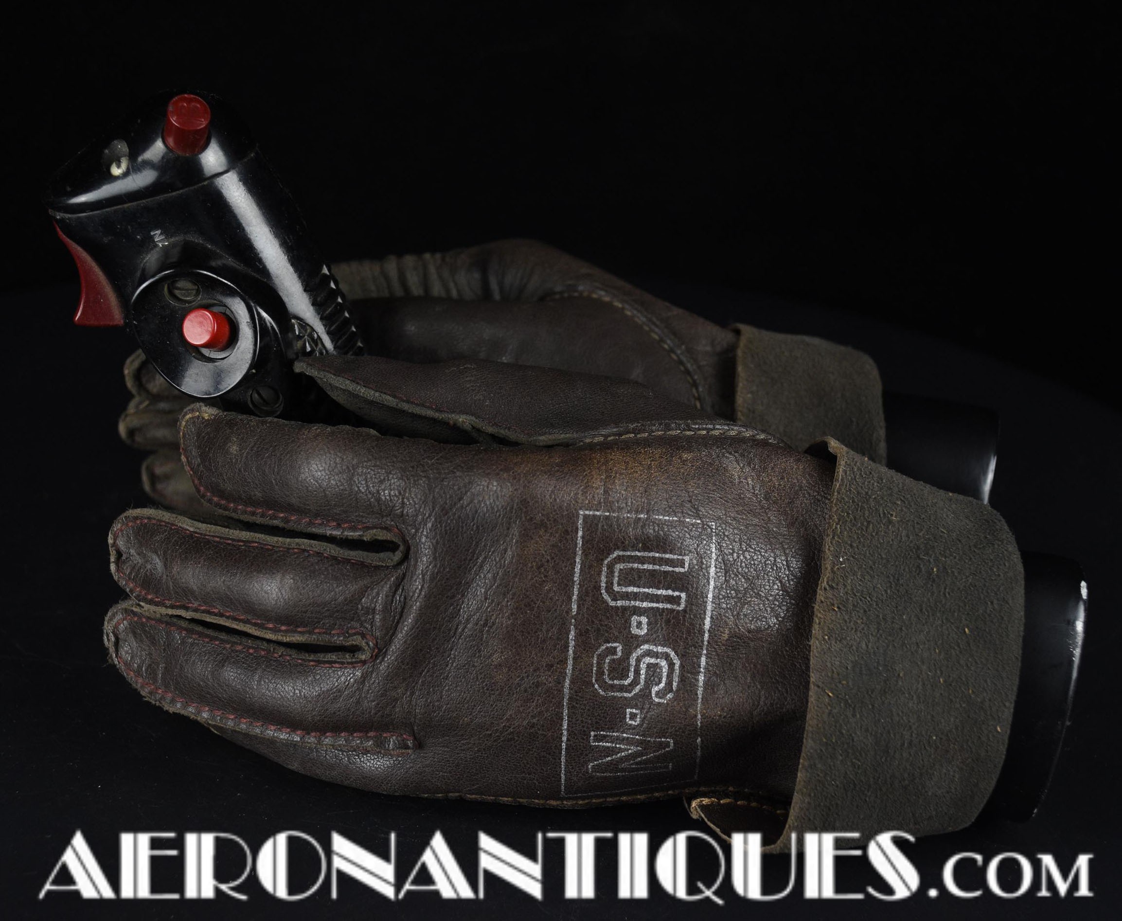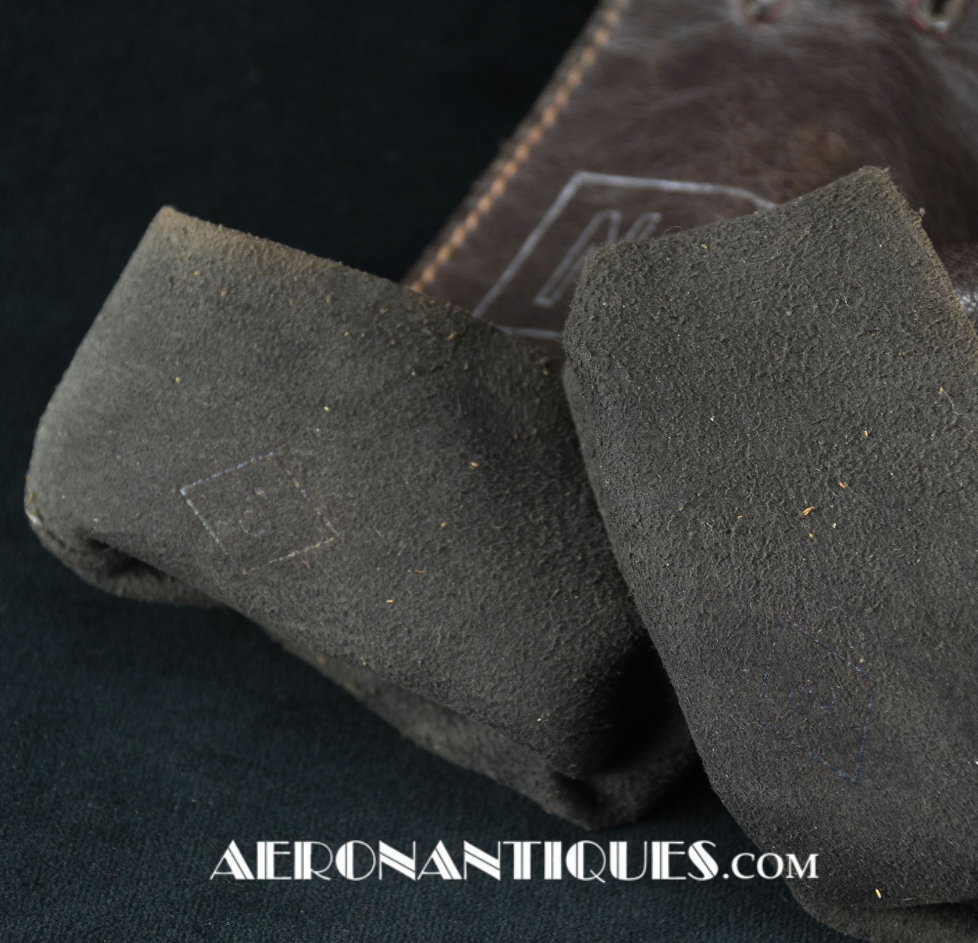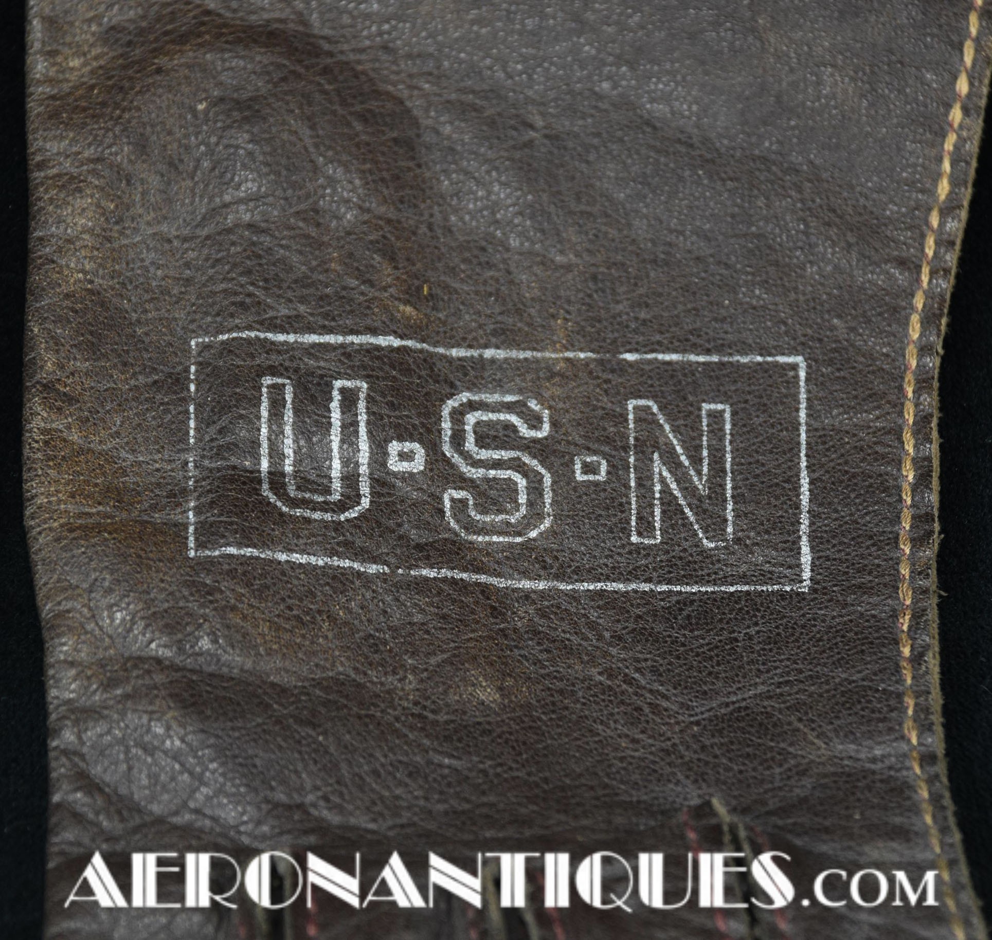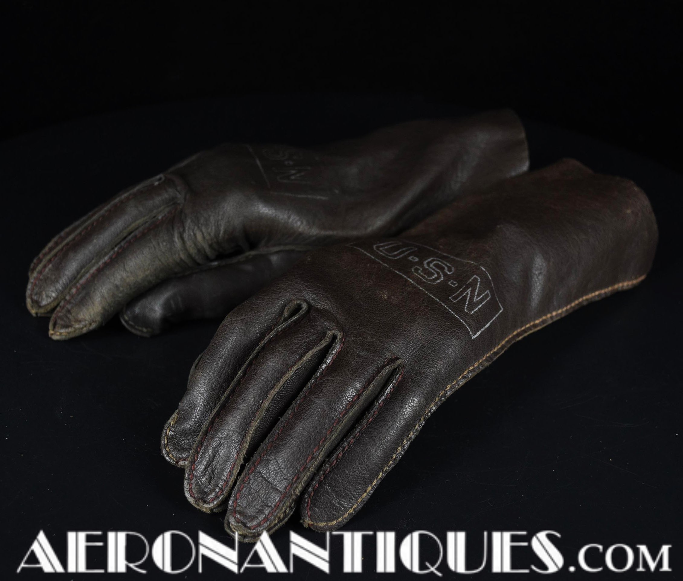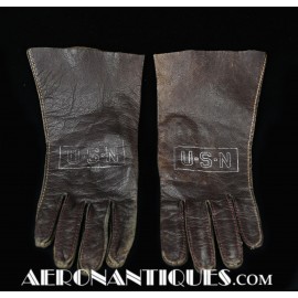 WWII US Navy pilot brown leather summer flying gloves. Size 9. Stamped "U.S.N" in silver letters framed in a cartouche on front (post war examples don't have the cartouche framing the letters).