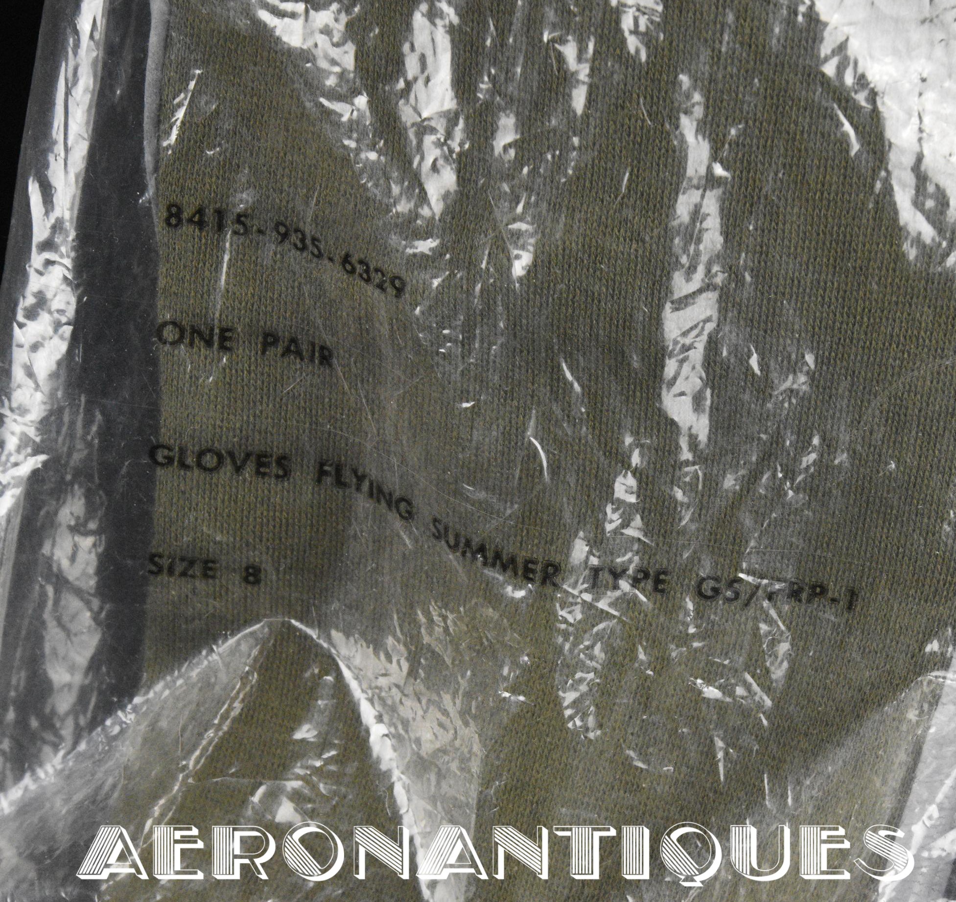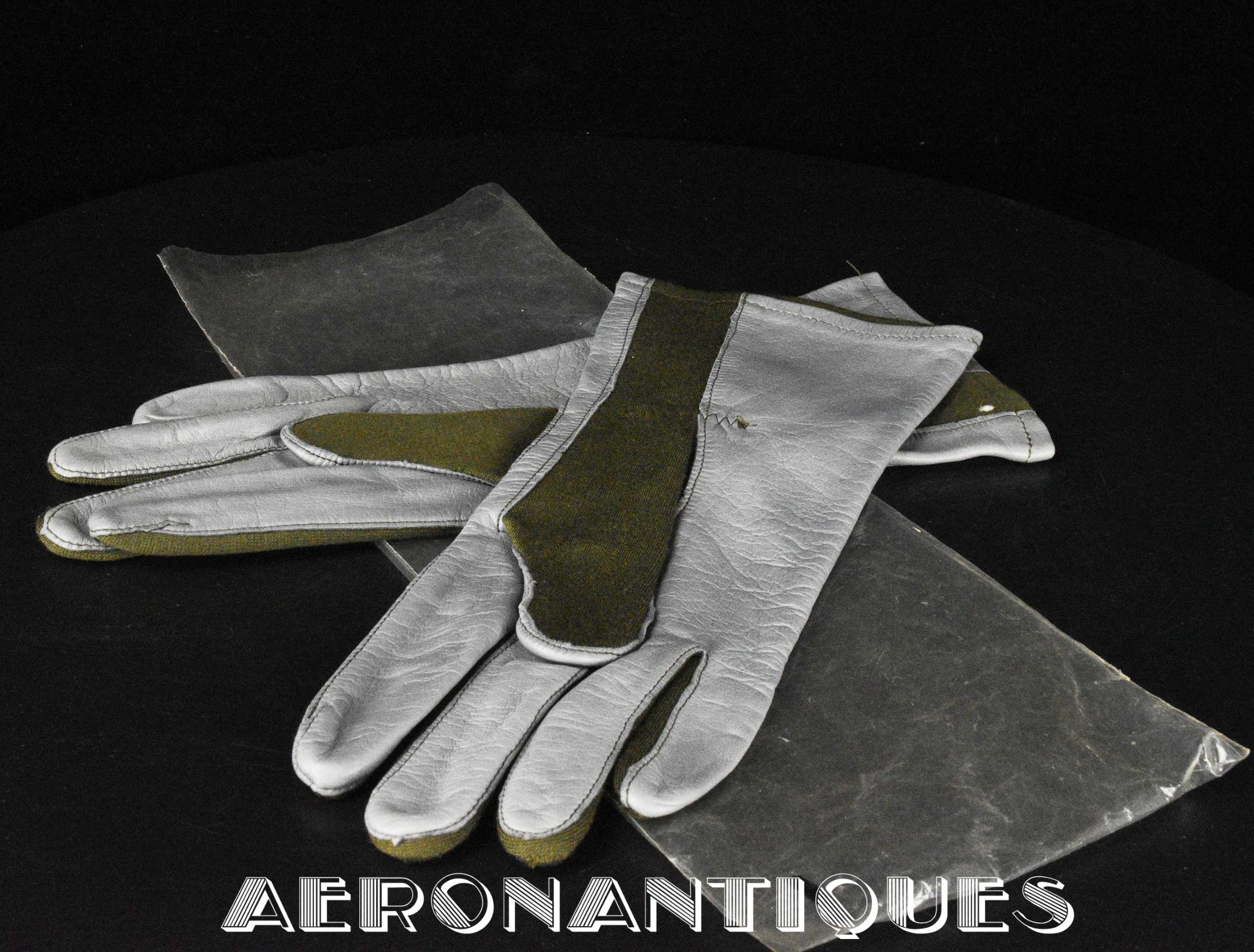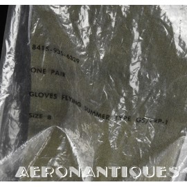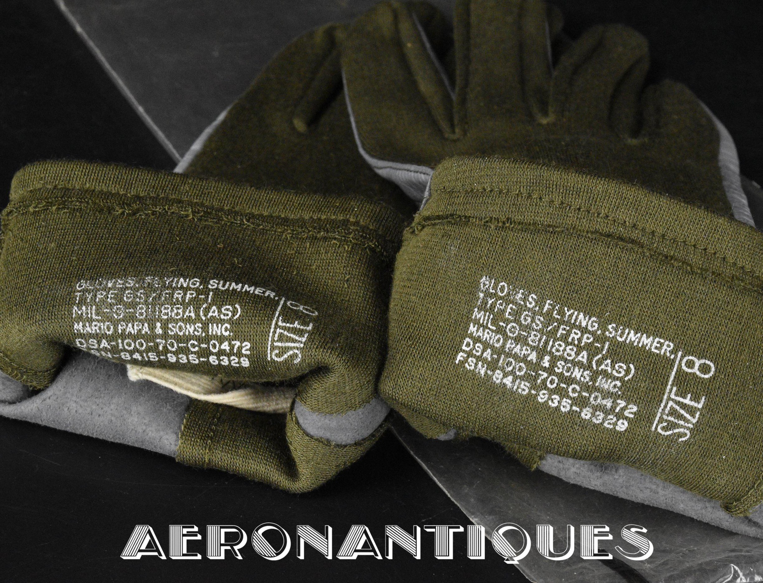 US Navy or Air Force pilot flying gloves type FRP-1 dated 1970, made by MARIO PAPA & SONS. Made of fire retardant Nomex fabric with leather palm. Size 8. Mint condition with original packing. Mandatory for Air Force and Navy flyers from the end of the 60's, they will supersede the tradtional leather B3-A flying gloves. Scarce item to find with a Vietnam era matching manufacturing date, also issued to US Army helicopter pilots.