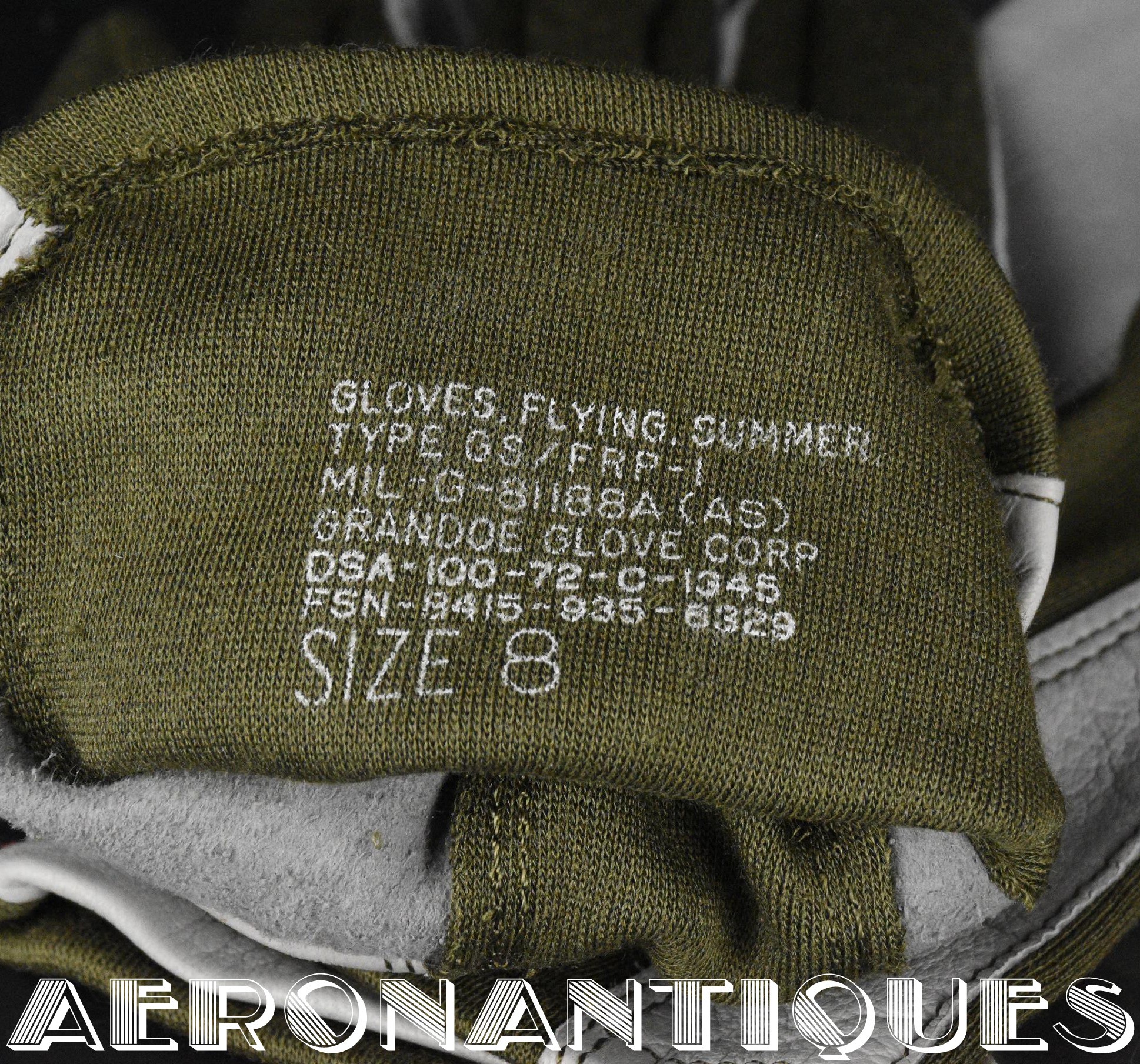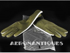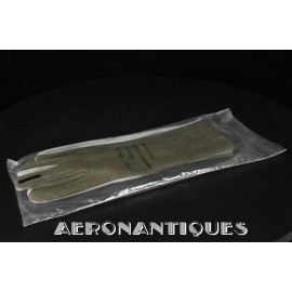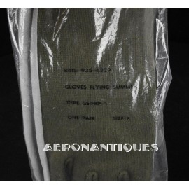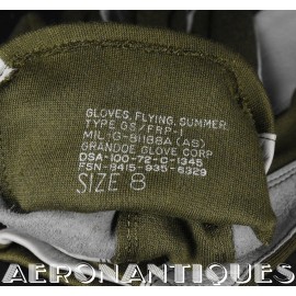 US Navy or Air Force pilot flying gloves type FRP-1 dated 1972, made by GRANDOE GLOVE CORP. Made of fire retardant Nomex fabric with leather palm. Size 8. Mint condition with original packing. Mandatory for Air Force and Navy flyers from the end of the 60's, they will supersede the tradtional leather B3-A flying gloves. Scarce item to find with a Vietnam era matching manufacturing date, also issued to US Army helicopter pilots.