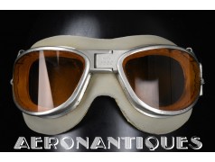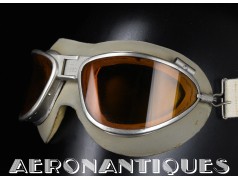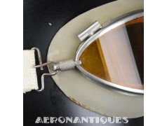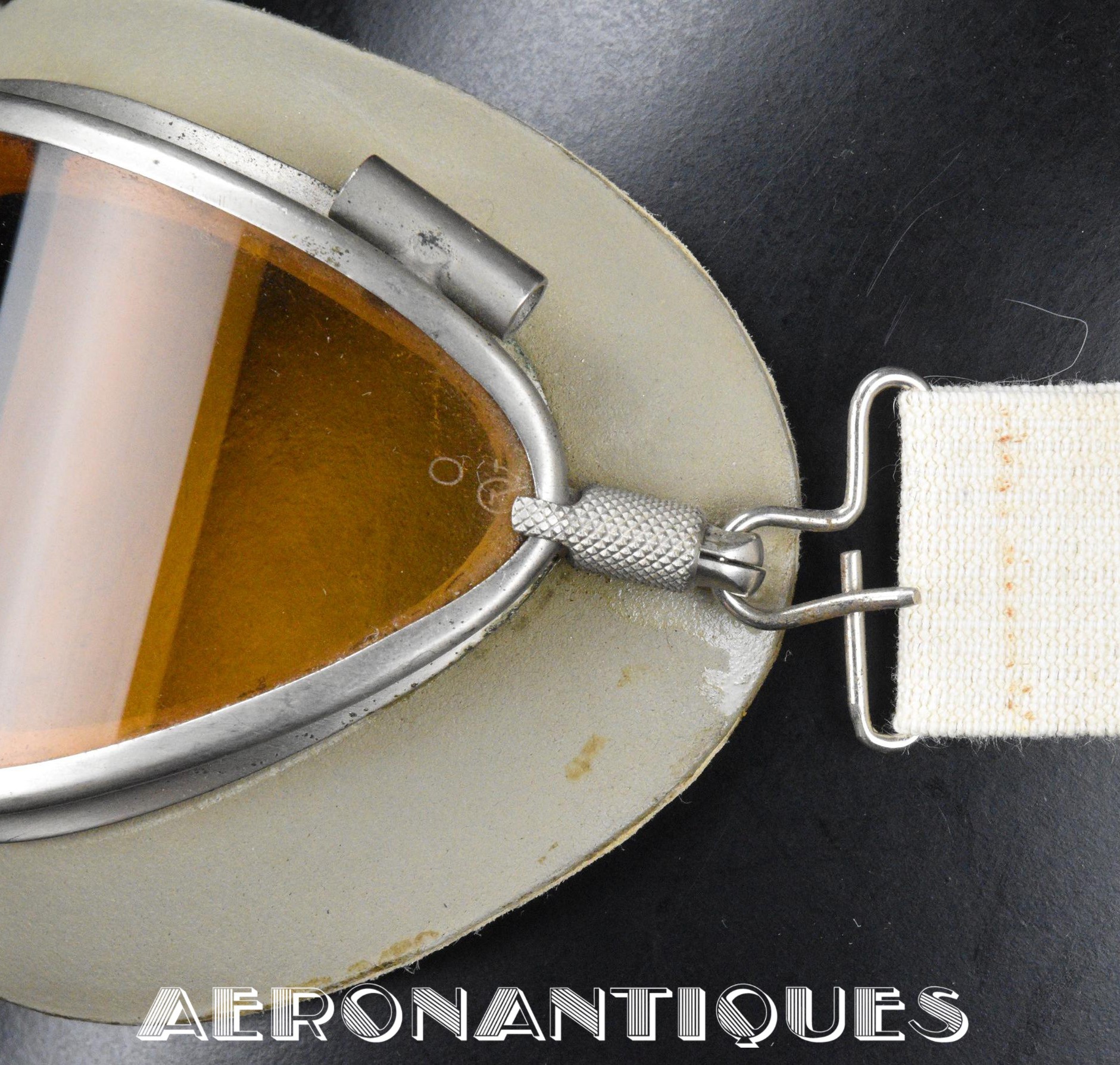 WWII US Army Air Force flying goggles AN-6530 type, one piece second pattern made by AMERICAN OPTICAL. Amber mineral glass lenses. grey rubber mask lined with chamois leather. White elastic headband with adjustment buckle. Rubber is pliable without any cracks.