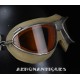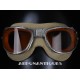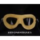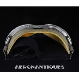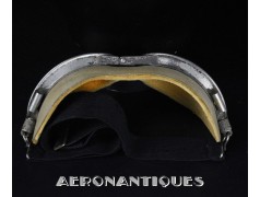 WWII US Army Air Force flying goggles AN-6530 type, one piece second pattern made by AMERICAN OPTICAL. Amber mineral glass lenses. Grey rubber mask lined with chamois leather. Rubber is free of cracks or tears. Black elastic headband with adjustment buckle.
