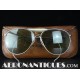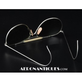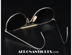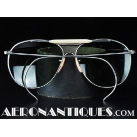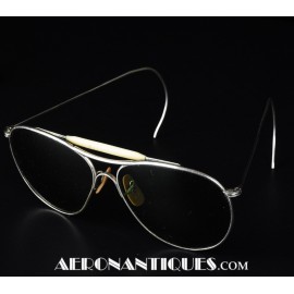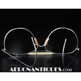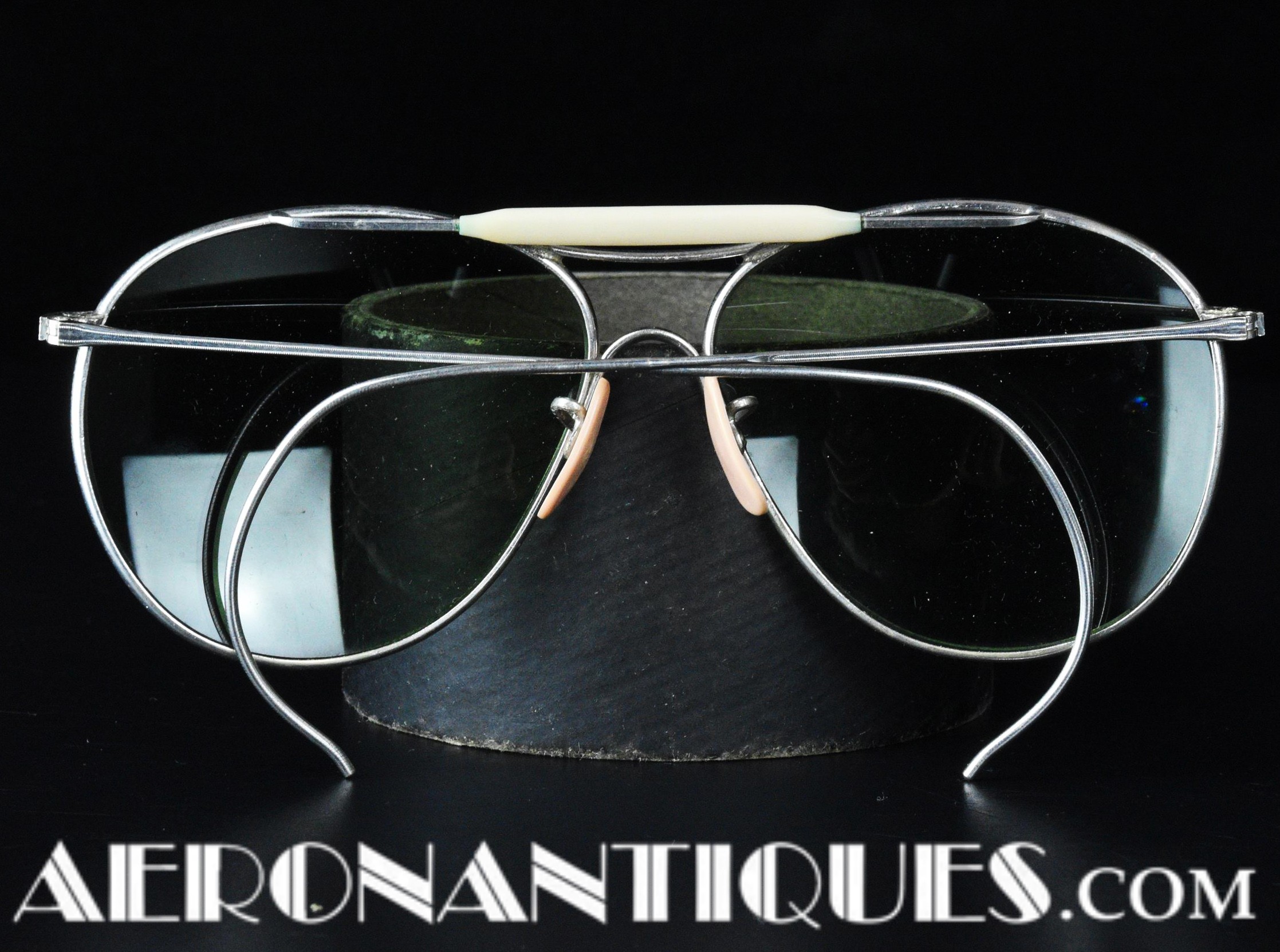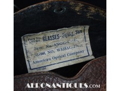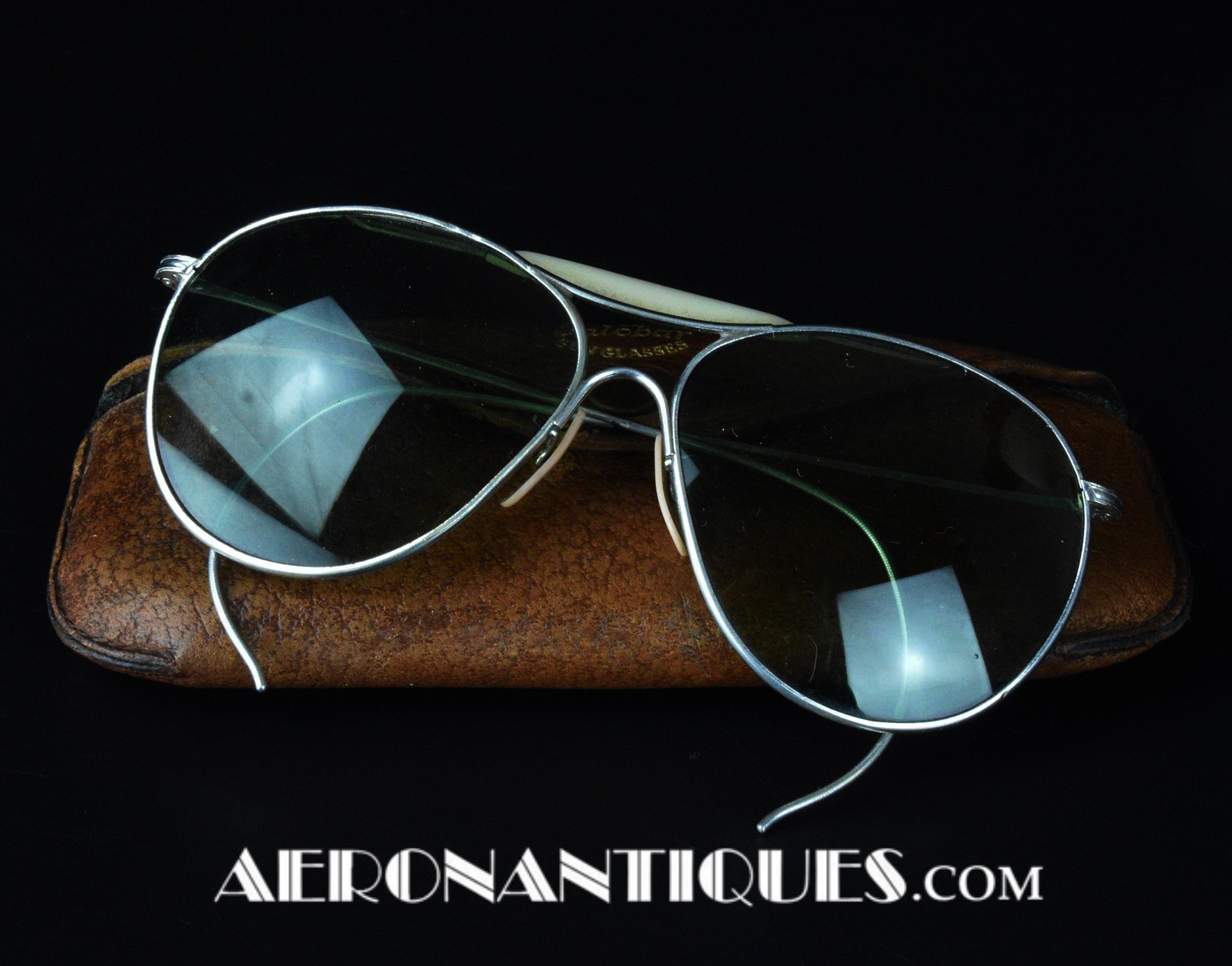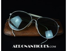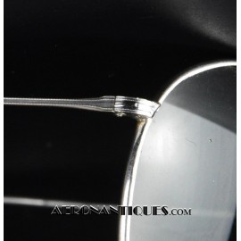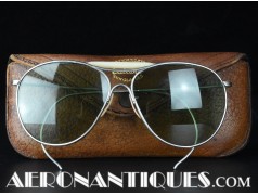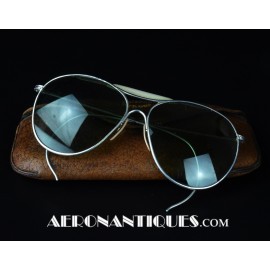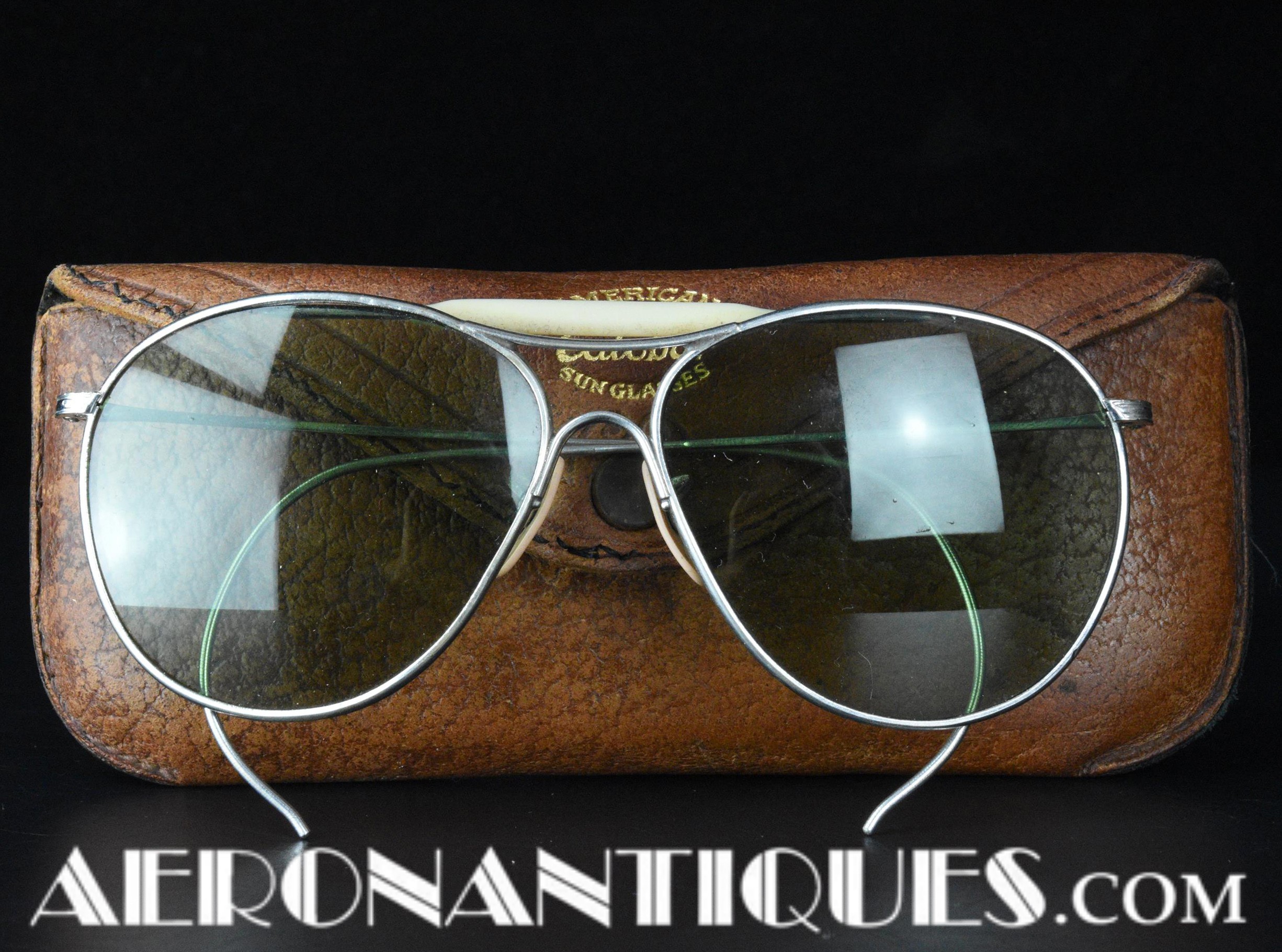 WWII US Army Air Force pilot AN-6531 flying sunglasses, made by American Optical, complete with matching leather caser, circa 1943-44. Nickel plated frame stamped AO (American Optical) on nose pads. Green tinted rock glass lenses. Comfort flanges to ease wear with a flying helmet or headset during flight. Original leather case with regulation label. A very nice pair of sunglasses, totally wearable to stand out from the crowd, or just use for display.