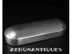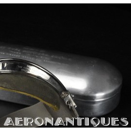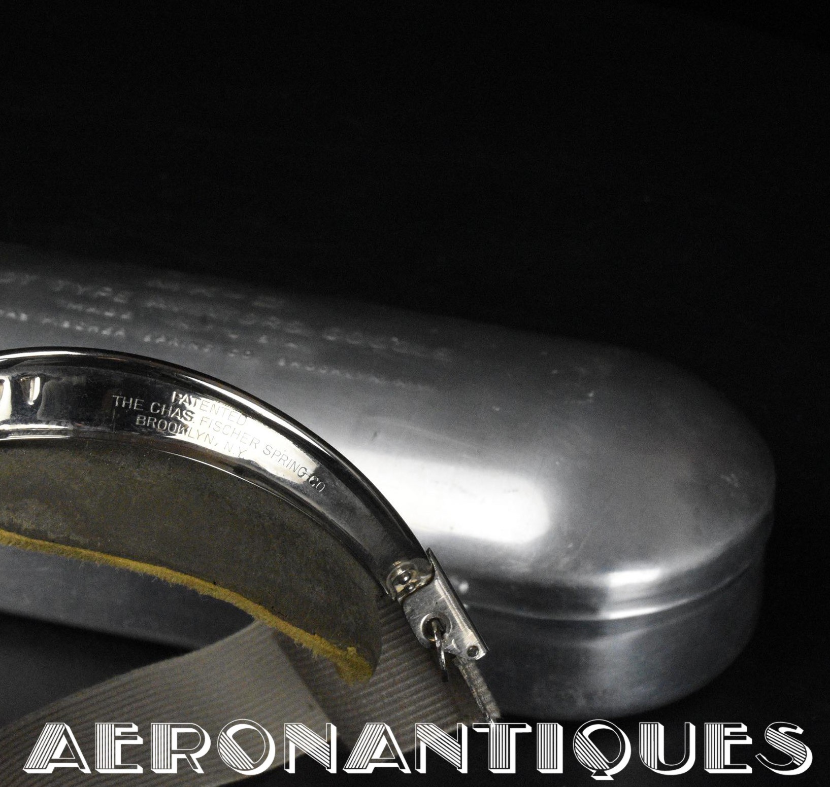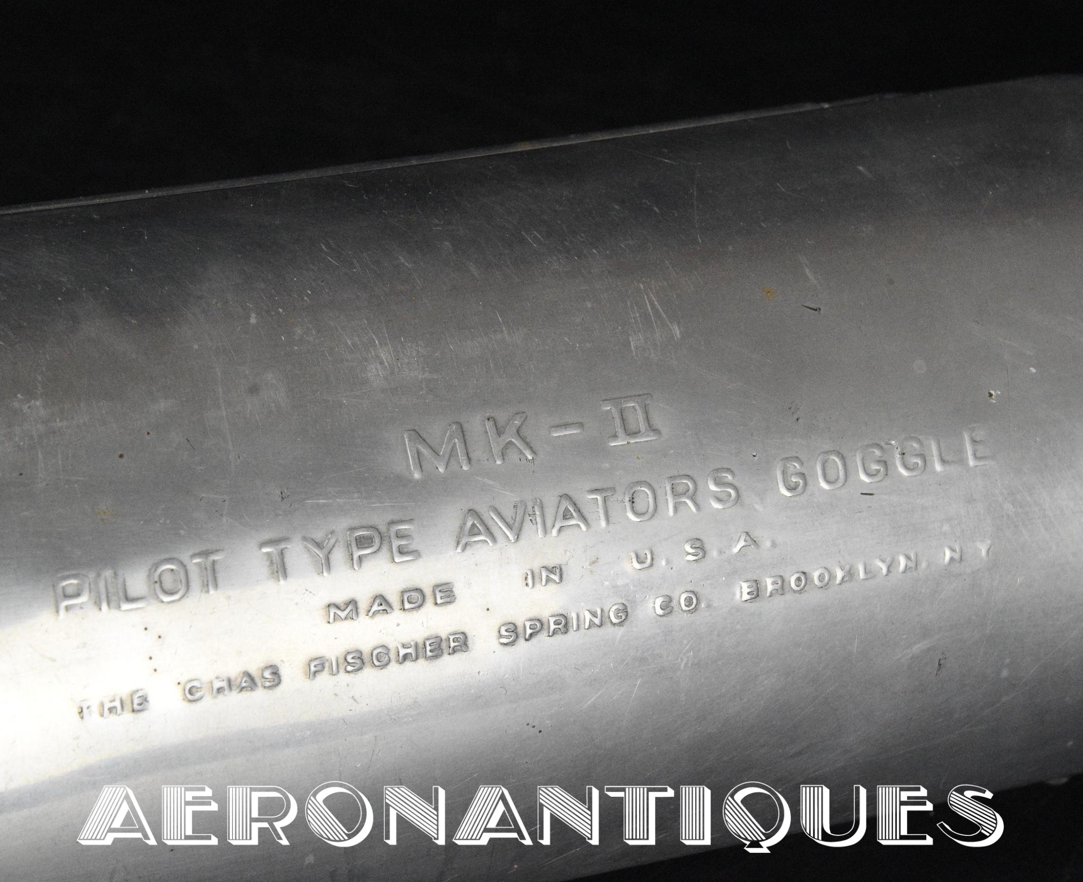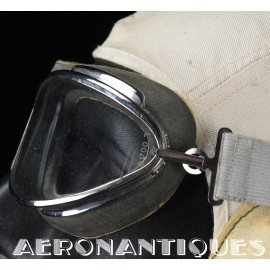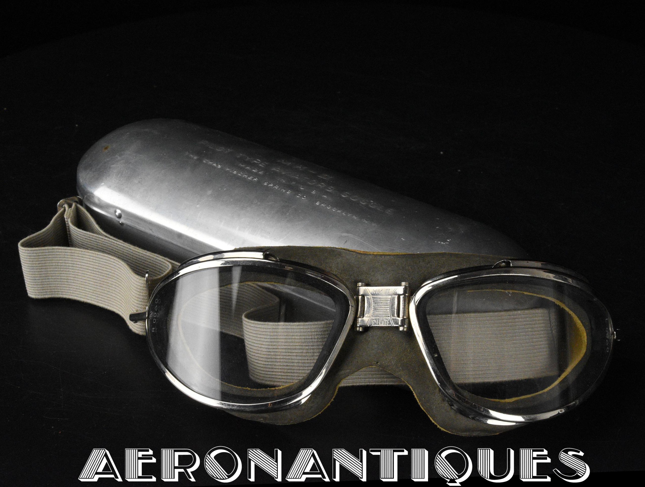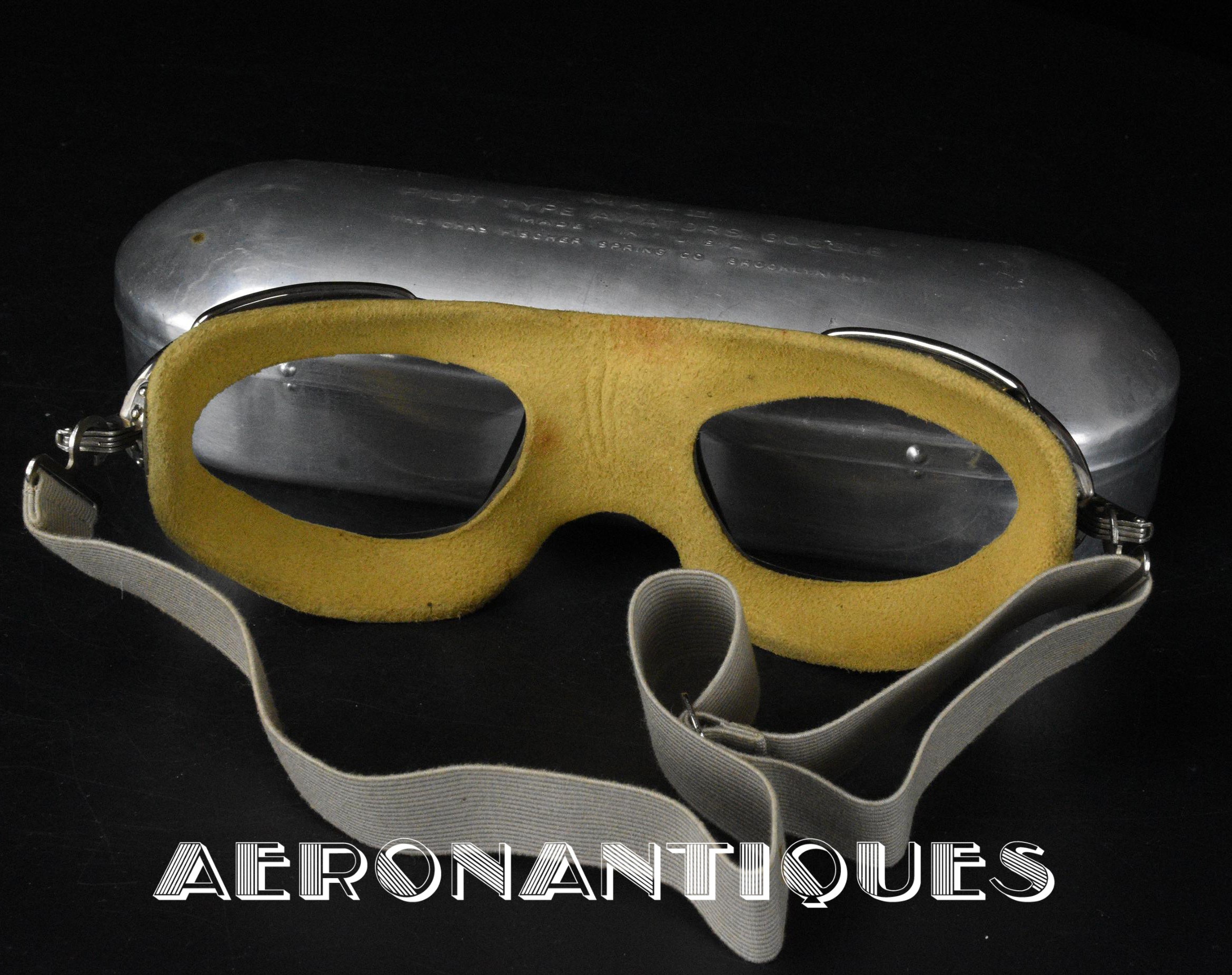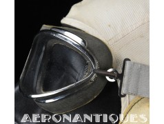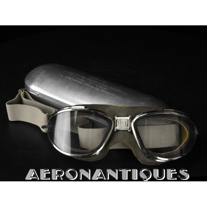 Exceptional and rare US Navy or US Marine Corps pilot's goggles, type MKII, manufactured by CHAS. FISCHER SPRING Co., with clear mineral lenses, a fine gray rubber mask lined with perfectly supple chamois, stamped USN. With the original embossed aluminum case. Near mint condition. Very early wartime. A superb piece, perfect for displaying a type M-450 or 1092 naval aviation helmet.