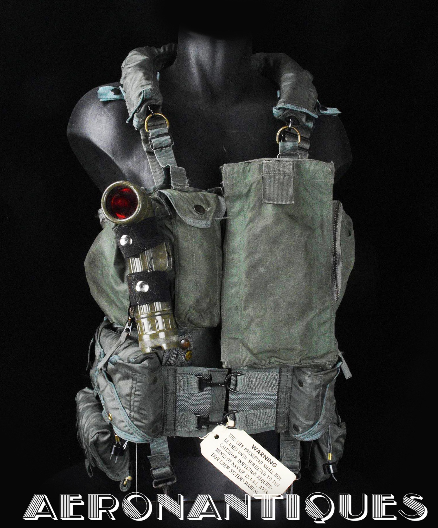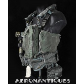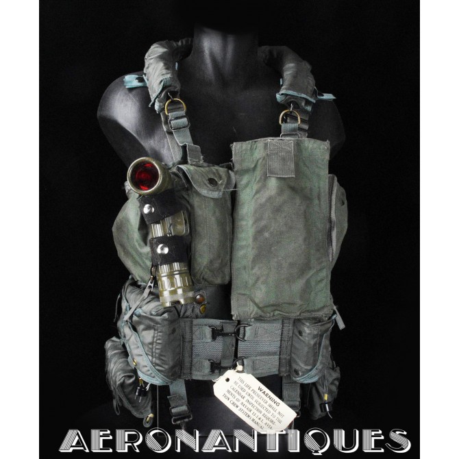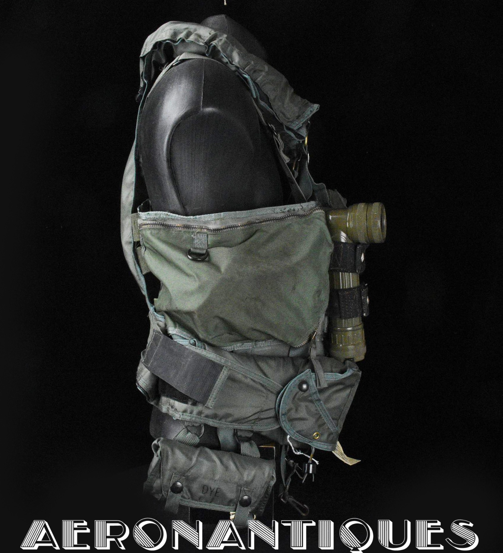 LPA-2 life preserver and SV-2B survival vest set. Late 1970s era. Complete with inflation bladders and triggers. Also included are the dye-marker and flares pouches (empty) and the MX-991/U angled flashlight. The SV-2B survival vest is in its original configuration with all its pockets, survival knife sheath, holster (revolver not included) and uncut straps. Before being replaced in the early 1980s by the LPU models, these life preservers were all visually identical for pilots of aircraft equipped with or without ejection seats. The only difference laying internally, with the addition of the FL-8/P module, which automatically inflates in seawater. This type of life jacket and survival vest can be used with an MA-2 torso harness for ejection seat equipped aircrafts or worn on its own by pilots and crews of helicopters or patrol aircraft.