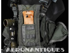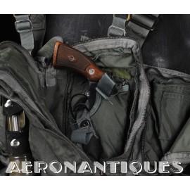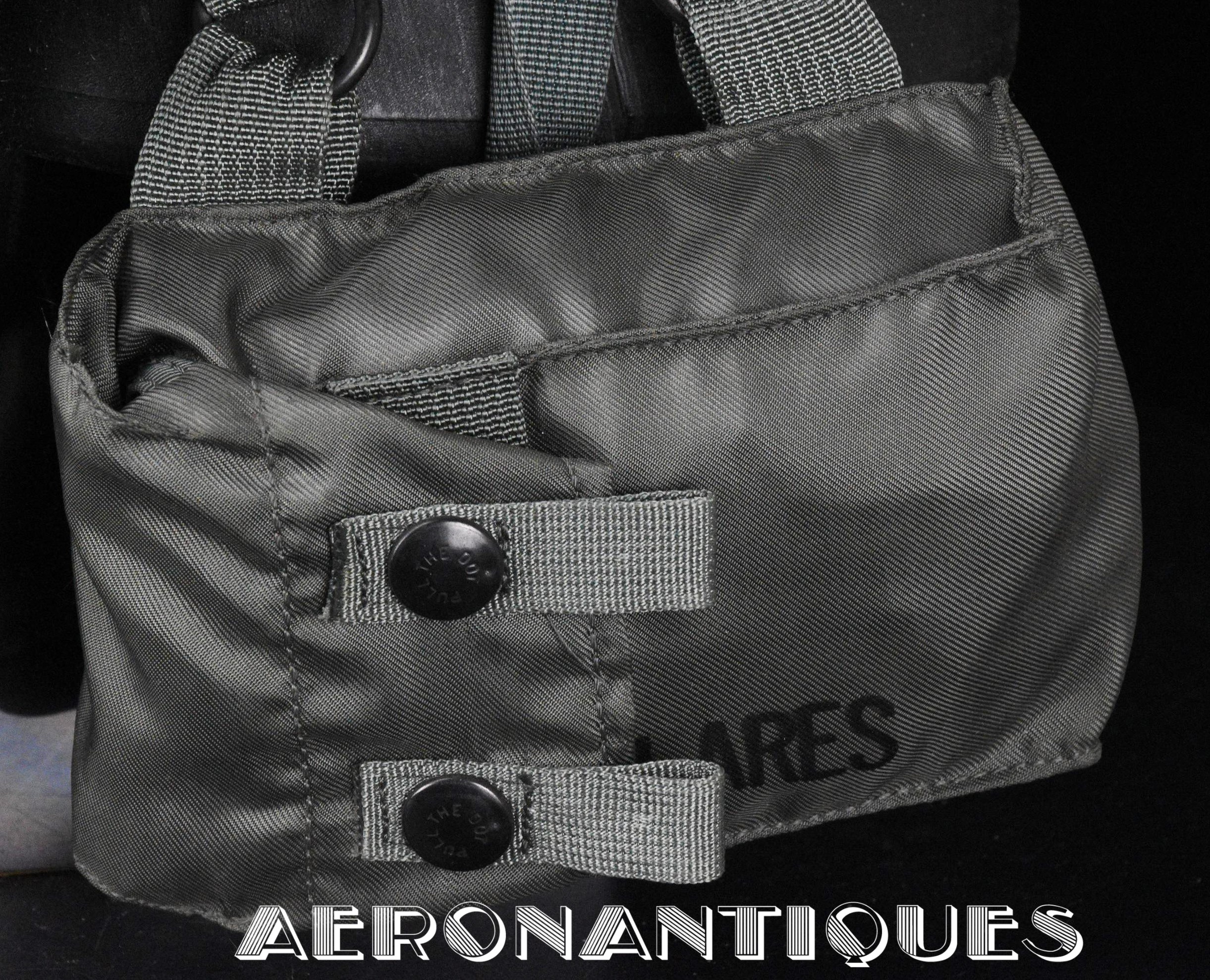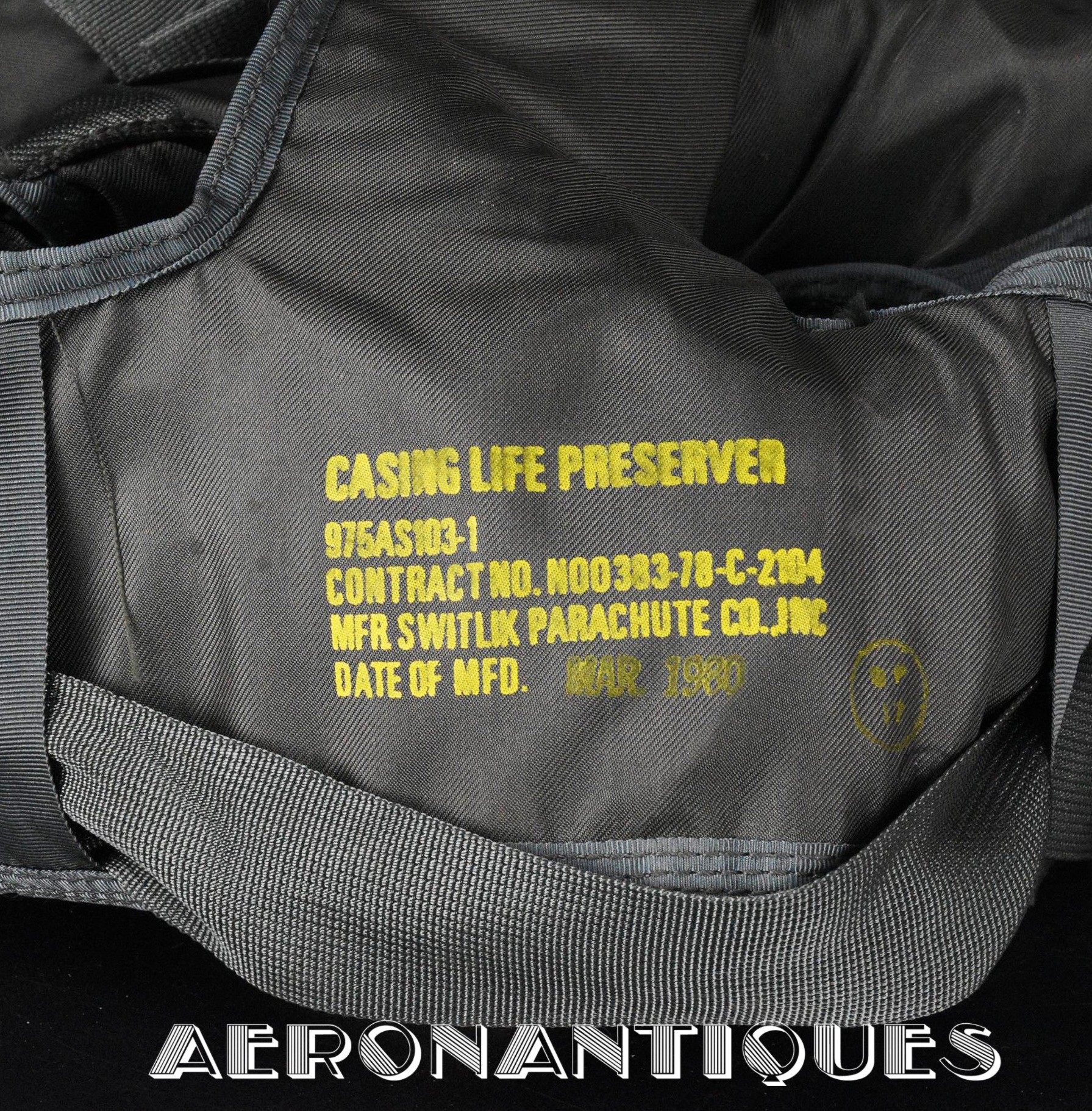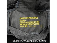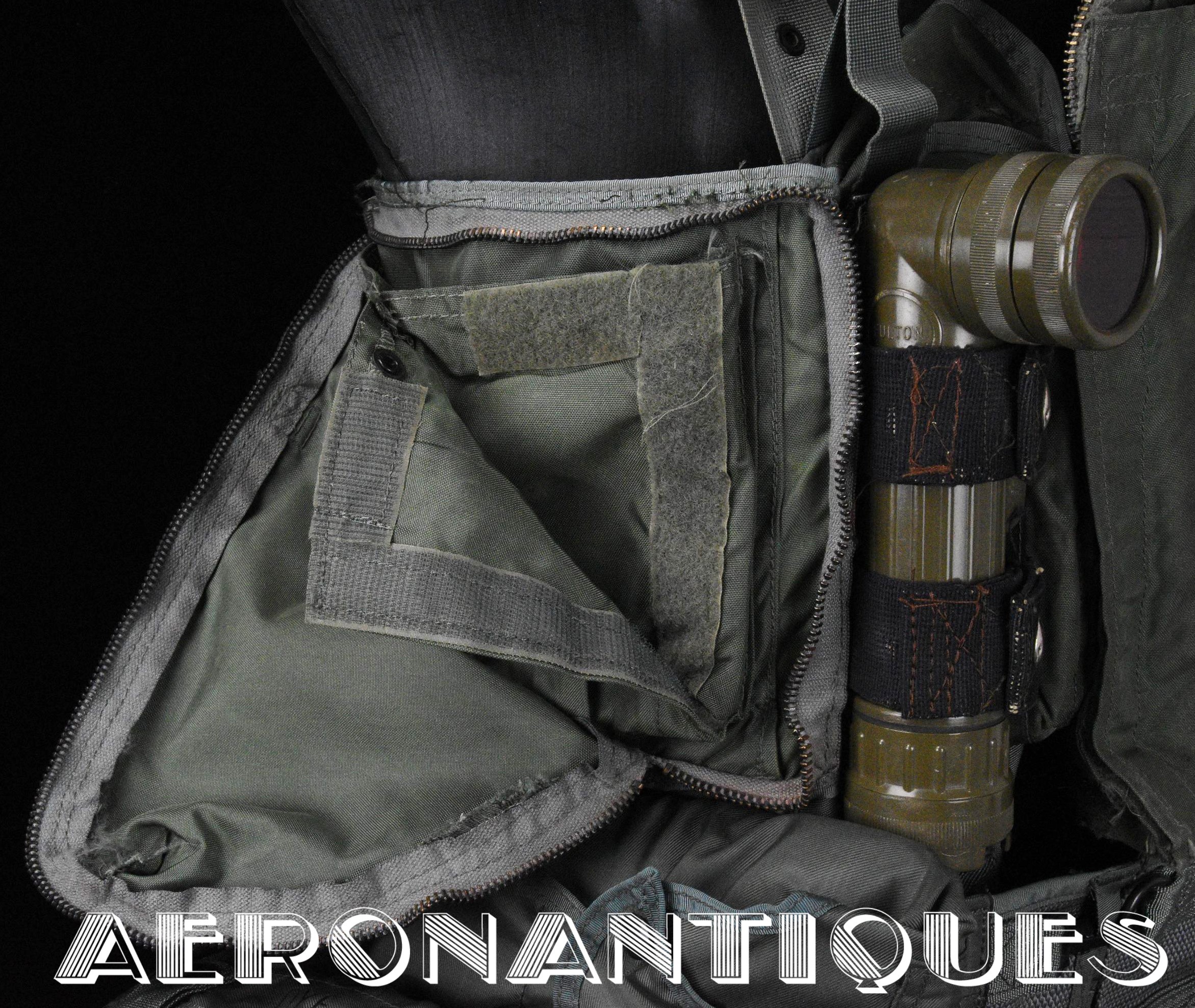 LPA-2 life preserver and SV-2B survival vest set. Late 1970s era. Complete with inflation bladders and triggers. Also included are the dye-marker and flares pouches (empty) and the MX-991/U angled flashlight. The SV-2B survival vest is in its original configuration with all its pockets, survival knife sheath, holster (revolver not included) and uncut straps. Before being replaced in the early 1980s by the LPU models, these life preservers were all visually identical for pilots of aircraft equipped with or without ejection seats. The only difference laying internally, with the addition of the FL-8/P module, which automatically inflates in seawater. This type of life jacket and survival vest can be used with an MA-2 torso harness for ejection seat equipped aircrafts or worn on its own by pilots and crews of helicopters or patrol aircraft.