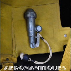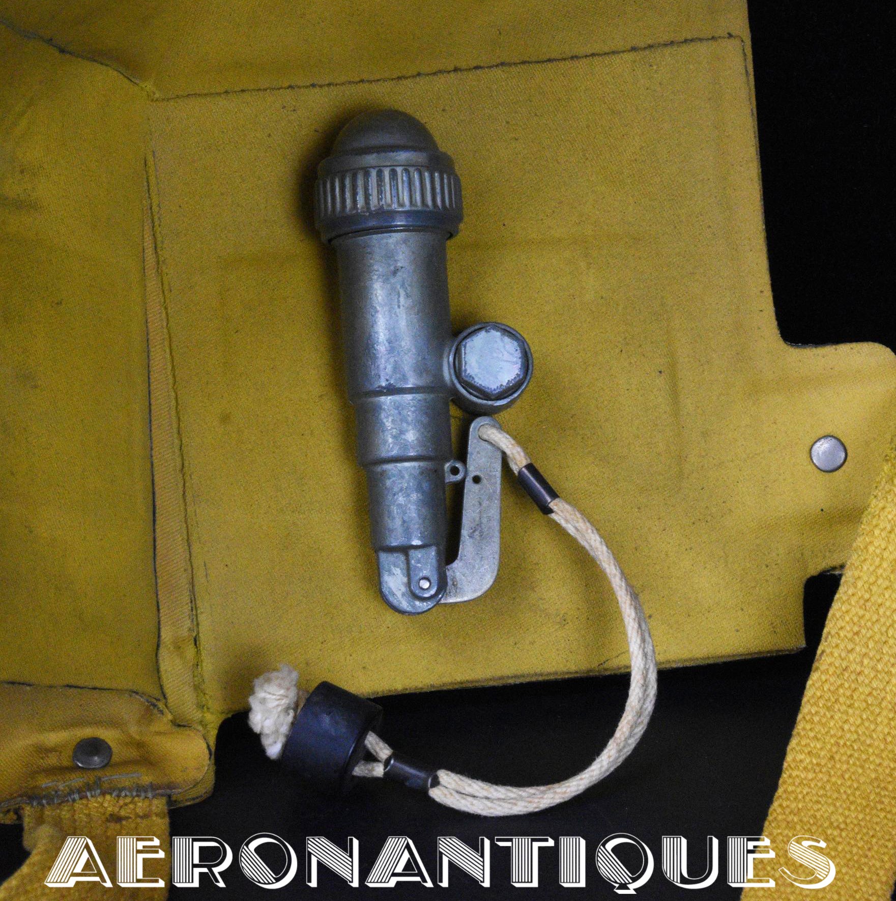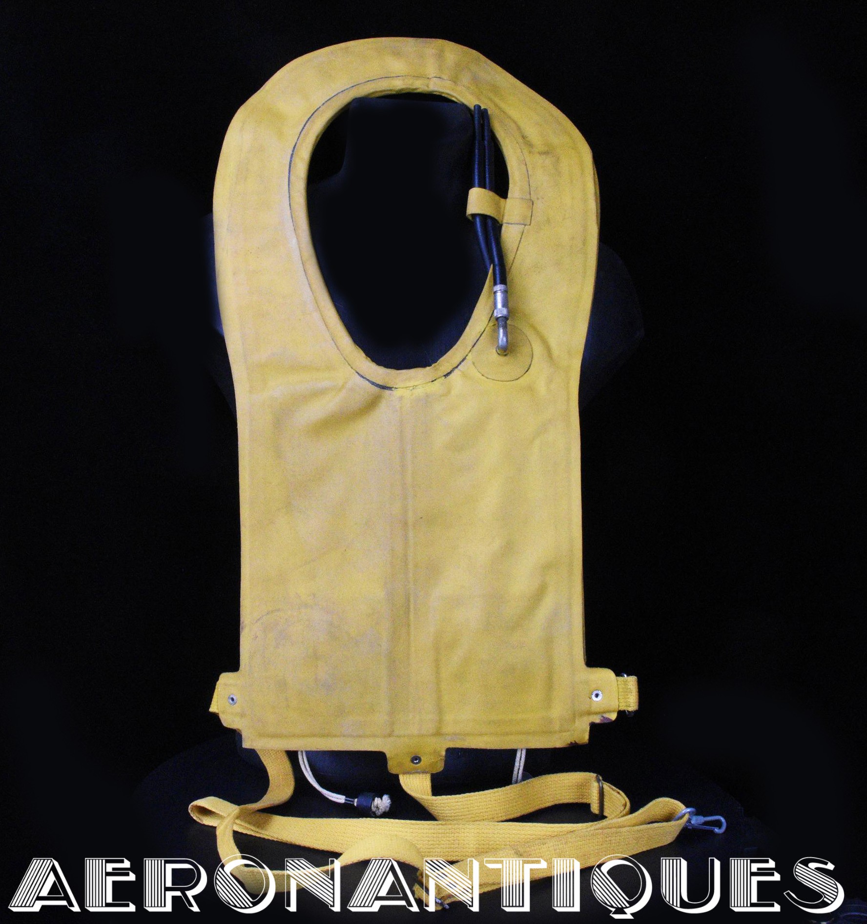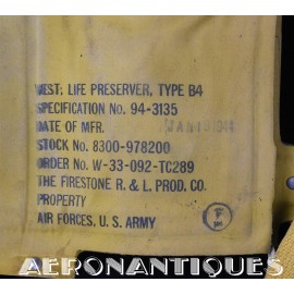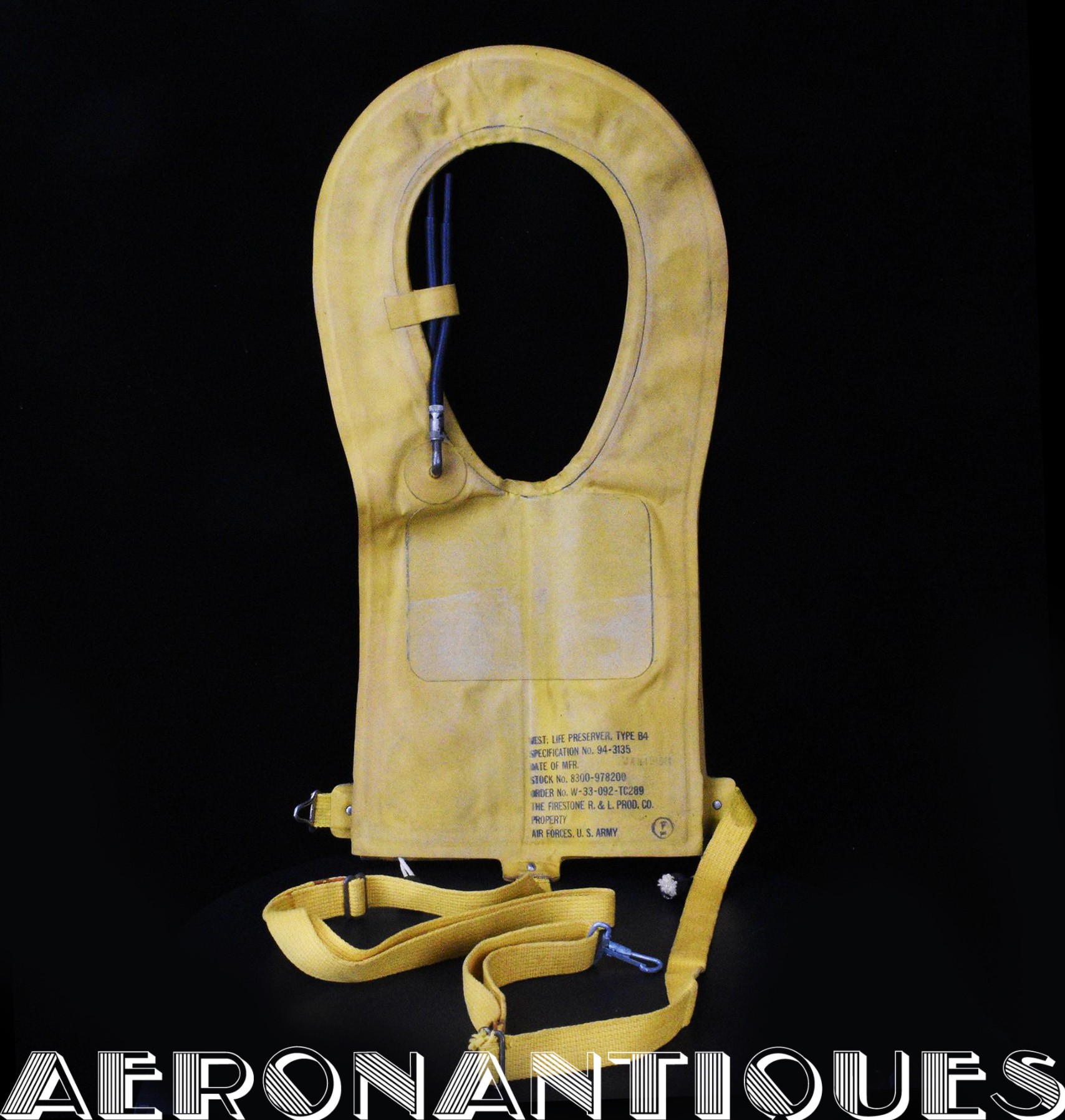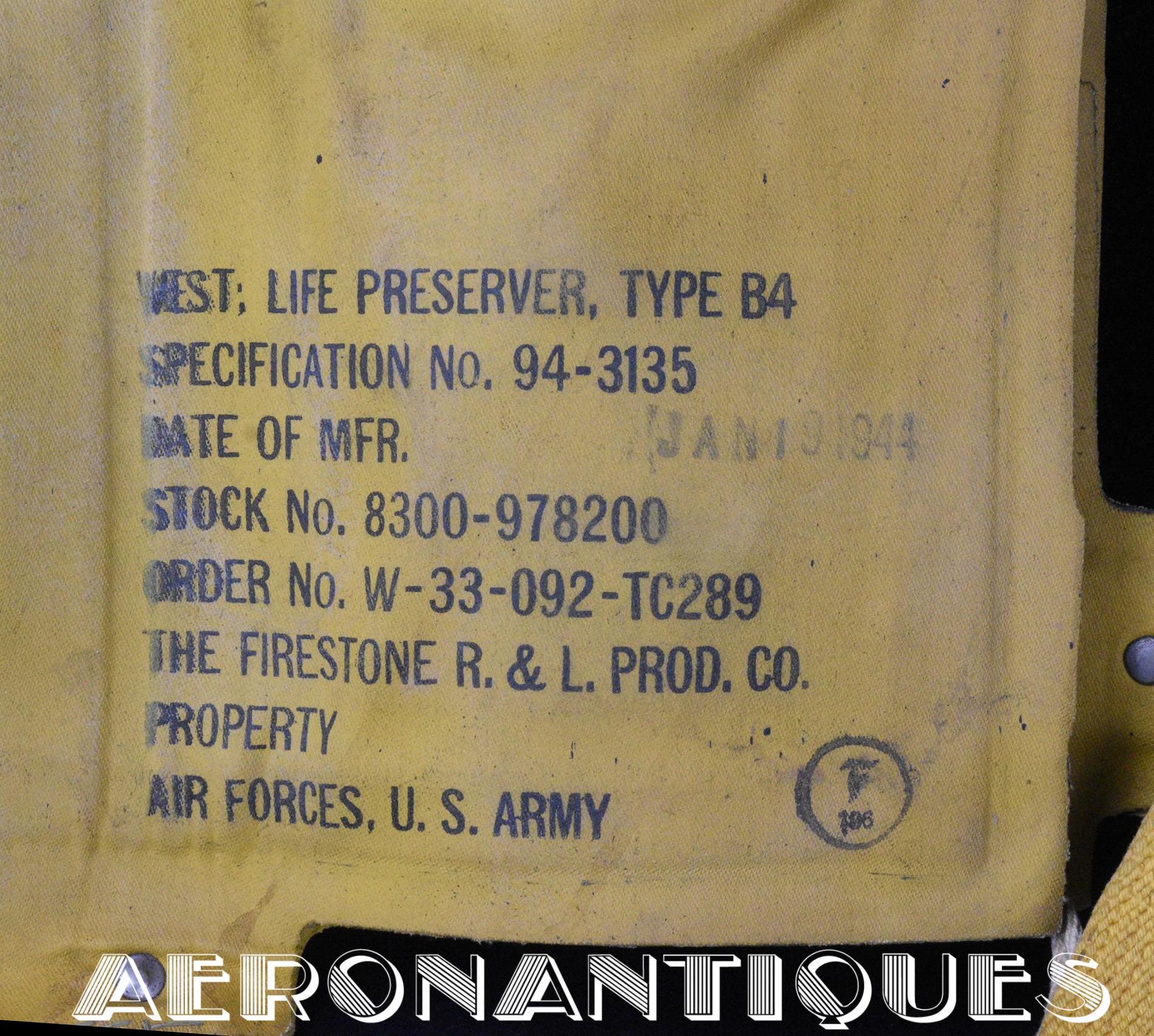 B-4 pattern life preserver vest aka "Mae-West", US Army Air Force issue. Dated January 1944, made by FIRESTONE. Complete with all its straps, trigger and emergency inflation devices. US Army Air Force contract with matching stamp. Early small type carabiner. Mint condition. Rare item which has never been modified or inspected with later stamps.