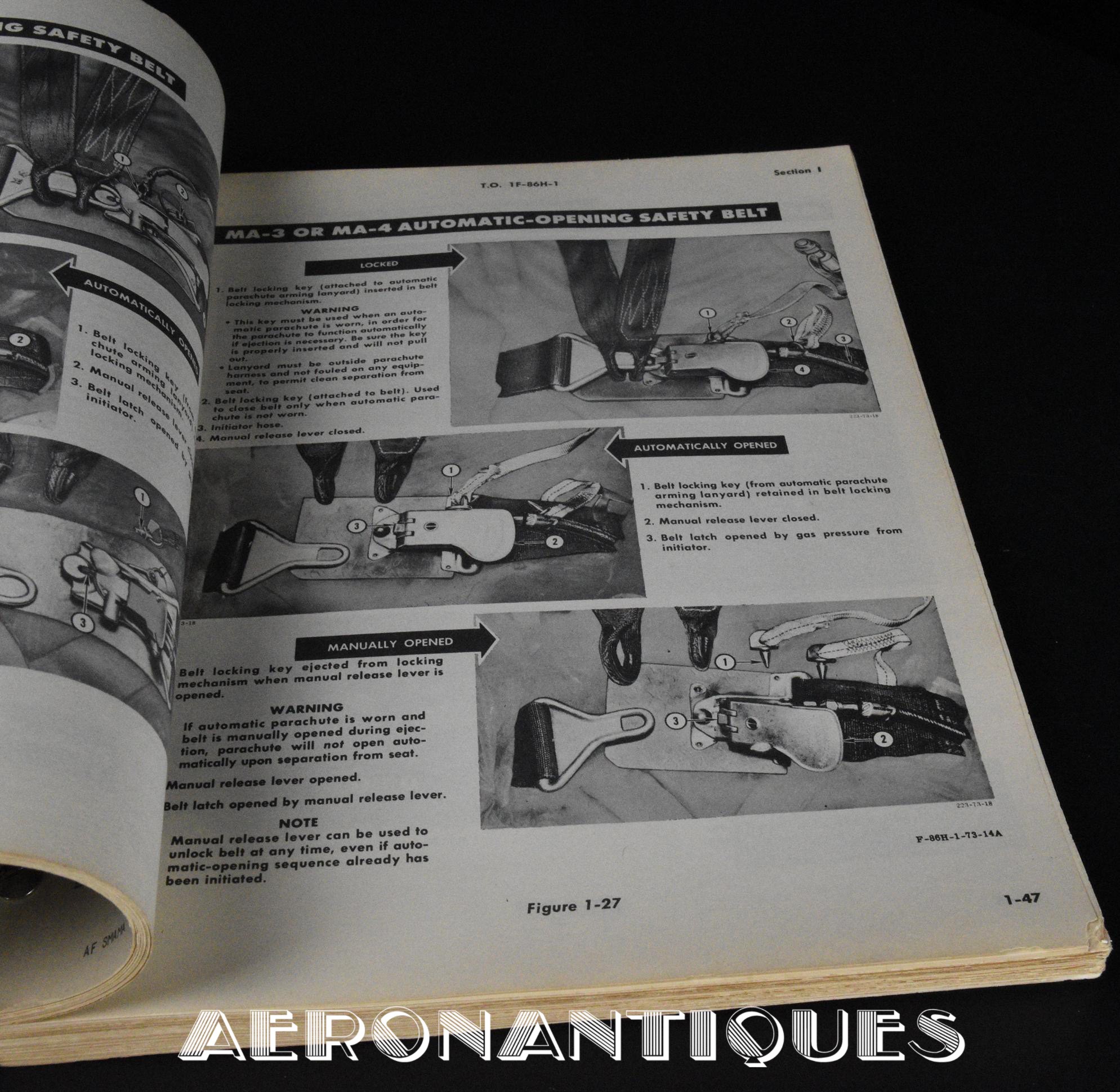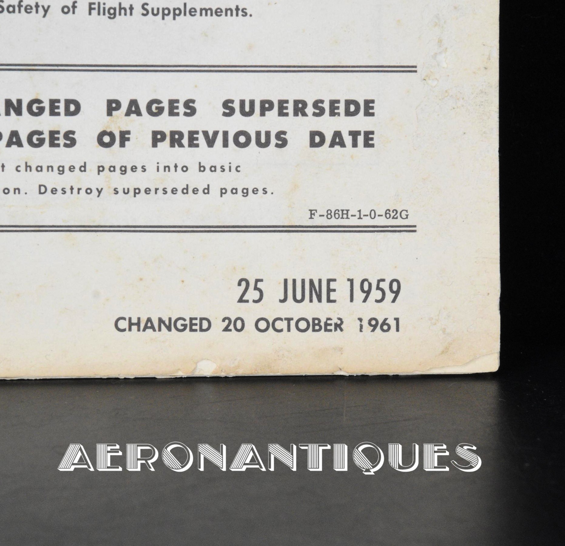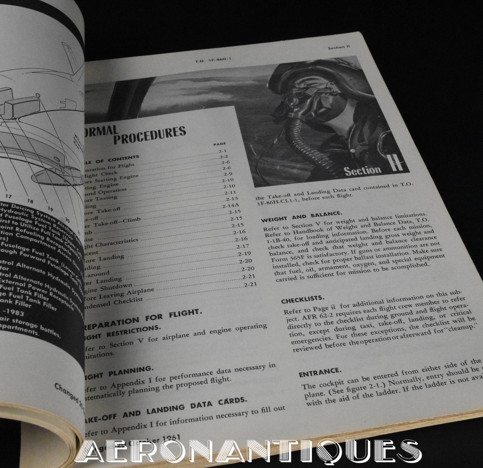 Vintage original North American F-86H SABRE US Air Force flight manual. Around 200 pages with colour and black & white diagram plates (cockpit, ejection seat, hydraulics, etc..). Dimensions 28 cm X 21,5 cm. Dated 1959 with 1961 changes.