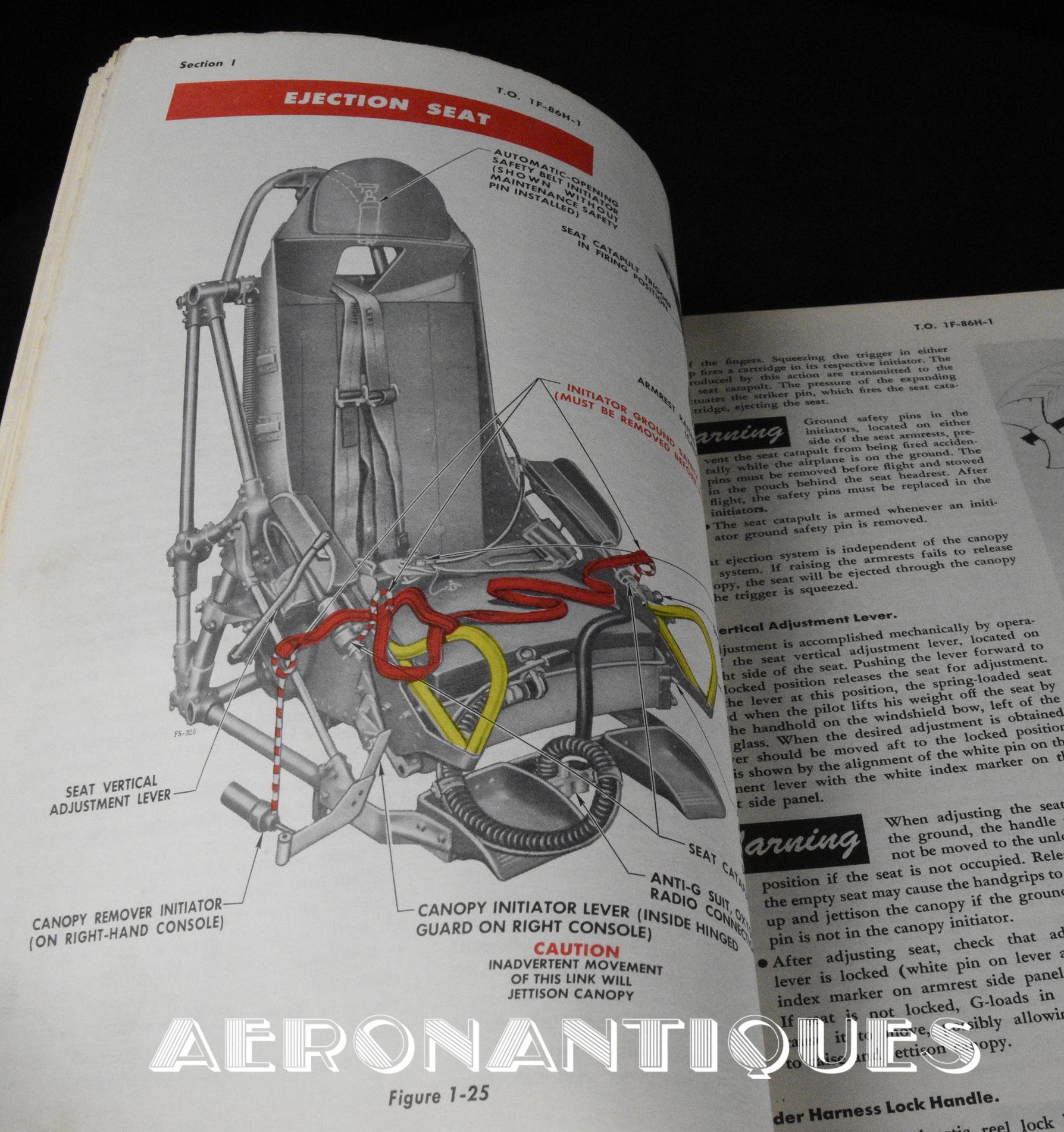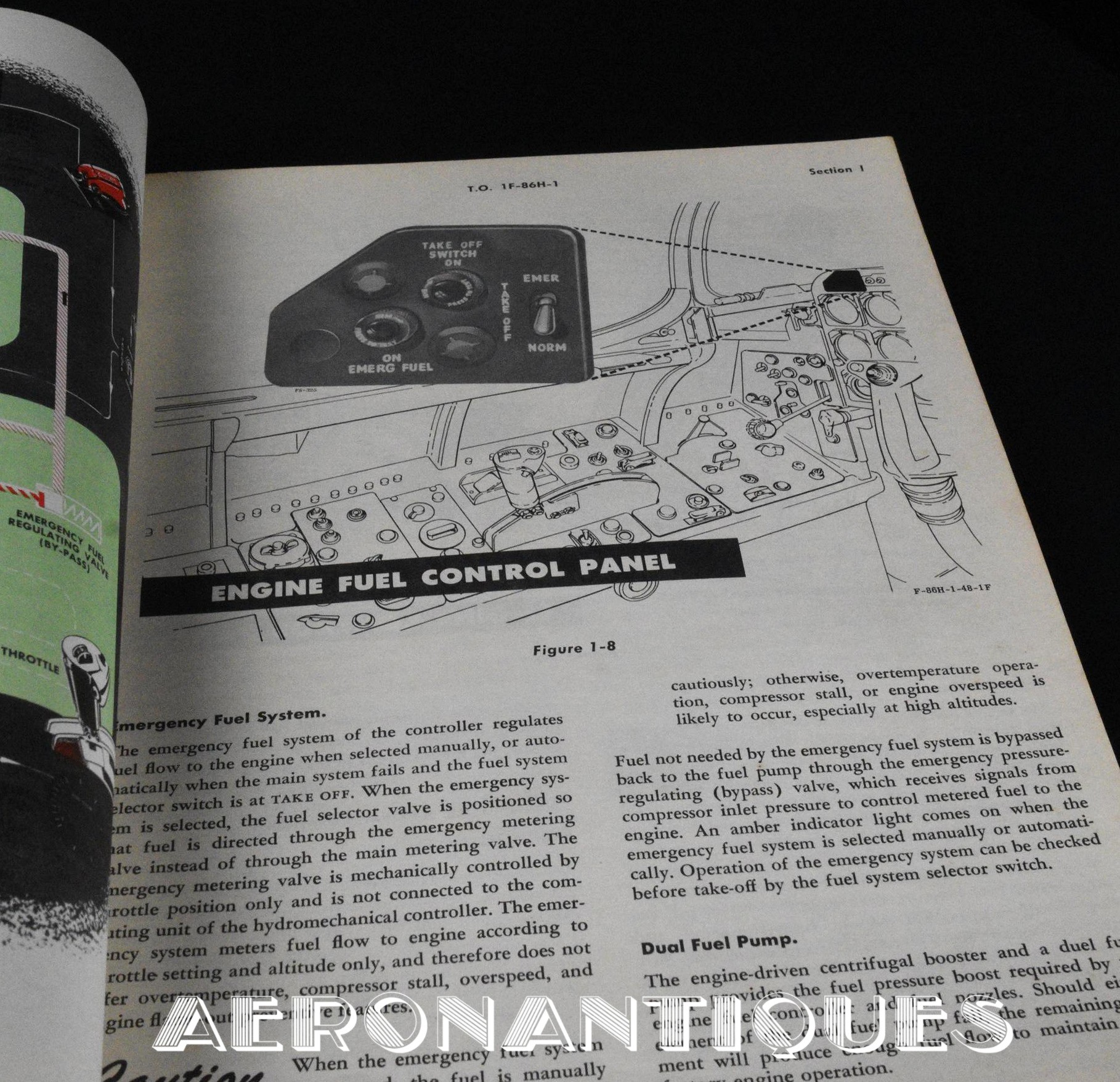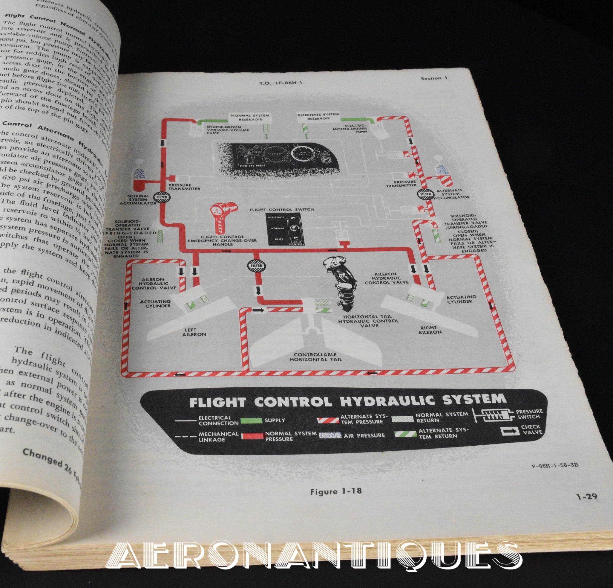 Vintage original North American F-86H SABRE US Air Force flight manual. Around 200 pages with colour and black & white diagram plates (cockpit, ejection seat, hydraulics, etc..). Dimensions 28 cm X 21,5 cm. Dated 1959 with 1961 changes.