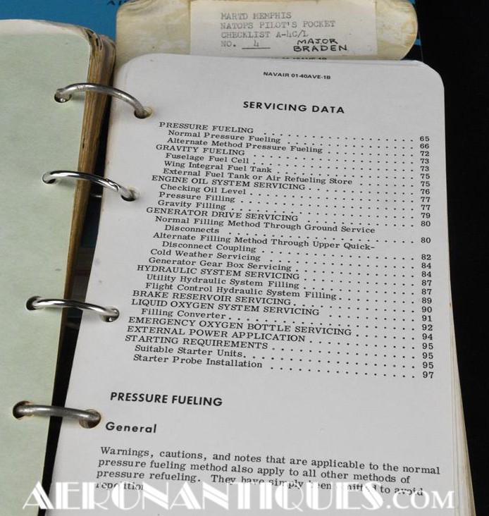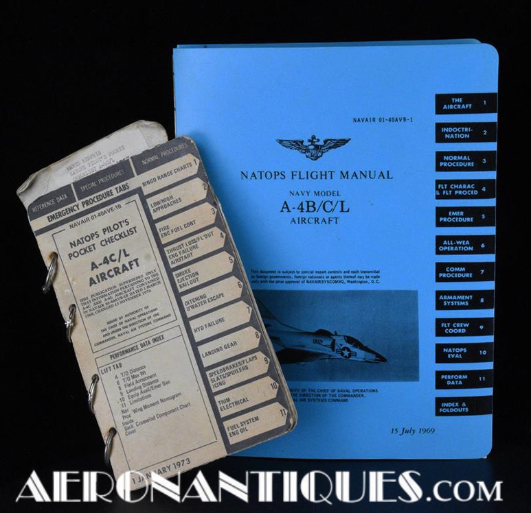 Vietnam era original NATOPS flight manual and checklist for B/C & L versions of the McDonnel Douglas A-4 Skyhawk attack aircraft. Containing all the normal and emergency instructions and procedures with foldouts. Dated 1970 and 1973. Dimensions 28 cm X 21,5 cm. Approximately 300 pages. A great source of essential information on this iconic US Navy attack aircraft.