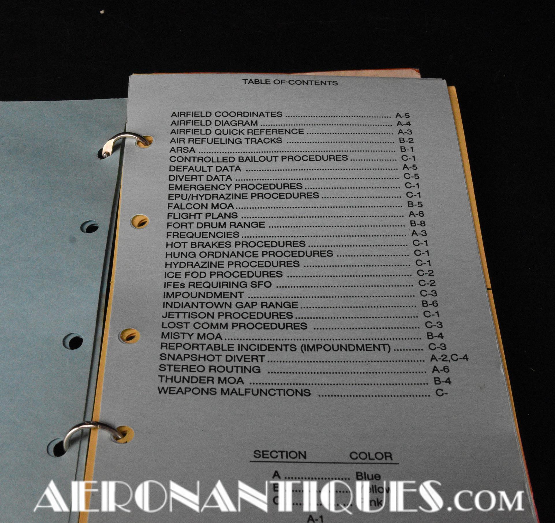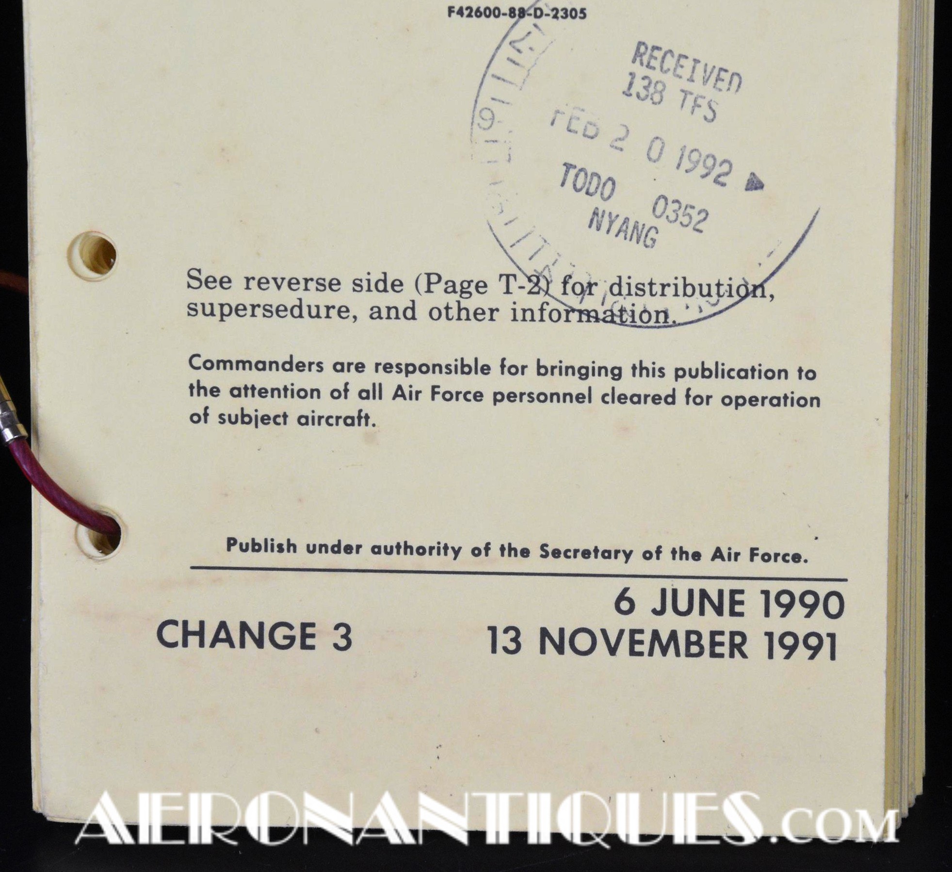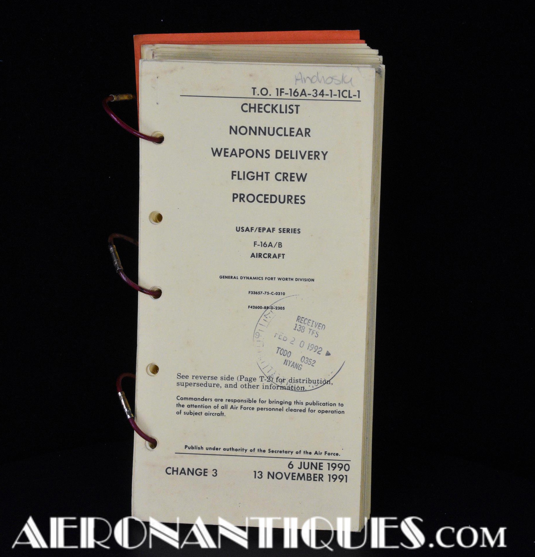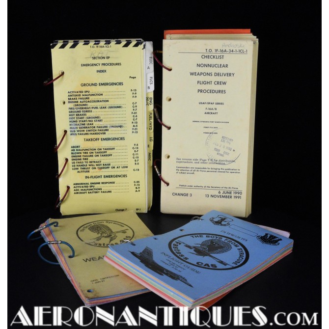 Rare set of 4 checklist for the US Air Force General Dynamics F-16 A/B Fighting Falcon pilots. Complete with original binding rings. Including the very rare weapons delivery checklist, flight crew checklist and emergency procedures checklist. Also included are two rare squadron memos from the 138h Tactical Fighter Squadron. All dated 1991. Nice item coming from the same pilot's estate.