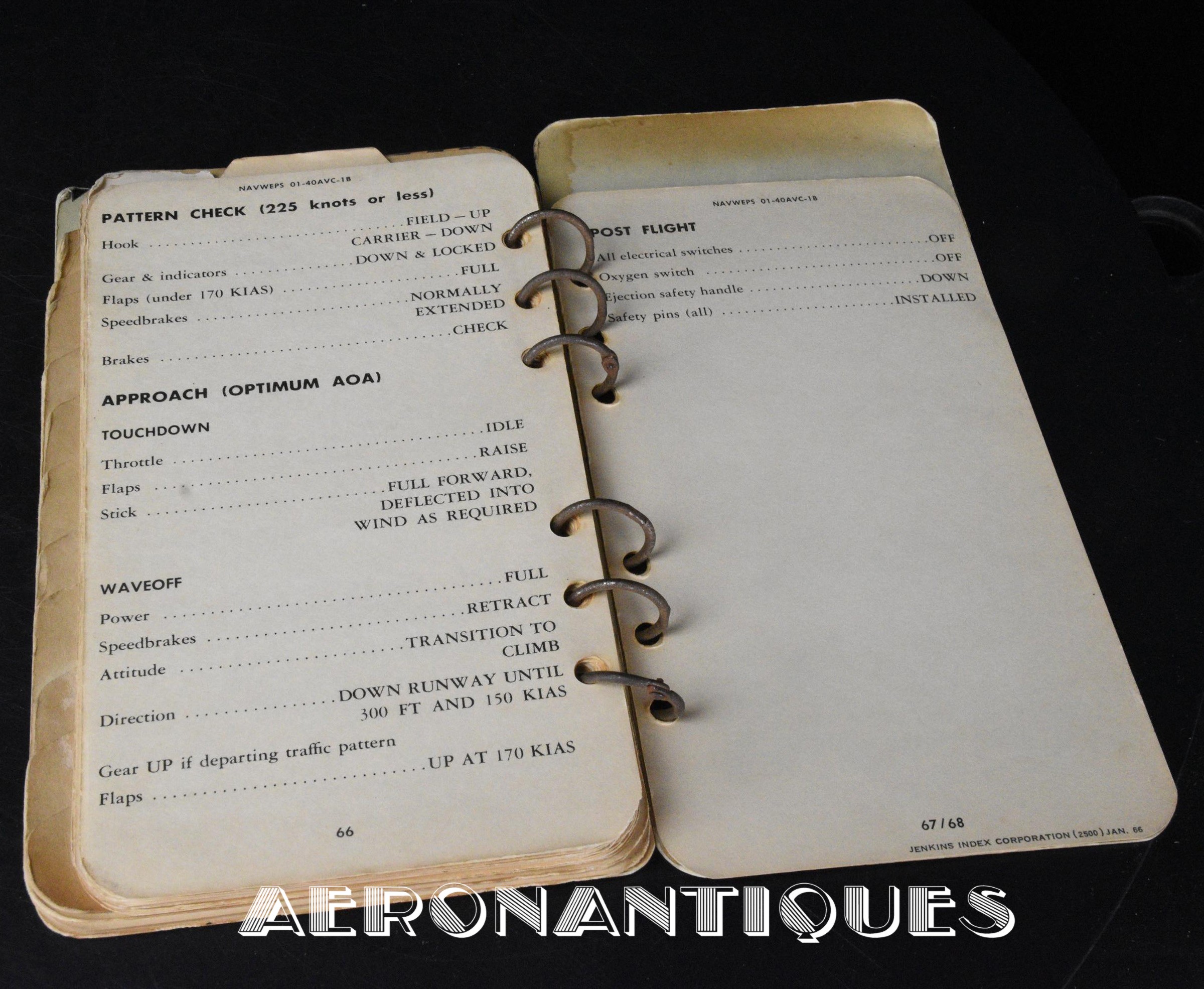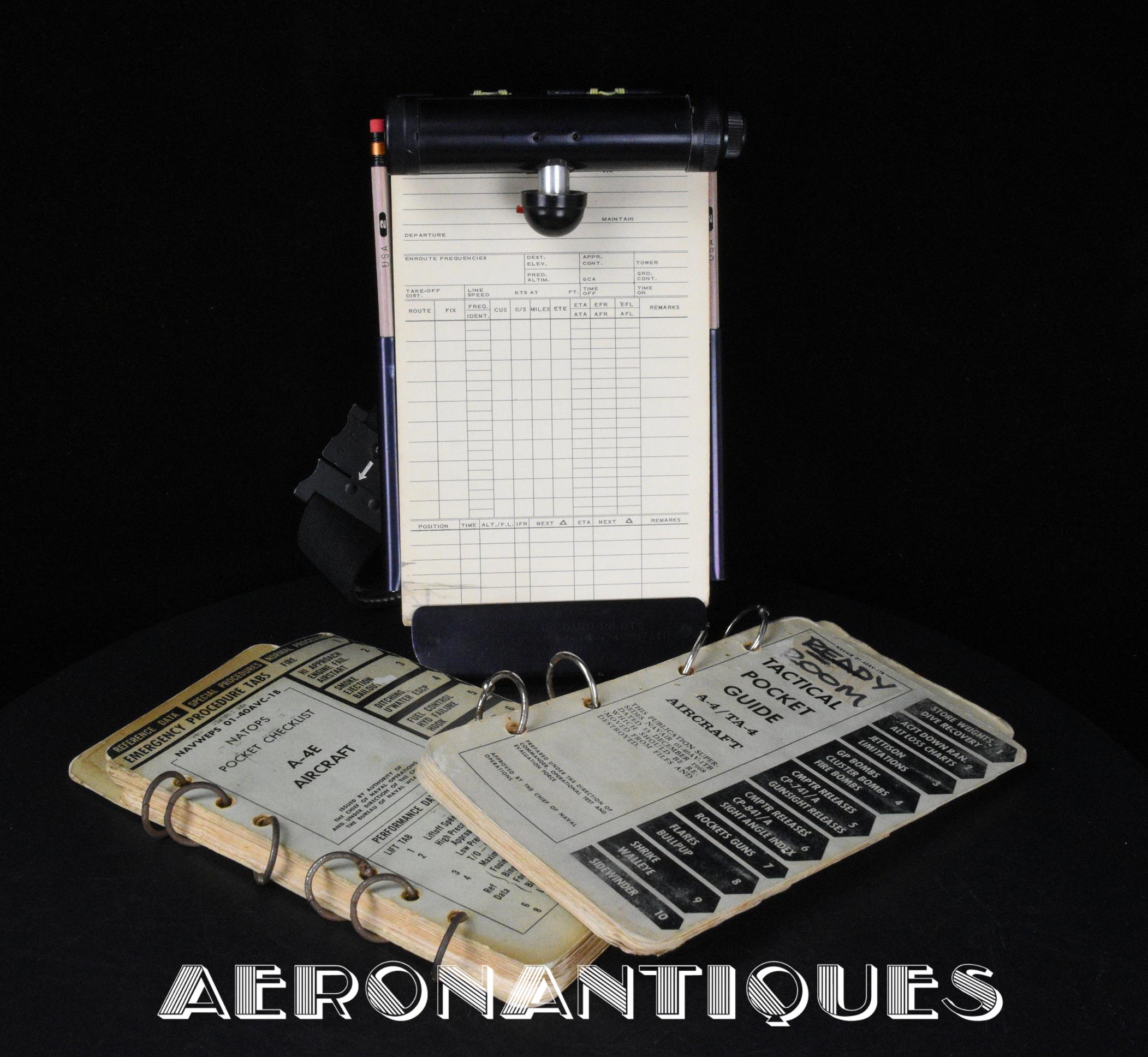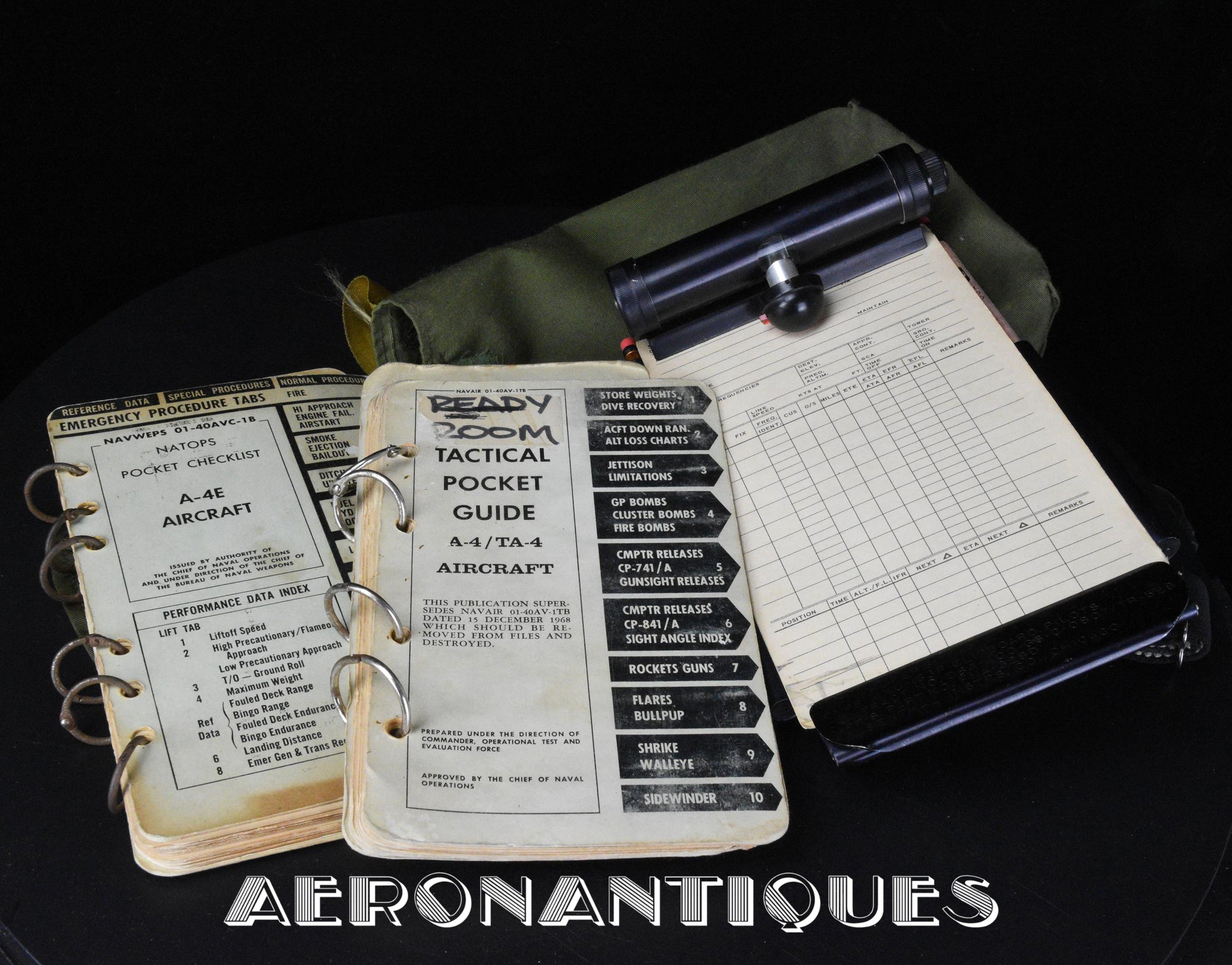A rare set of routine/emergency checklists and tactical checklists for US Navy Douglas A-4 Skyhawk attack aircraft pilots. Dated 1968. In their original "rigger"-made carrying bag with a navigation clipboard dated 1966. Uncommon, especially the tactical checklist. A total of 4 items, 2 checklists, one clipboard and one rigger made carrying bag.