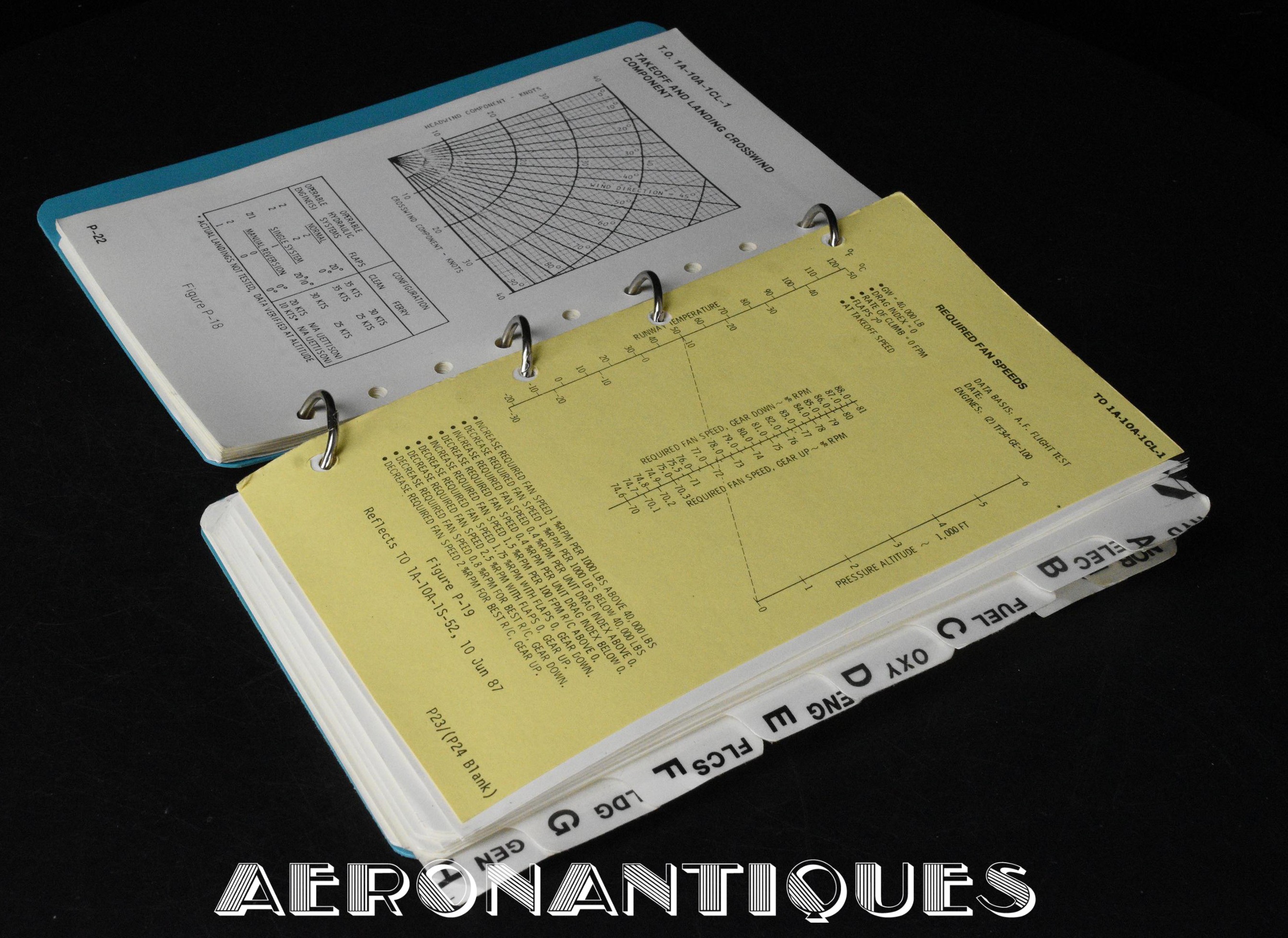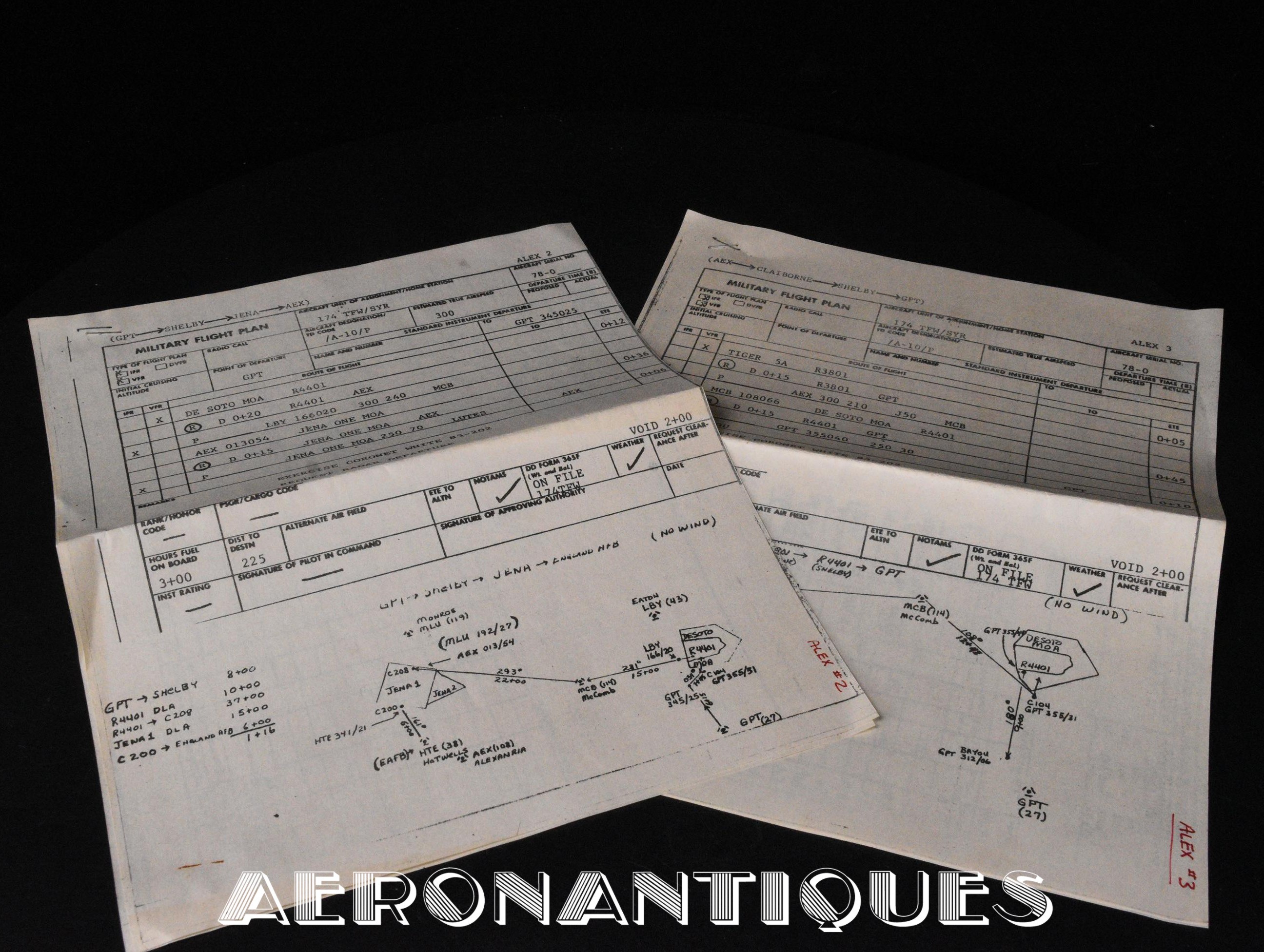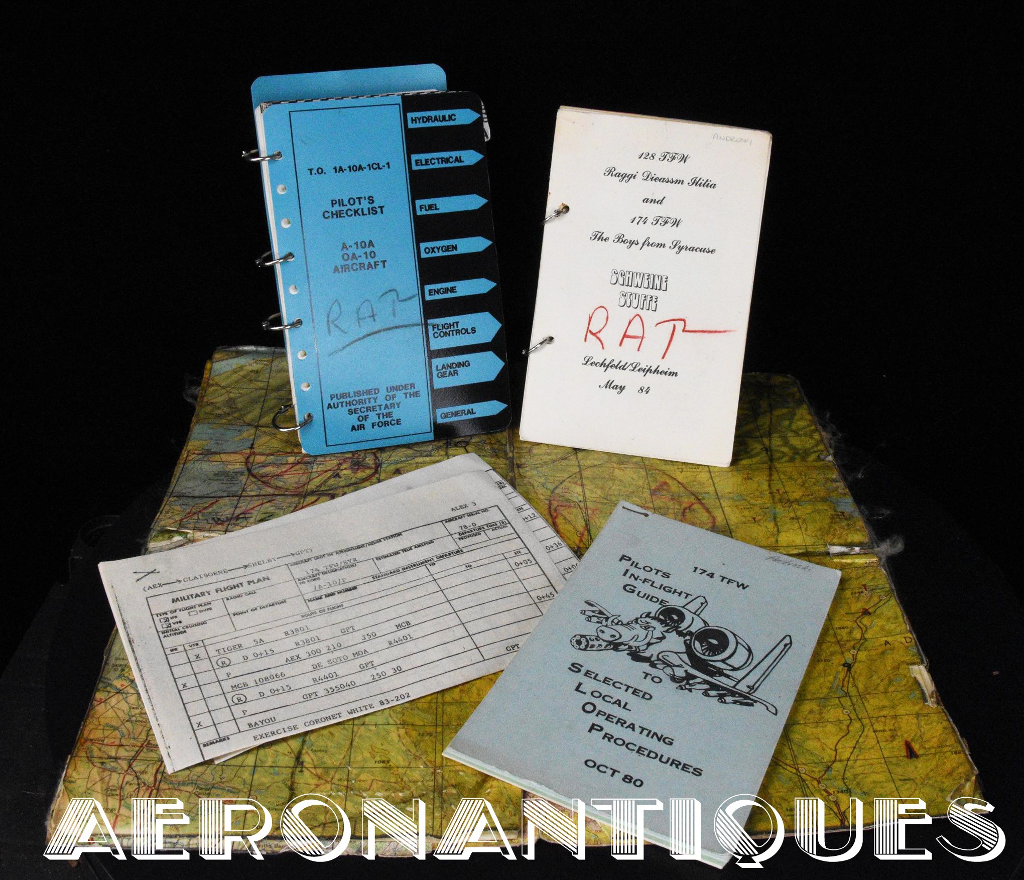 A collection of original documents, a map, and a checklist belonging to a US Air Force 174th TFS A-10 Thunderbolt single-seat ground attack aircraft pilot. The checklist is approximately 150 pages. Dimensions: 20.5 cm x 14 cm. Dated 1987 with 1988 updates. Also included are a laminated and annotated flight map, two flight plans and two operational manuals from the 174th Tactical Fighter Squadron. found in the same pilot's estate. Essential for all enthusiasts of this legendary American attack aircraft, which distinguished itself during the Gulf War and the conflict in Afghanistan.