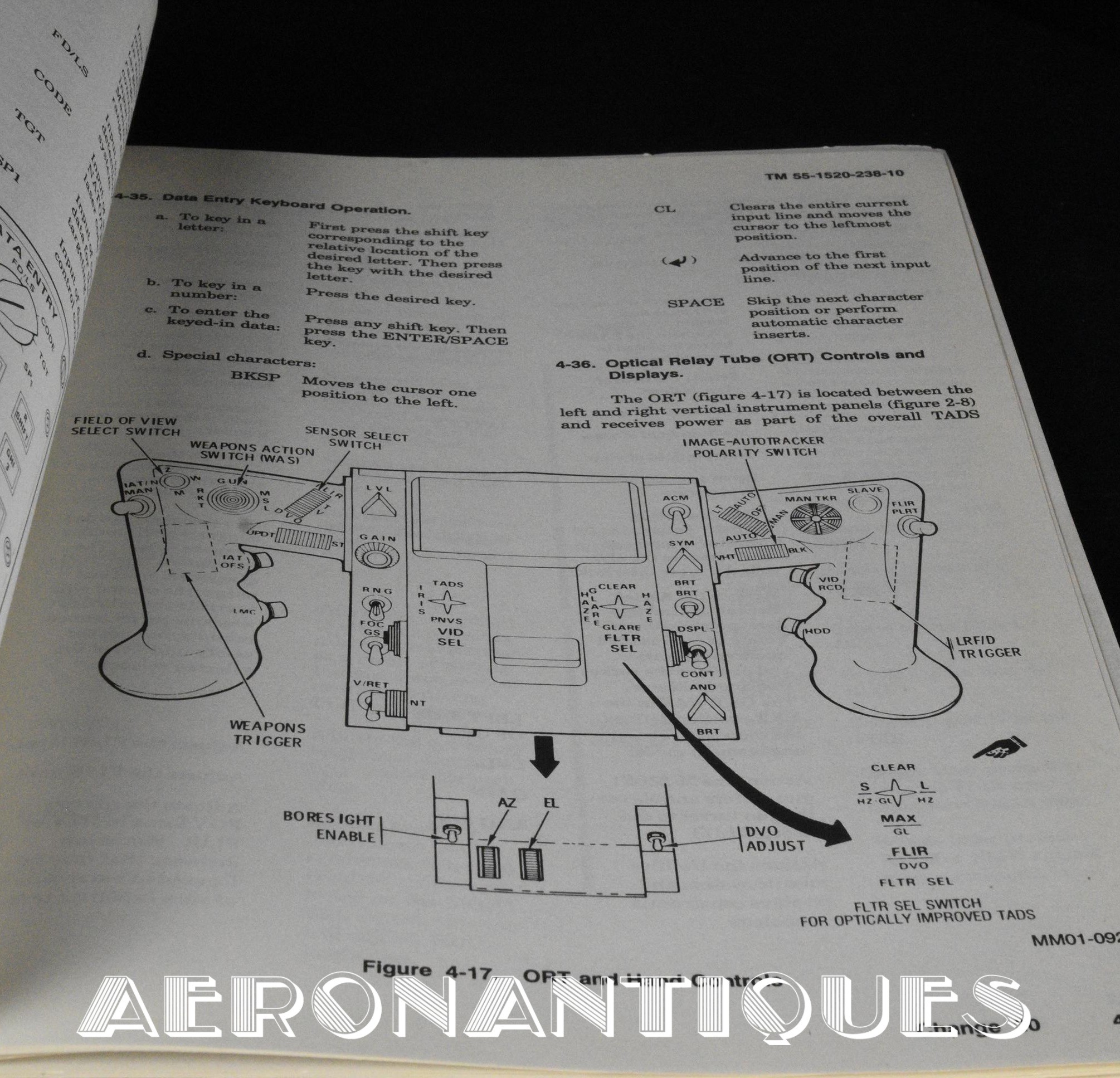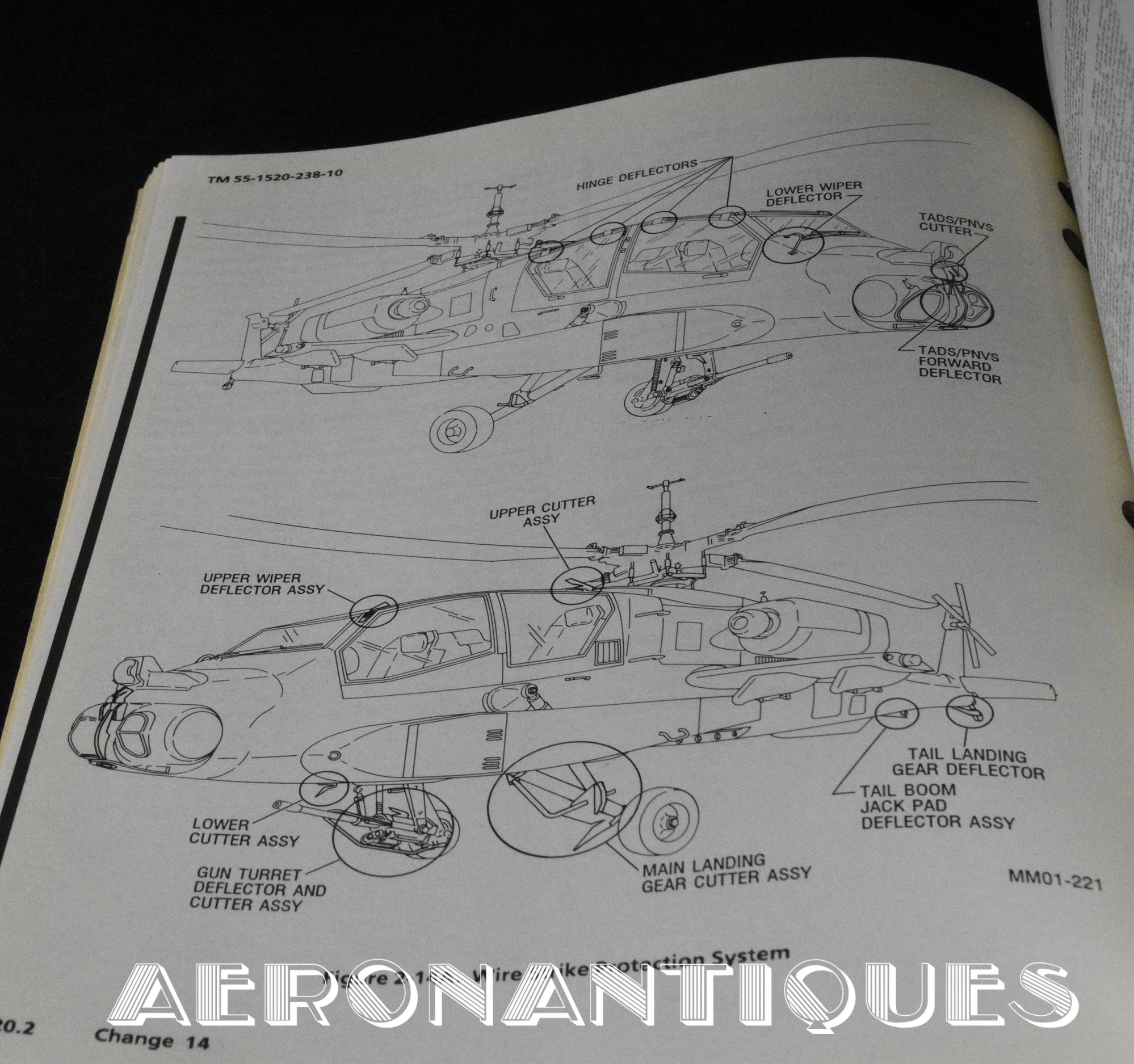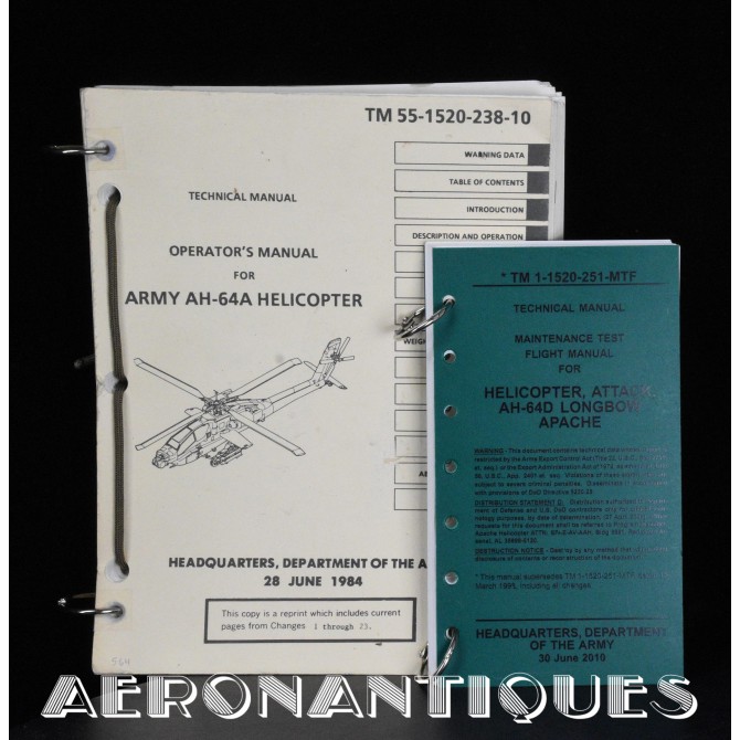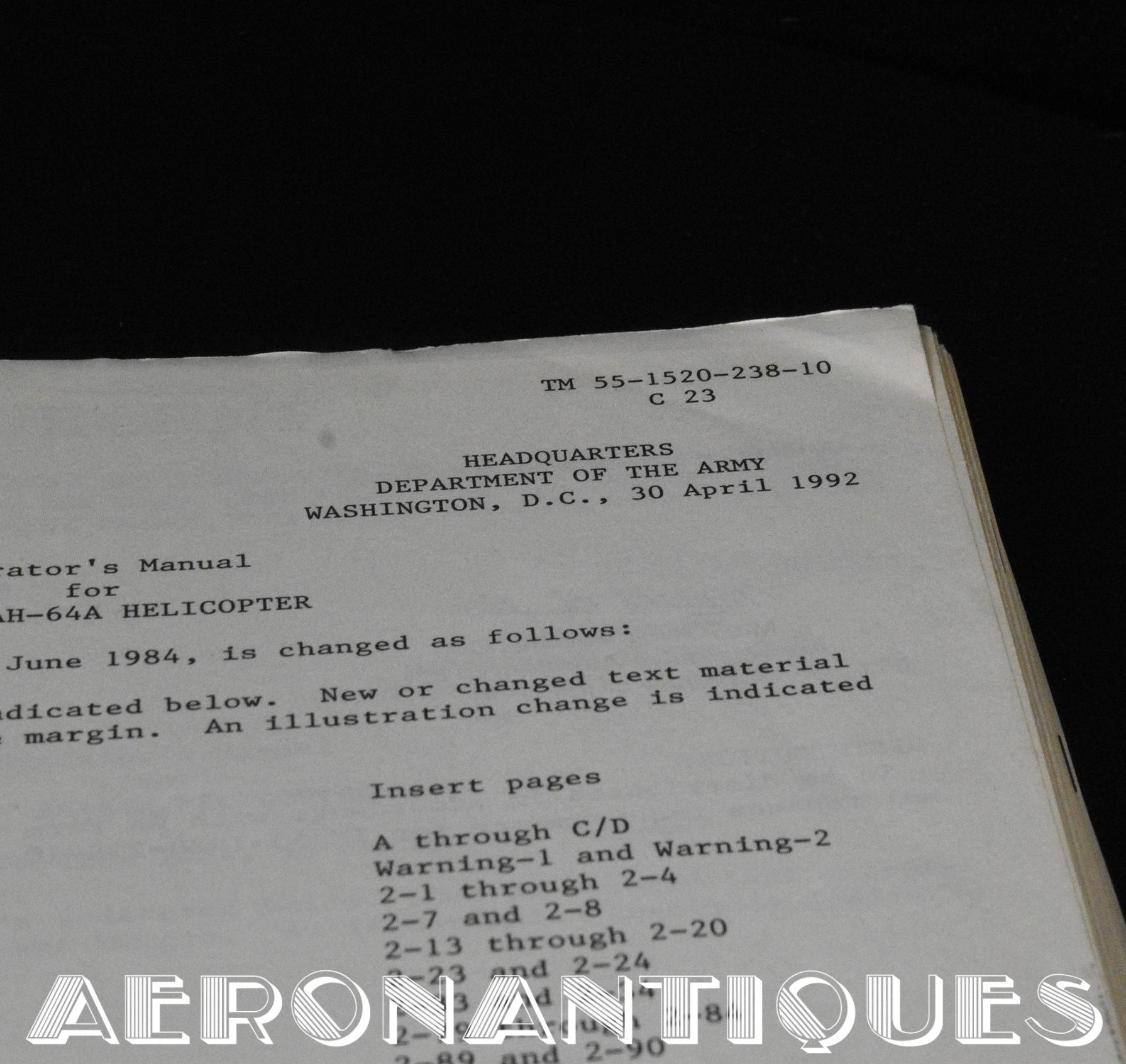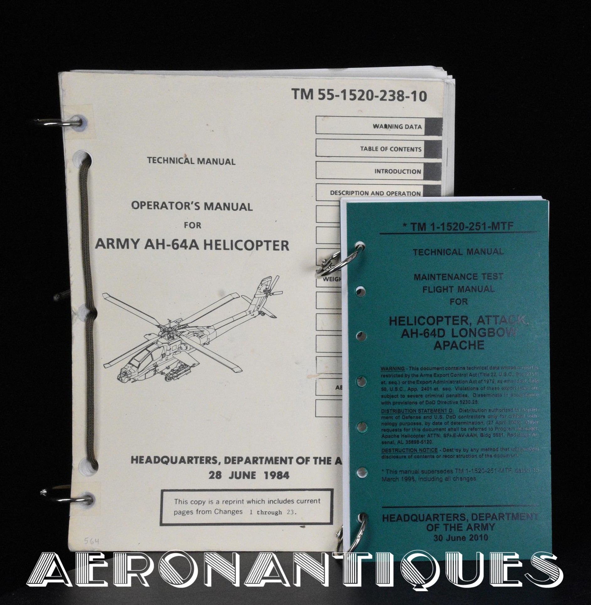 Original regulation pilot's manual for US Army AH-64 Apache helicopter pilots, A versions. Technical Manual 55-1520-238-10 dated 1984. Approximately 250 pages. Also includes the 2010 maintenance checklist for D versions. An essential reference document for this iconic US Army attack helicopter.