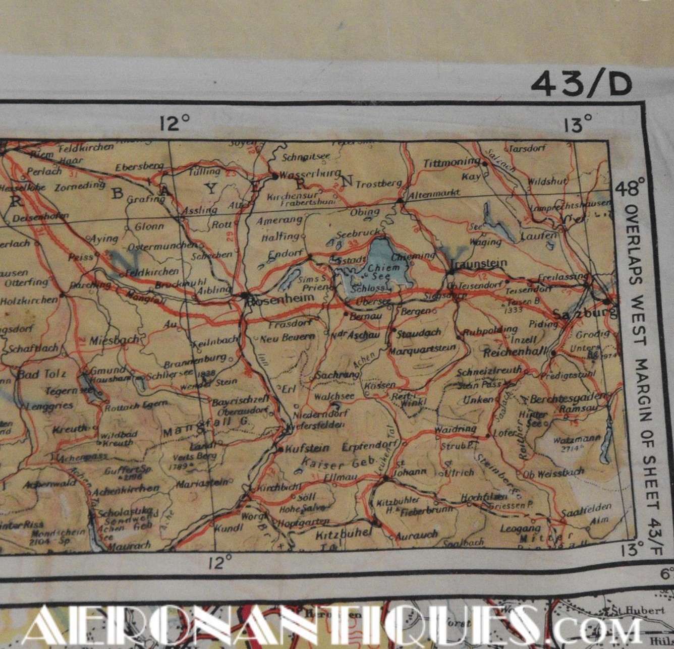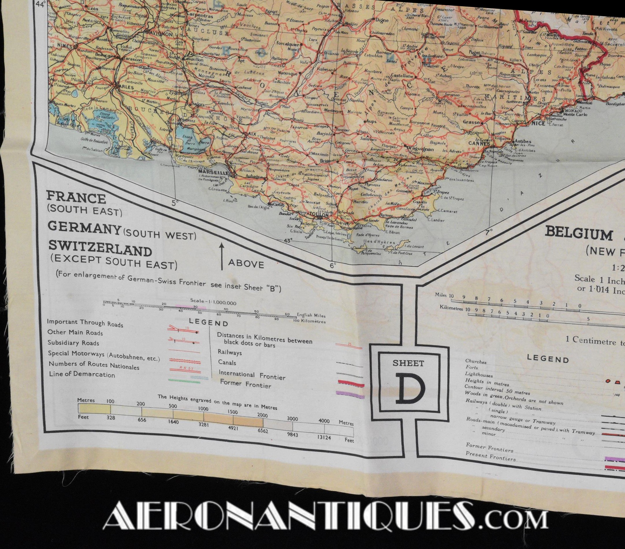 WWII British made double sided fabric escape chart for FRANCE BELGIUM, HOLLAND and SPAIN, C/D zones. 1943 production. Dimensions 72 cm X 72 cm. Scale 1:250,000. Great and iconic item to wear, frame or simply display. These charts were part of escape kits issued to allied pilots, paratroopers and special agents before combat ops. They were stored in waterproof coated fabric envelopes stamped "MAPS ONLY". Inside you could find these charts with a button compass, a miniature saw and sometimes foreign currencies. Excellent condition, crisp colors, silk is pliable without any tears or repairs.
