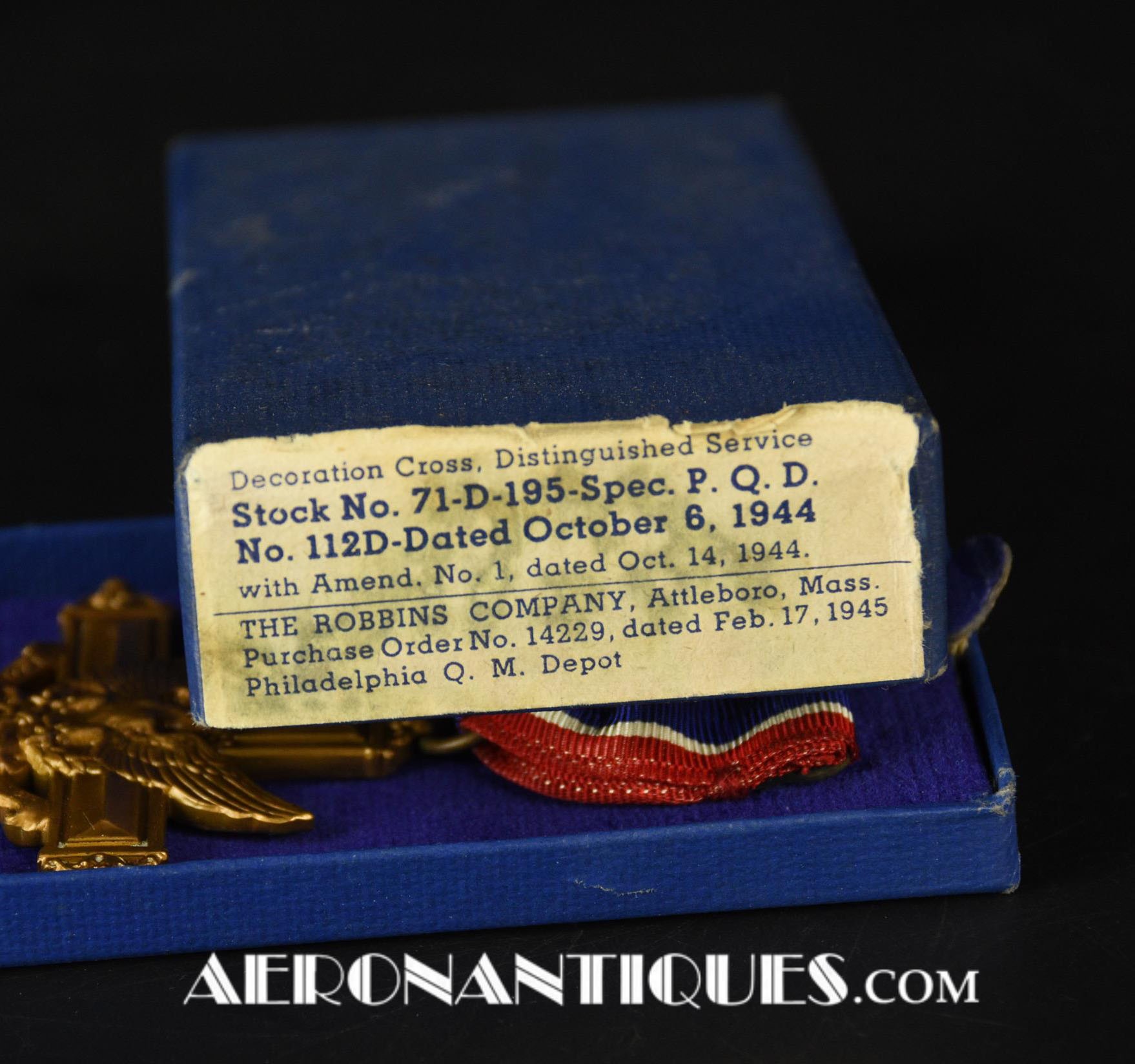 WWII issue Distinguished Service Cross aka DSC in its original dated cardboard box. WWII type fastening device with slot. Gun metal finish, typical of ROBBINS co manufacture, 1945 contract. Second highest US Army distinction awarded for extraordinary heroism not justifying the award of the Medal of Honor.