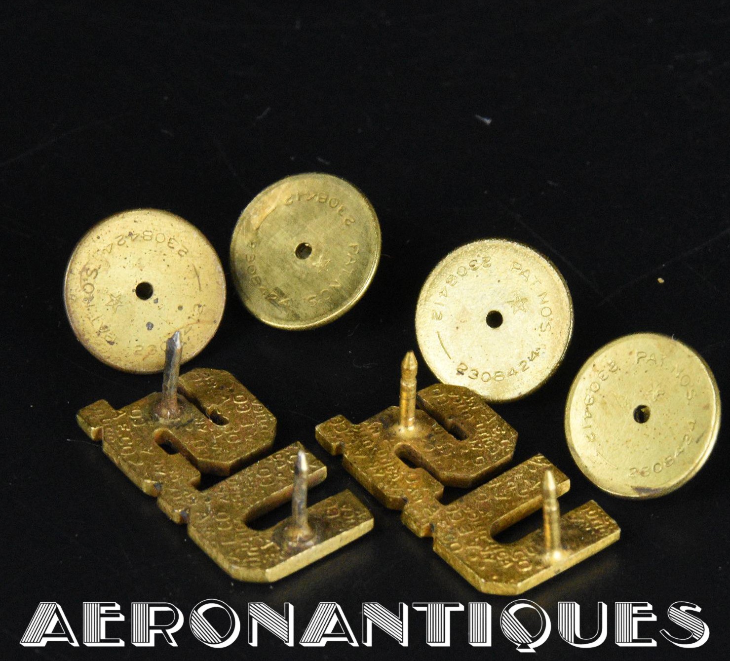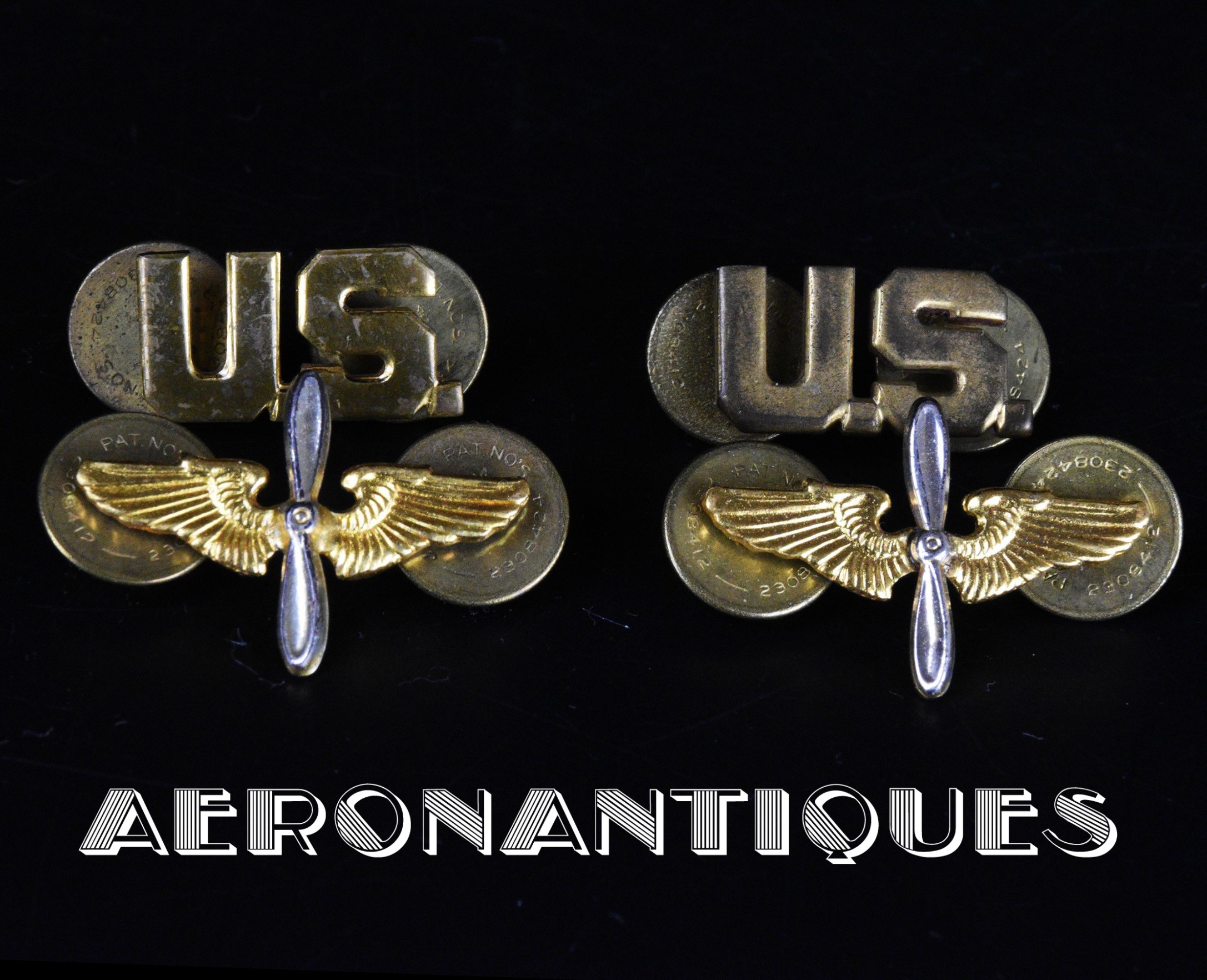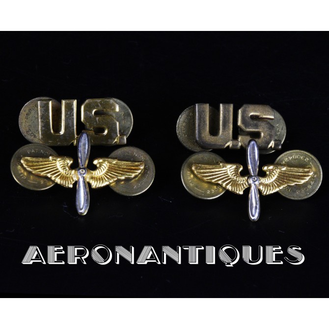 Original WWII US Army Air Force Officers tunic lapel insignias set. 2 winged propellers (two parts construction), 2 U.S. Early US made manufacture with BALLOU plain brass clutch fasteners circa 1942-43. Real matching pairs.