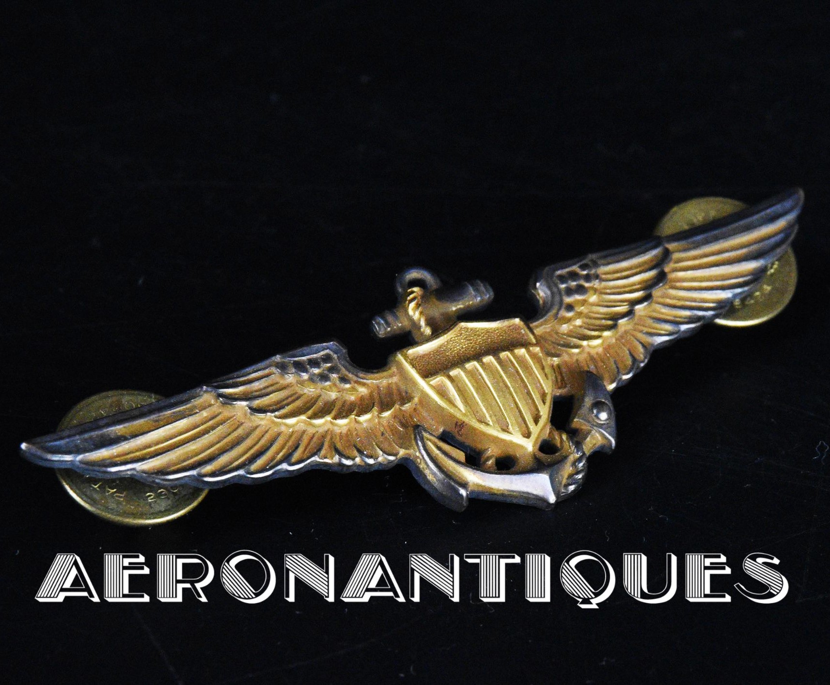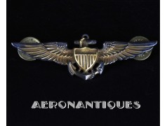 US Naval Aviator qualification wings (US Navy, US Marine Corps or US Coast Guards), full size, 1940's made by HILBORN-HAMBURGER in New-York. Gold plated on sterling. Clutch back with 2nd pattern Ballou clutches (1943-44). Width: 75 mm.
