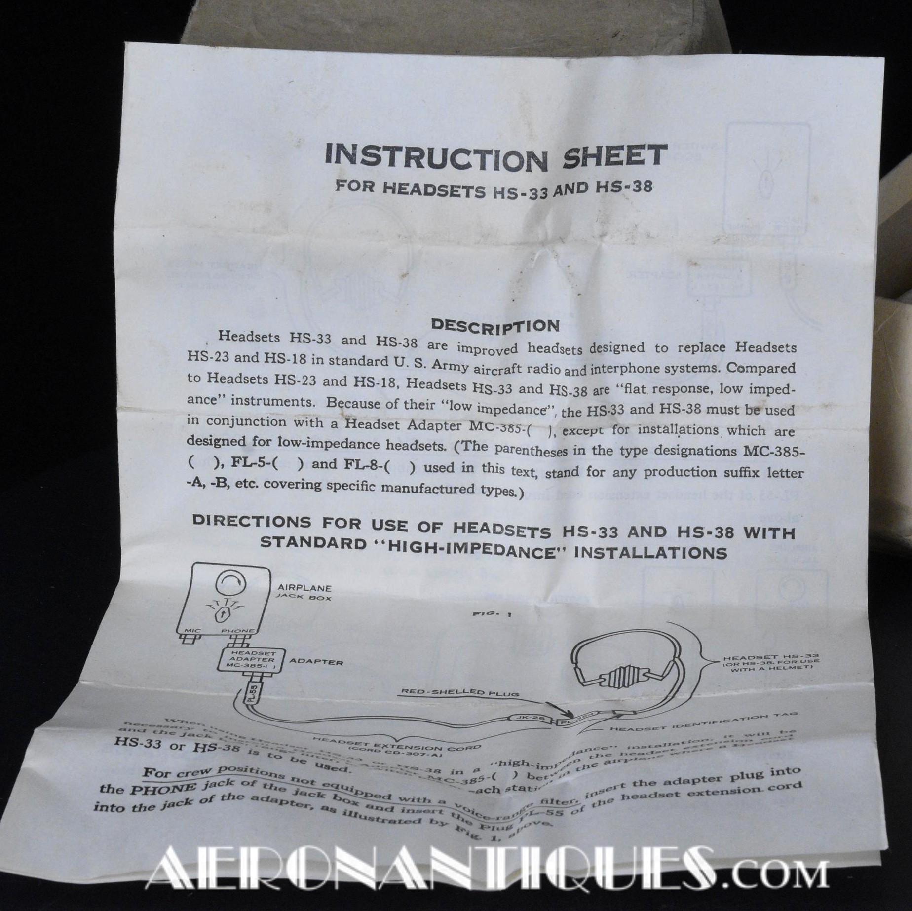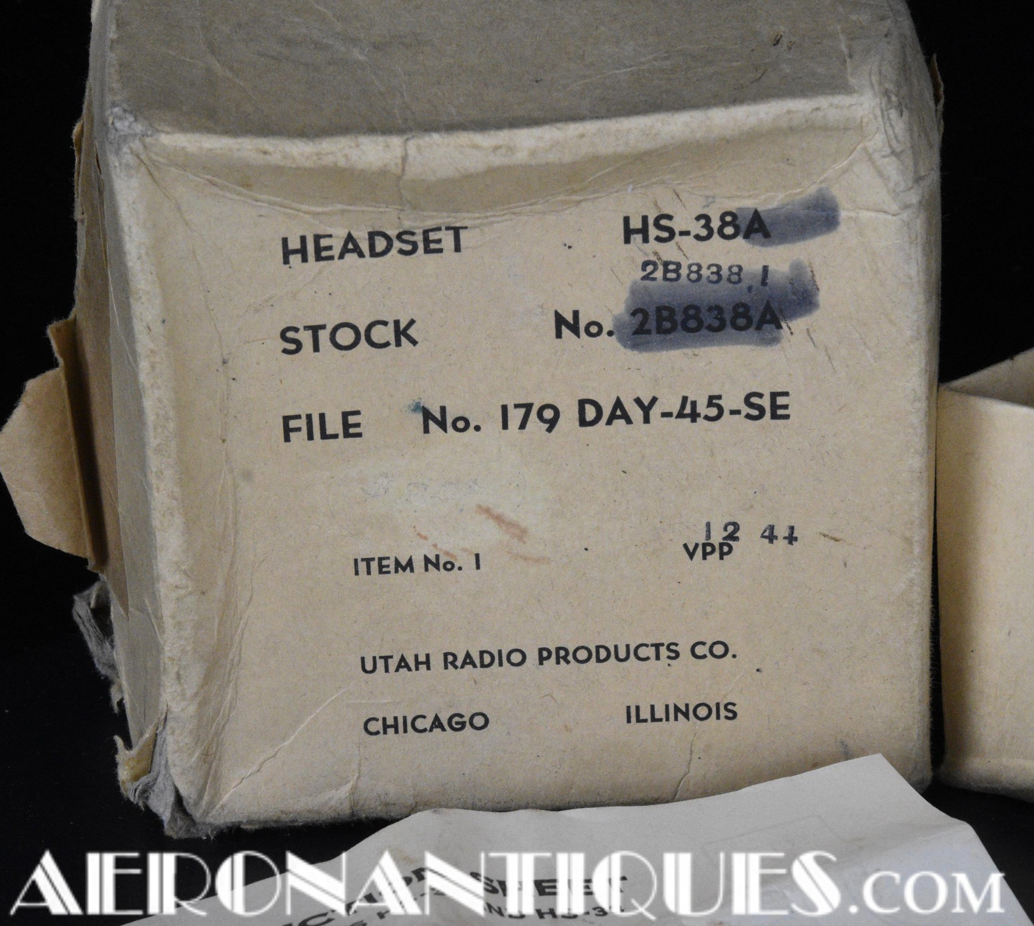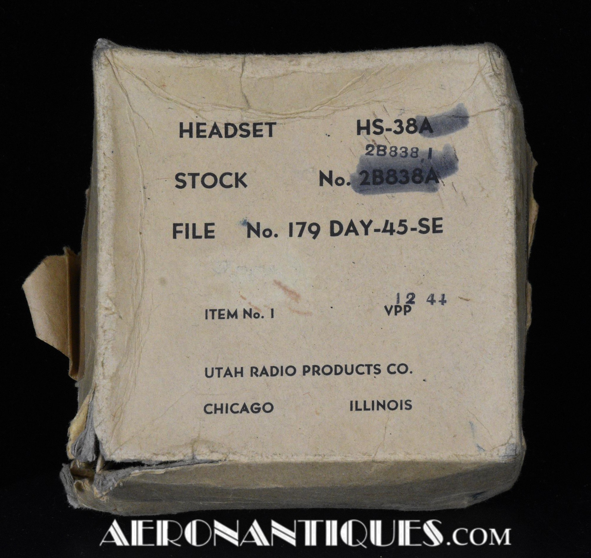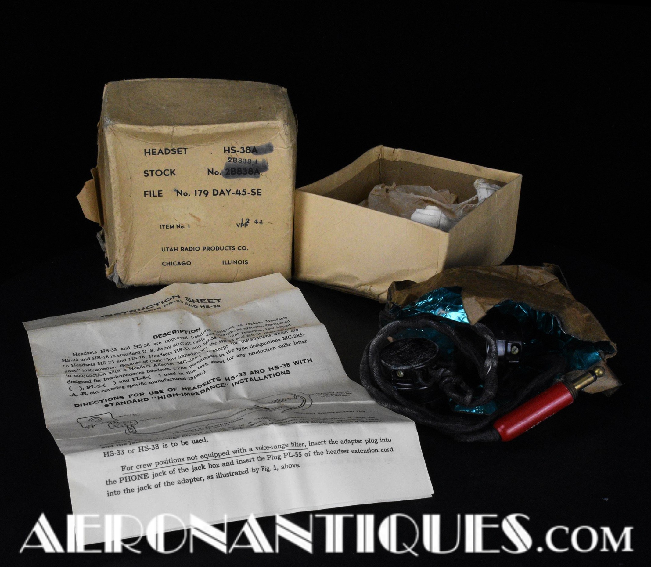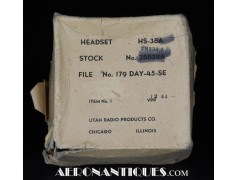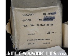 WWII US Army Air Force HS-38 headset composed of ANB-H-1 earphones, communication cable and PL-356 plug for equipping US Army Air Force flying helmets as the A-11, ANH-15, etc. In their original box with assembly and operating instructions. Manufactured by UTAH RADIO PRODUCTS, dated December 1944. Helmet, goggles and oxygen mask are not included.