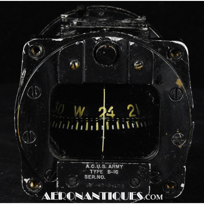 B-16 type direct reading magnetic compass. Dated 1942, manufactured by Bendix Aviation. This type of compass equipped the majority of US Army Air Force aircraft during World War II, from the P-51 Mustang fighter to the B-17 Superfortress bomber. Diameter 80 mm, Depth 95 mm.