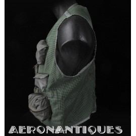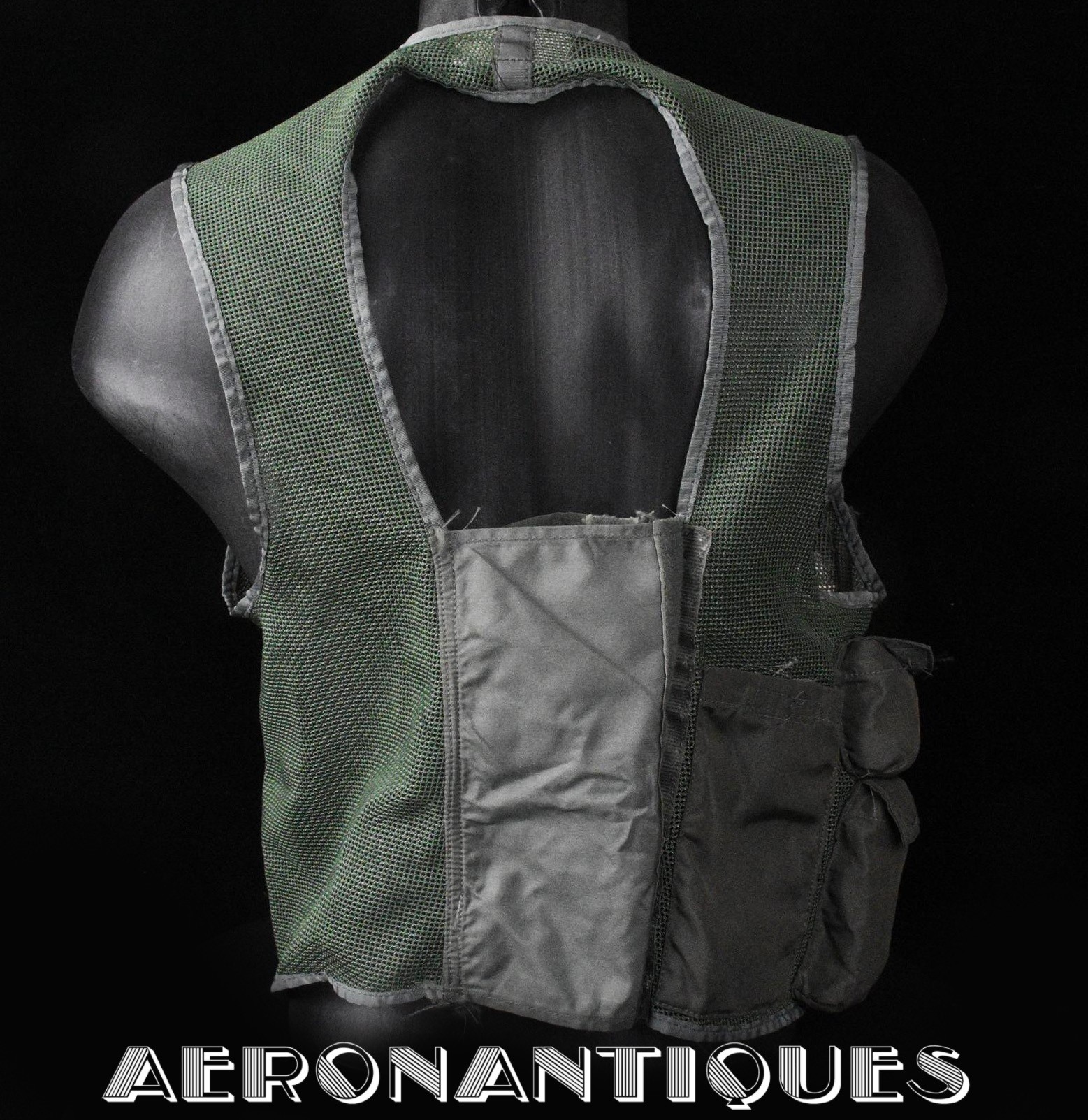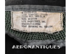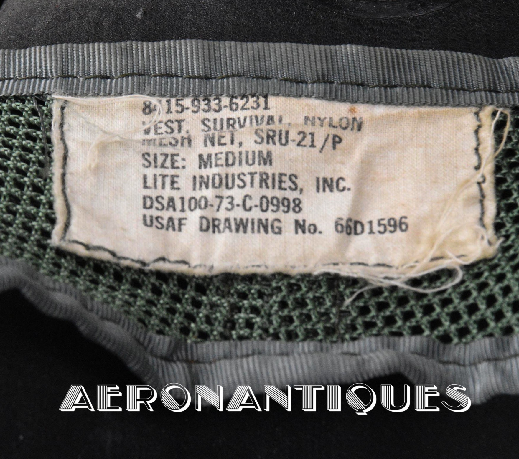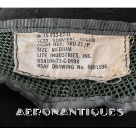 SRU-21/P survival mesh vest for US Air Force & Army pilots. 2nd pattern with hook & pile closing pockets. RT-10 zippered radio pocket. Numerous pockets for survival gear as radio, rations, etc... Size MEDIUM. Made by LITE INDUSTRIES. Dated 1973. Designed and issued to USAF fighter, bomber, transport and observation pilots and aircrews but also used by Army aviation helicopter pilots.
