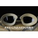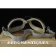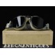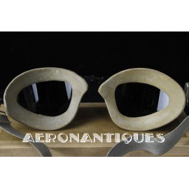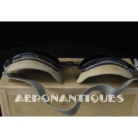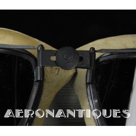 US Army Air Force WWII pilot flying goggles manufactured by AMERICAN OPTICAL with "AO" markings on the adjustable bridge. Pliable unmarked rubber pads. Adjustable gray elastic webbing strap. Tinted mineral lenses. New old stock with original box.