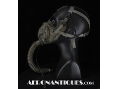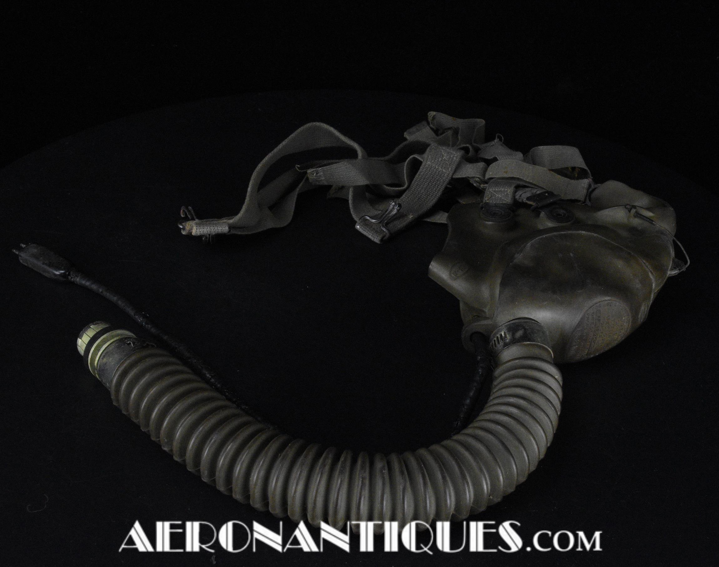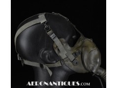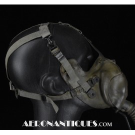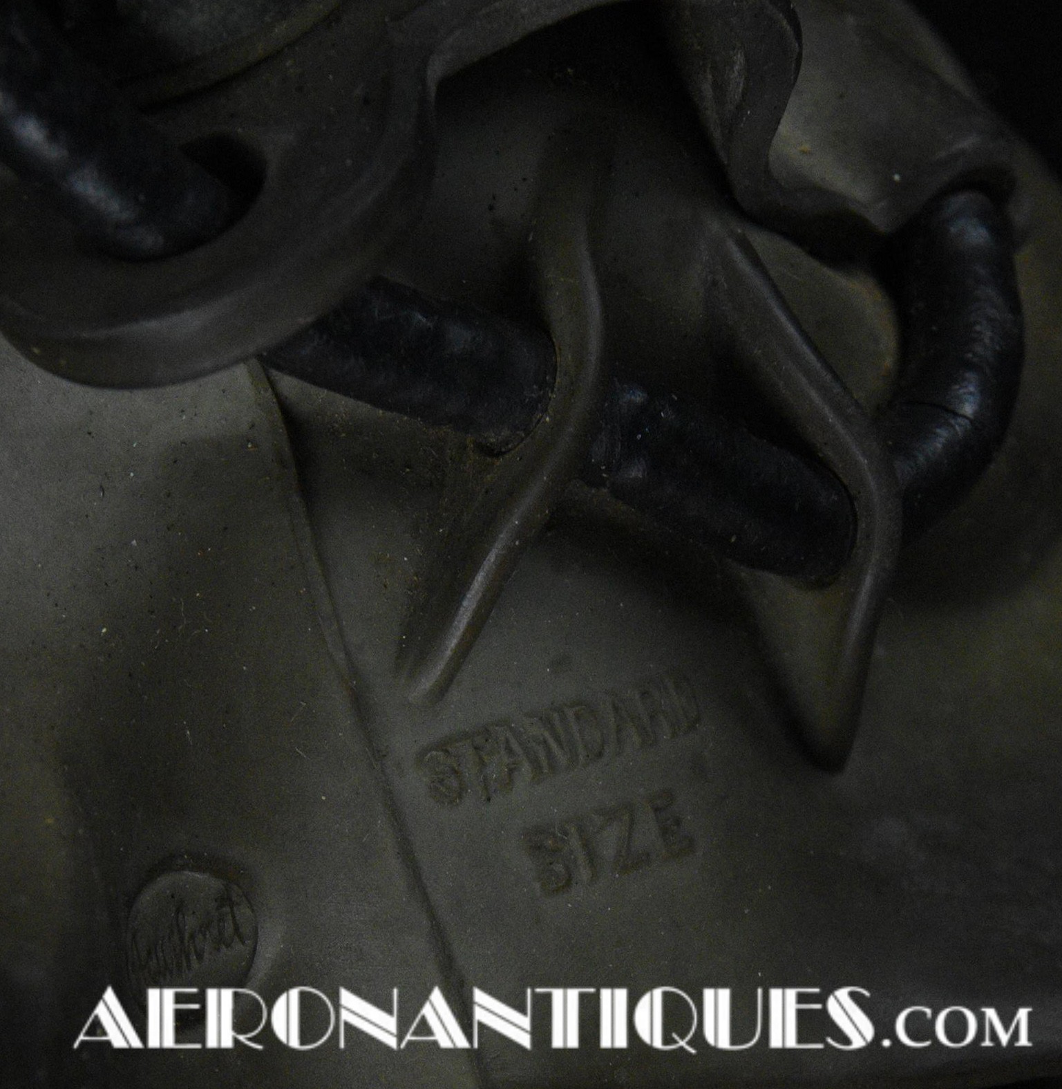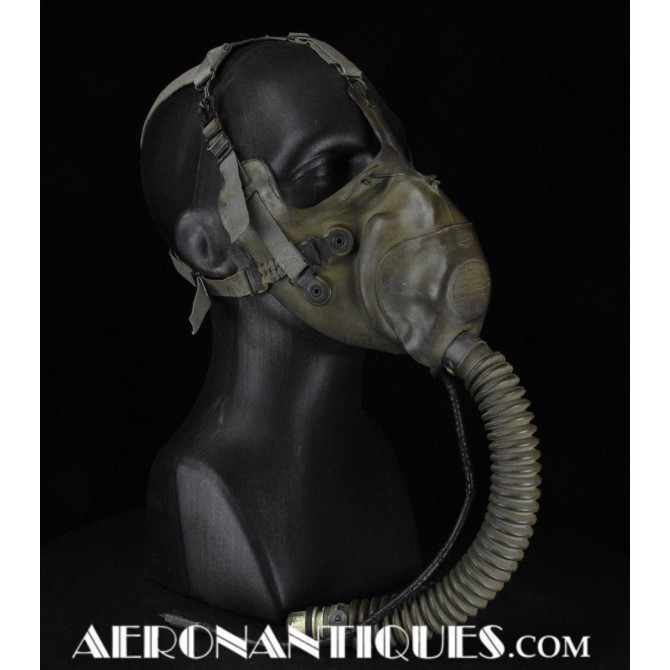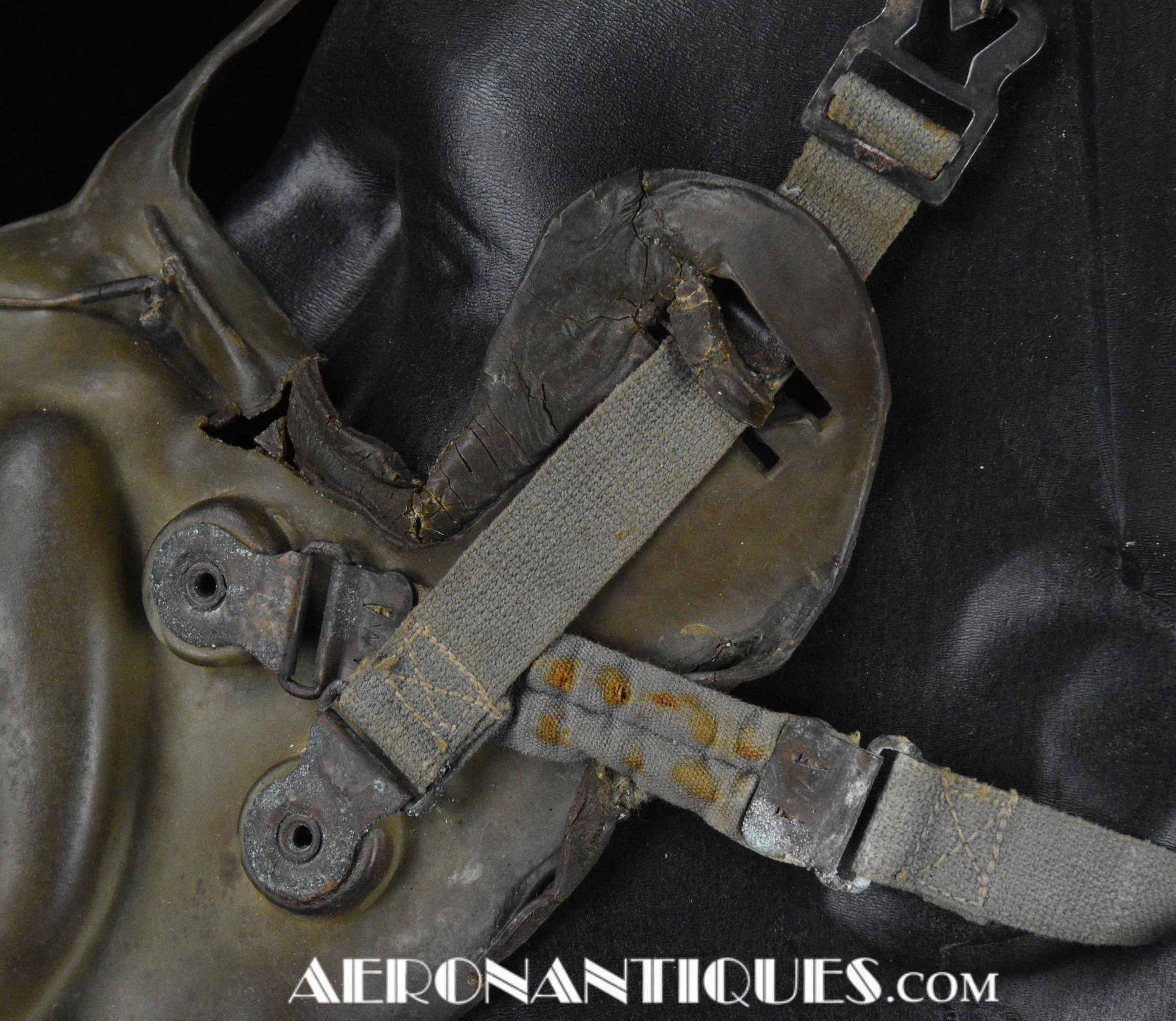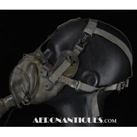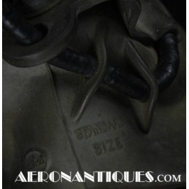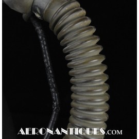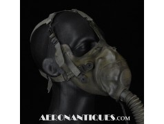 Very rare 1st pattern US Army Air Force regulation pilots and aircrews A-10 flying oxygen mask with 3 points fastening device. Size STANDARD. Dated April 1942. Made by ACUSHNET. Stamped US ARMY AIR FORCE. Despite a tear on the left side, the rubber remained flexible and the hose is intact. Complete with original nose clamp, microphone and its juliet harness to allow the mask to be worn without a helmet. The microphones's cord hardened with time and cracked in places. Scarce model. Considered as very uncomfortable, it will be modified from summer 1943 on. Very hard to find in its original design as most have had their forhead strap cut following field regulations.