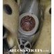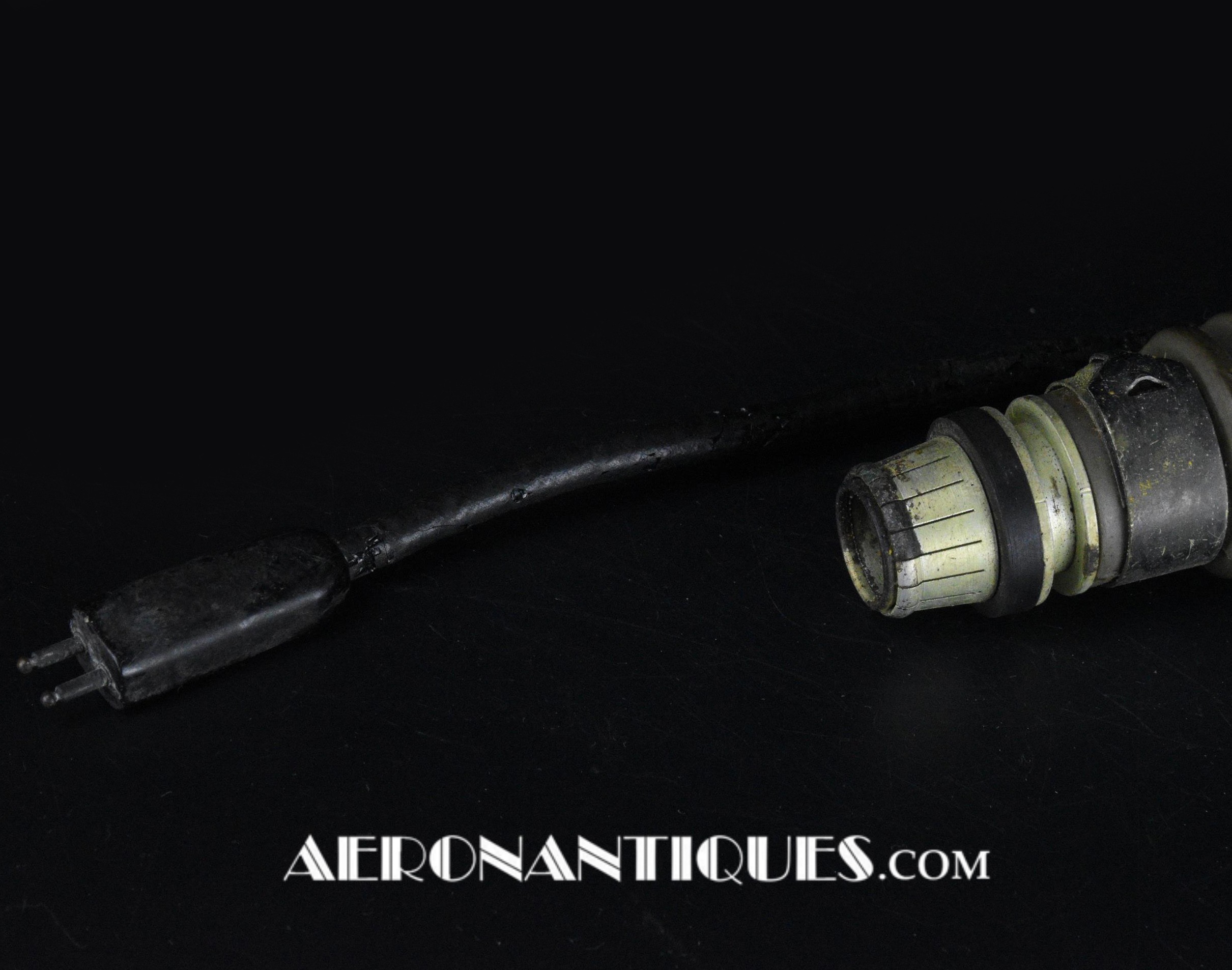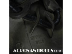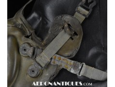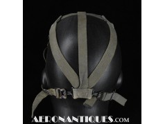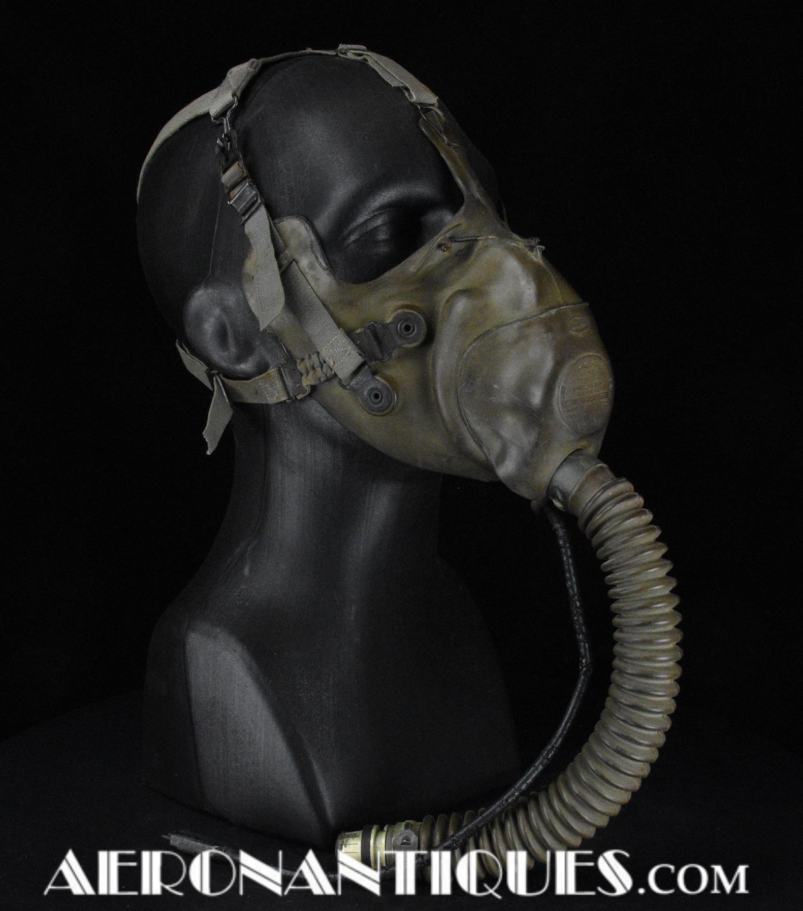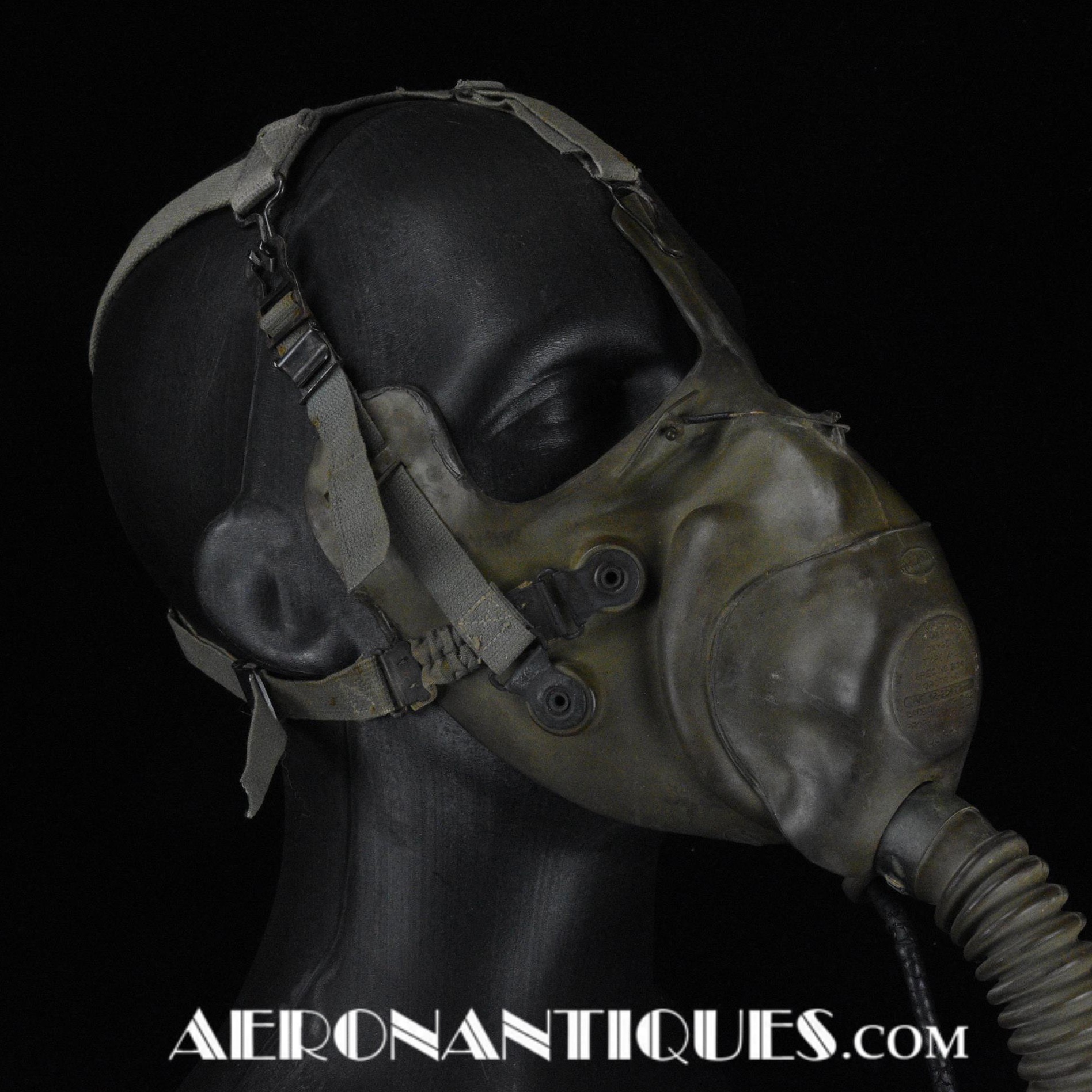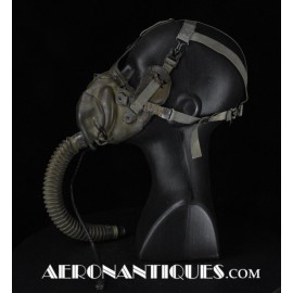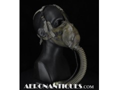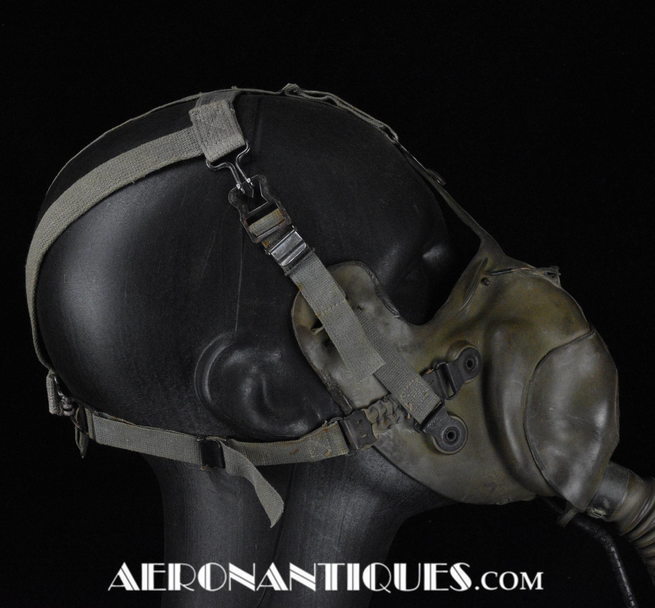 Very rare 1st pattern US Army Air Force regulation pilots and aircrews A-10 flying oxygen mask with 3 points fastening device. Size STANDARD. Dated April 1942. Made by ACUSHNET. Stamped US ARMY AIR FORCE. Despite a tear on the left side, the rubber remained flexible and the hose is intact. Complete with original nose clamp, microphone and its juliet harness to allow the mask to be worn without a helmet. The microphones's cord hardened with time and cracked in places. Scarce model. Considered as very uncomfortable, it will be modified from summer 1943 on. Very hard to find in its original design as most have had their forhead strap cut following field regulations.
