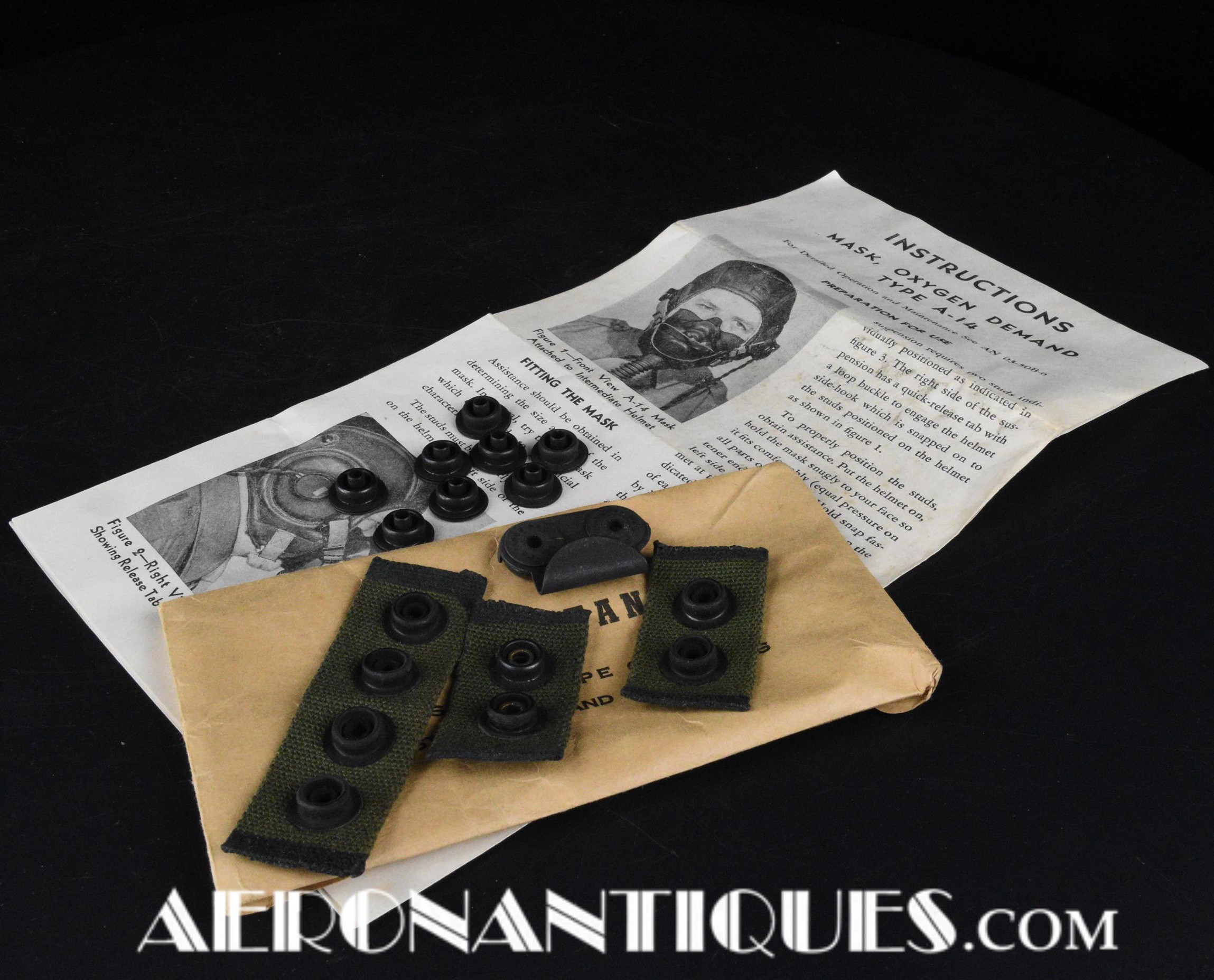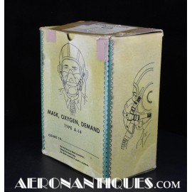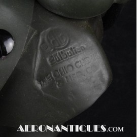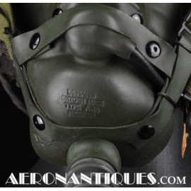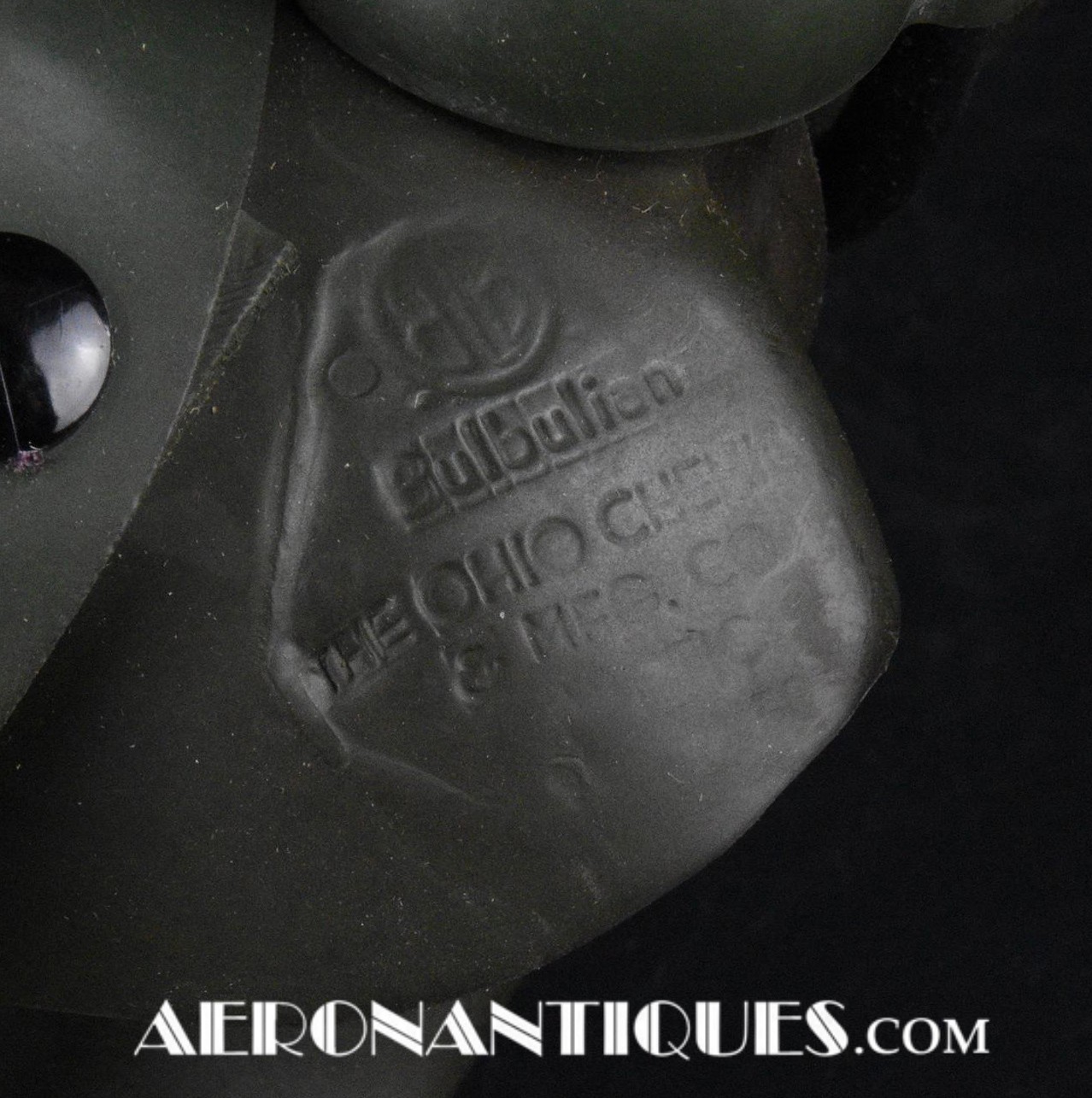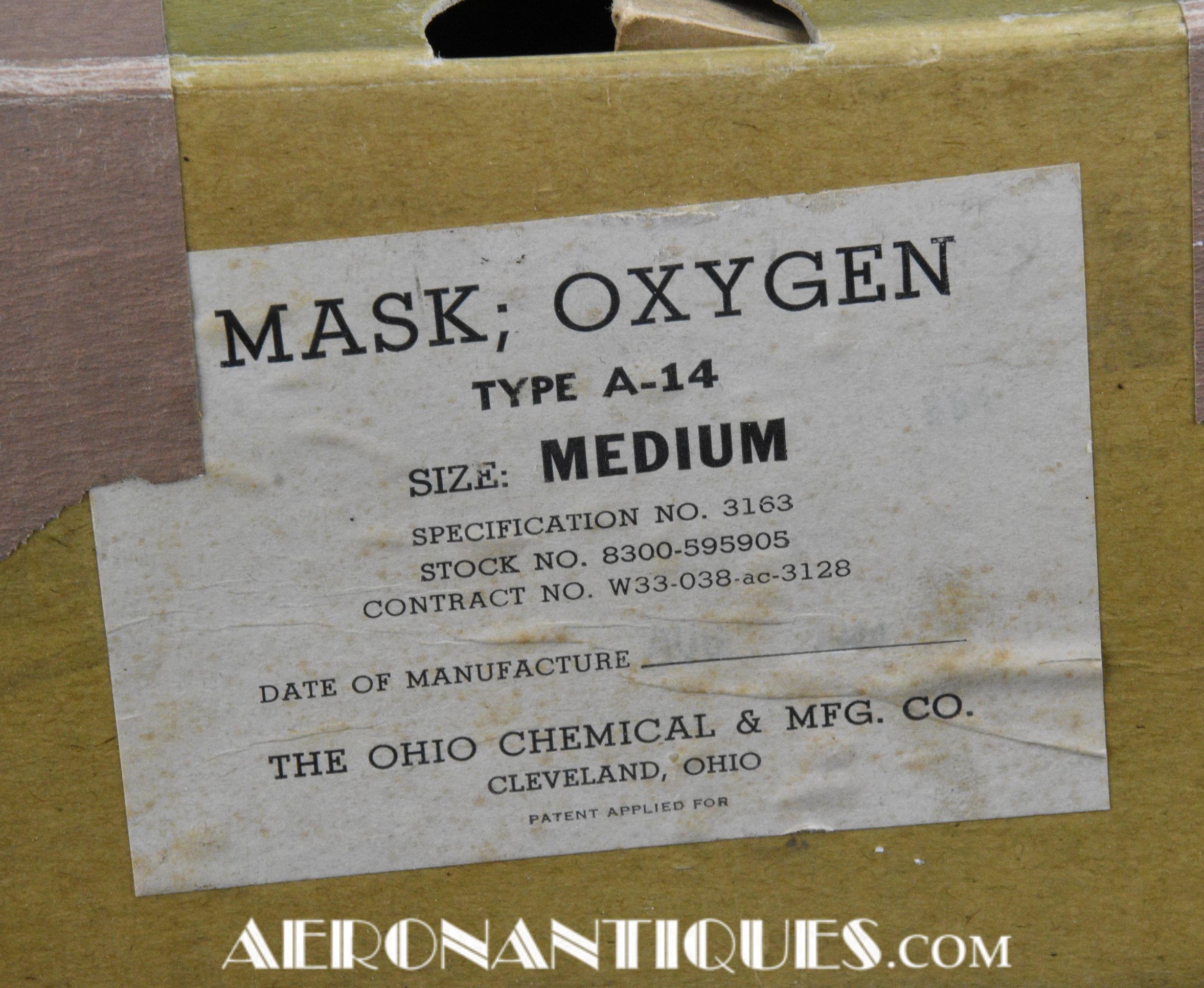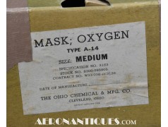 A-14 US Army Air Force regulation flying oxygen mask. Size MEDIUM. Dated 01/45. Made by OHIO CHEMICAL Co. Complete with storage box, instructions and accessories. New old stock, pliable with strong rubber fastening harness. Also included the originally fitted ANB-M-C1 microphone. Standardized on July 1943 this mask was issued to Army Air Force, Navy and USMC pilots during WWII. Helmet and display bust aren't included.