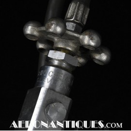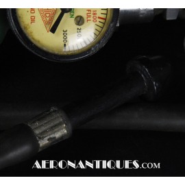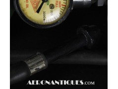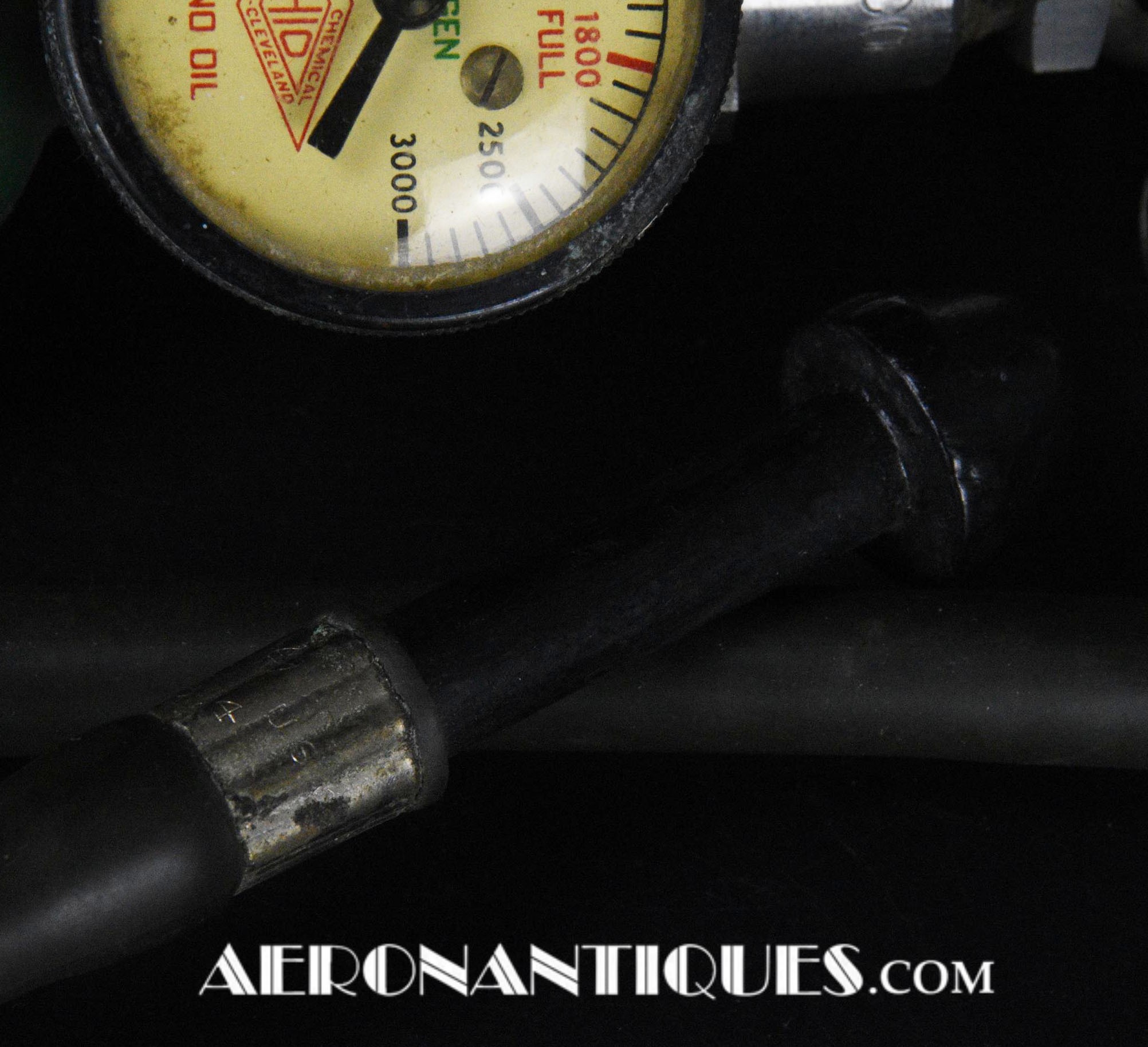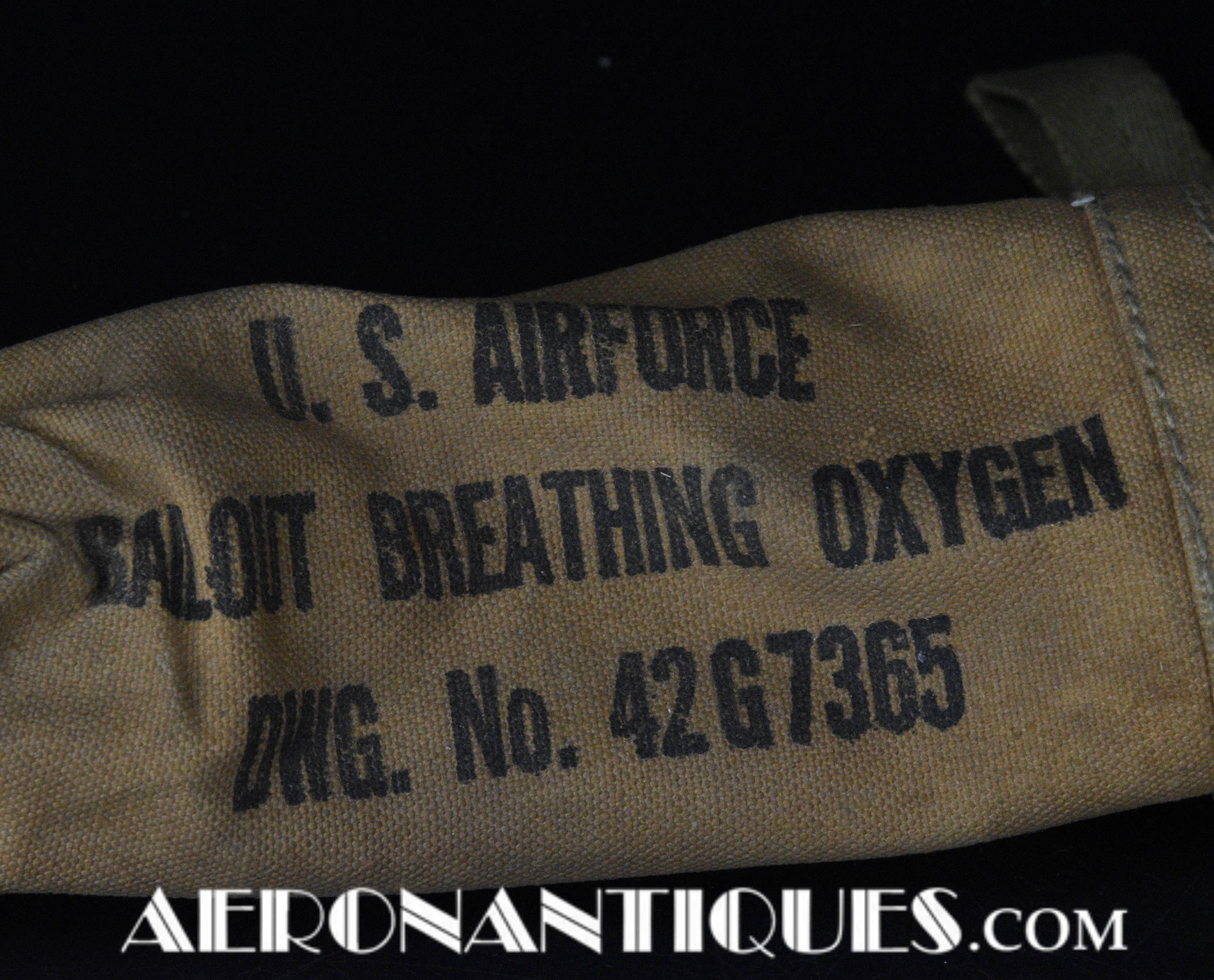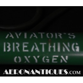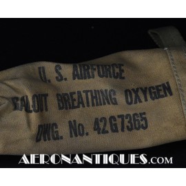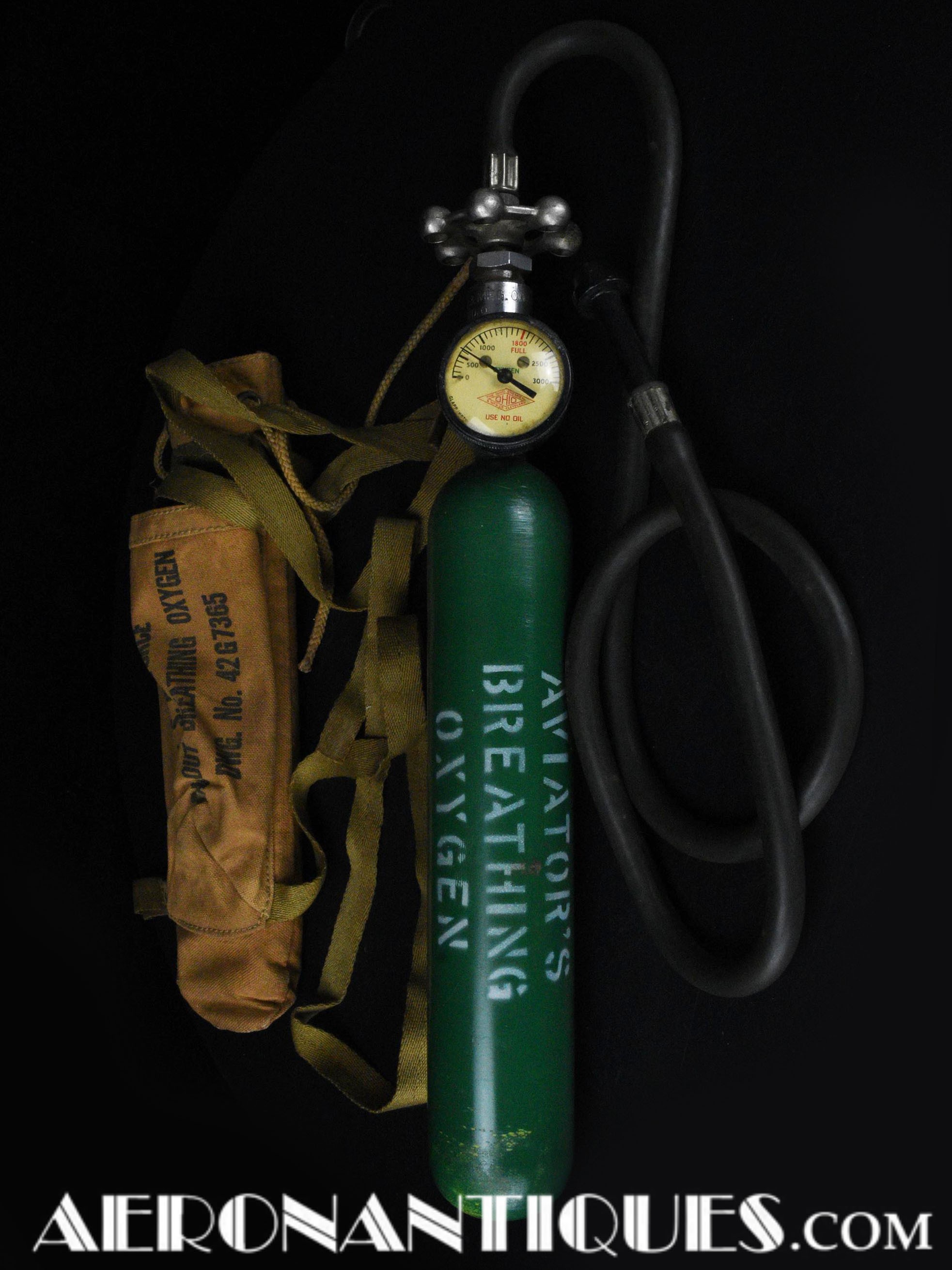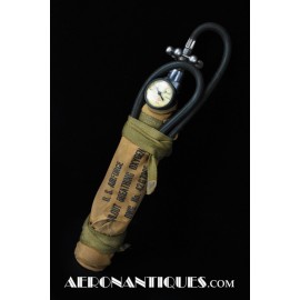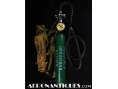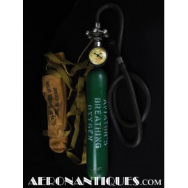 H-1 Bail Out oxygen bottle, complete with cover (full length fastening straps), original matching manometer, tube and original mouth piece, for fighter pilots and bomber aircrews. 1st pattern with the wheel type valve. Dated February 1944 on neck. Made by OHIO Mfg Co. Designed to provide 10 minutes of oxygen at high altitude in case of failure of the aircraft main oxygen system or to bail out if the airplane couldn't be taken to a lower altitude before abandoning it. Usually strapped on the thigh or parachute's harness as can be seen on this period pic of 8th Air Force Ace Francis Gabreski. Mint condition.