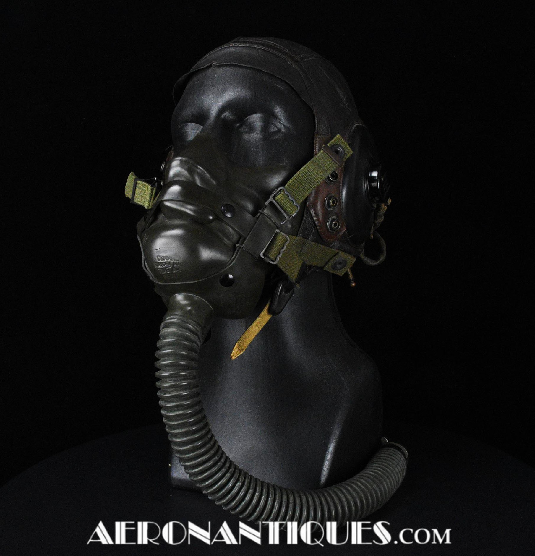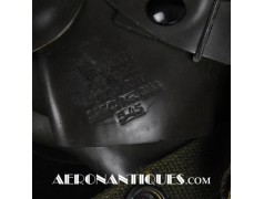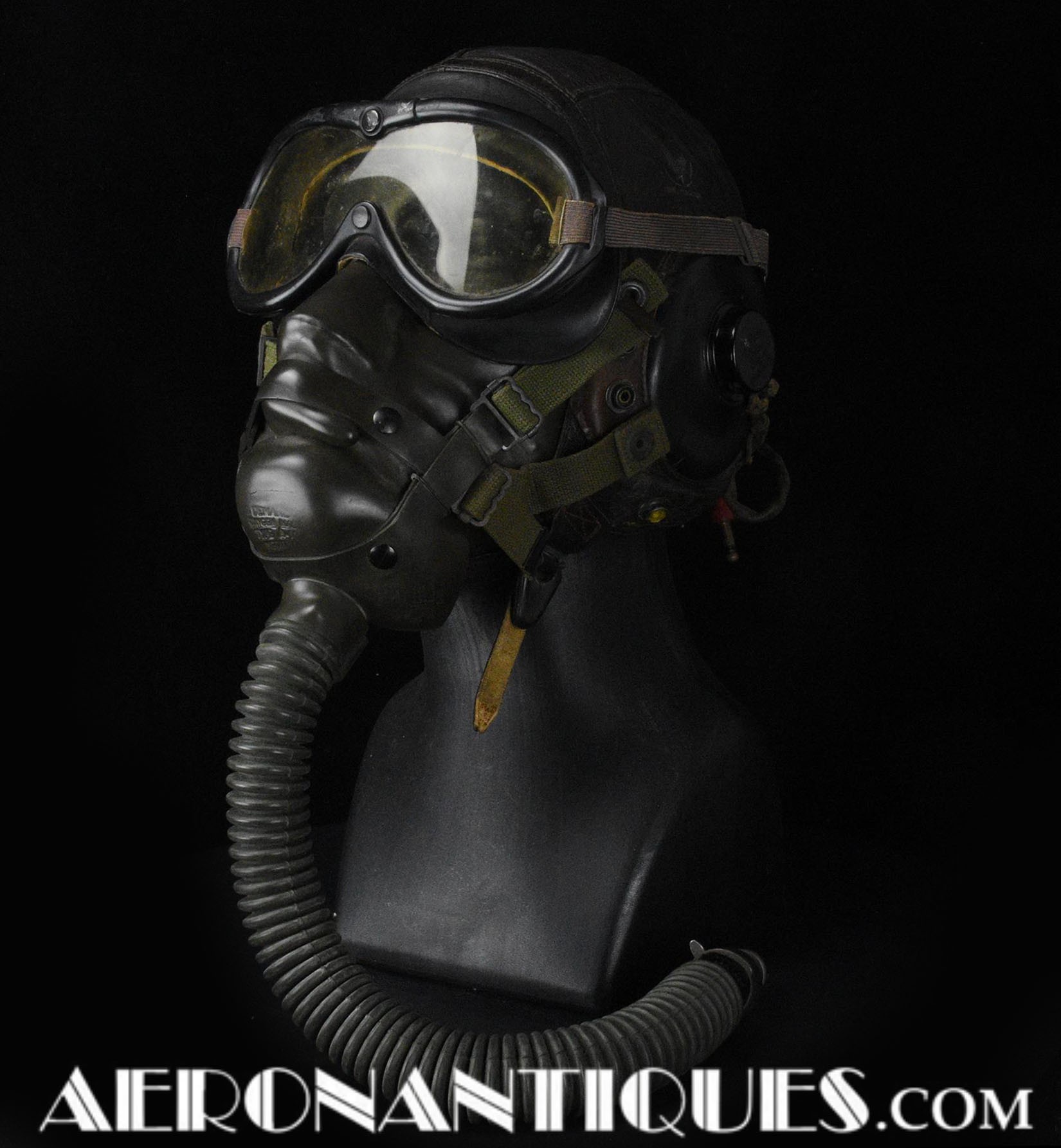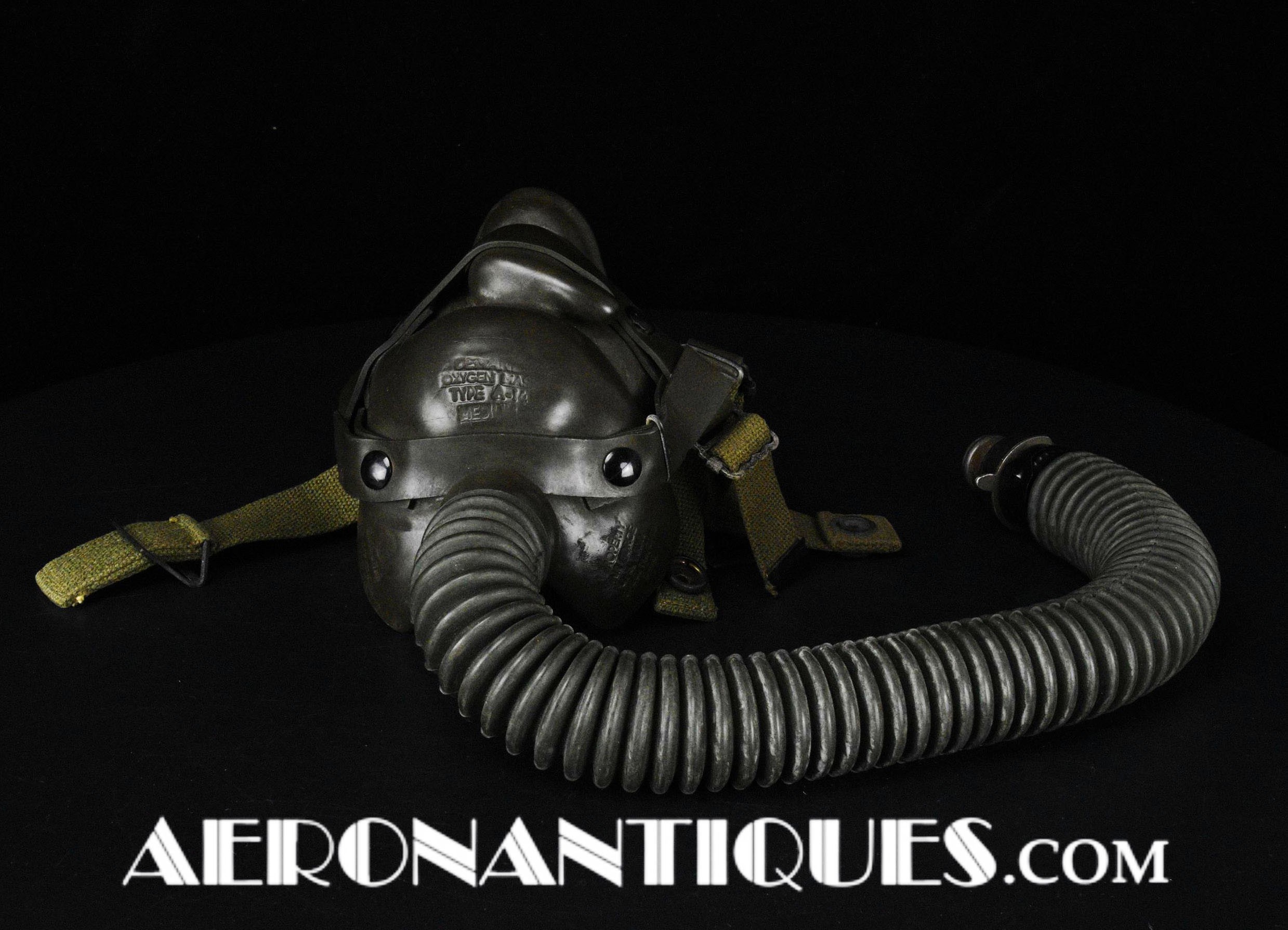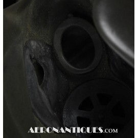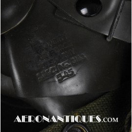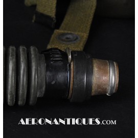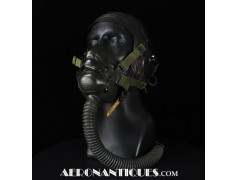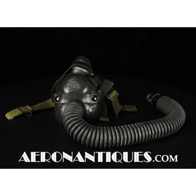 A-14 US Army Air Force regulation flying oxygen mask. Size MEDIUM. Dated 05/45. Made by OHIO CHEMICAL Co. Good condition, pliable with rubber fastening harness not torn as often seen on many examples. Black rubber anti-freeze roundels. Standardized on July 1943 this mask was issued to Army Air Force, Navy and USMC pilots during WWII. Helmet, goggles and display bust aren't included.