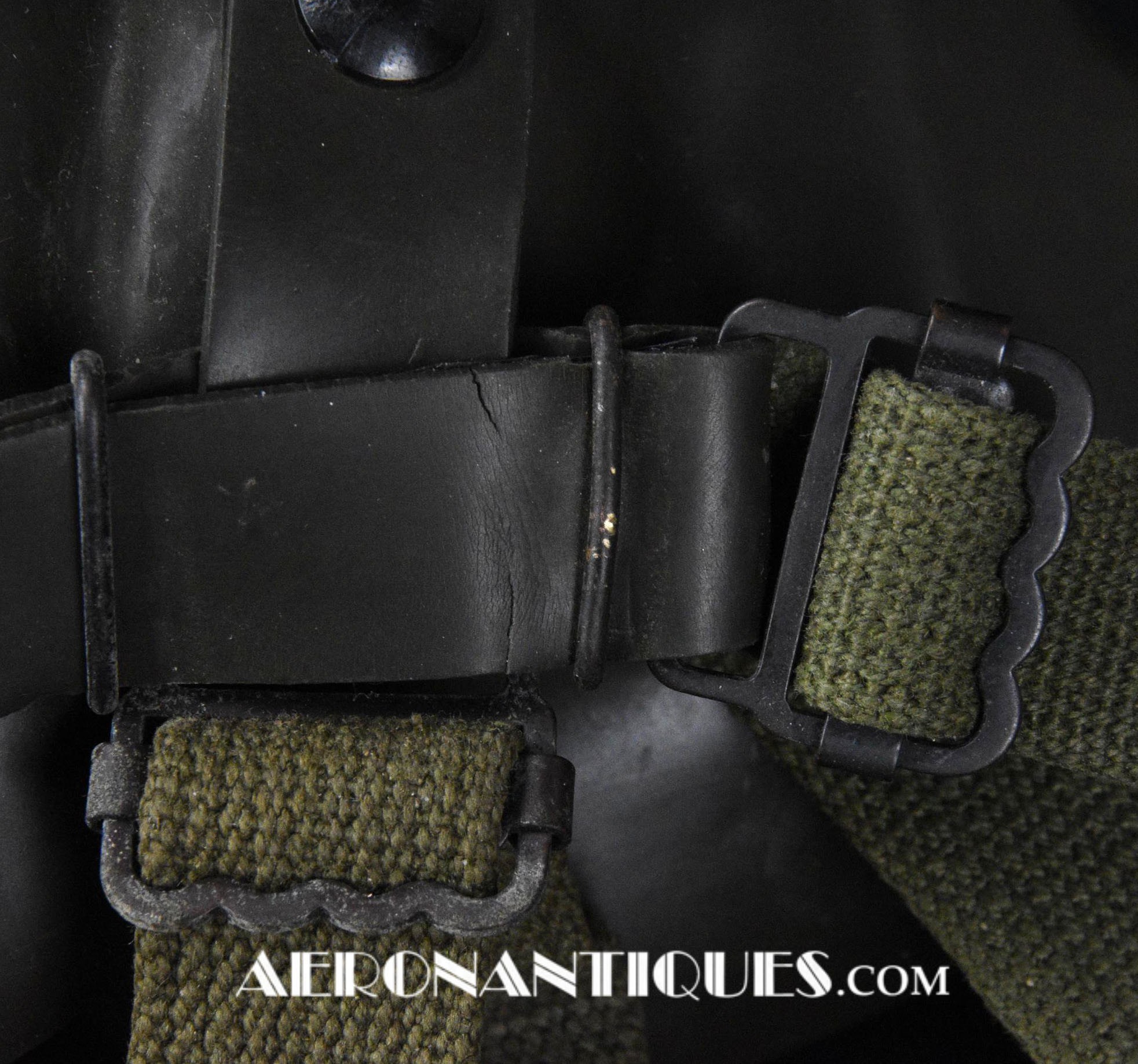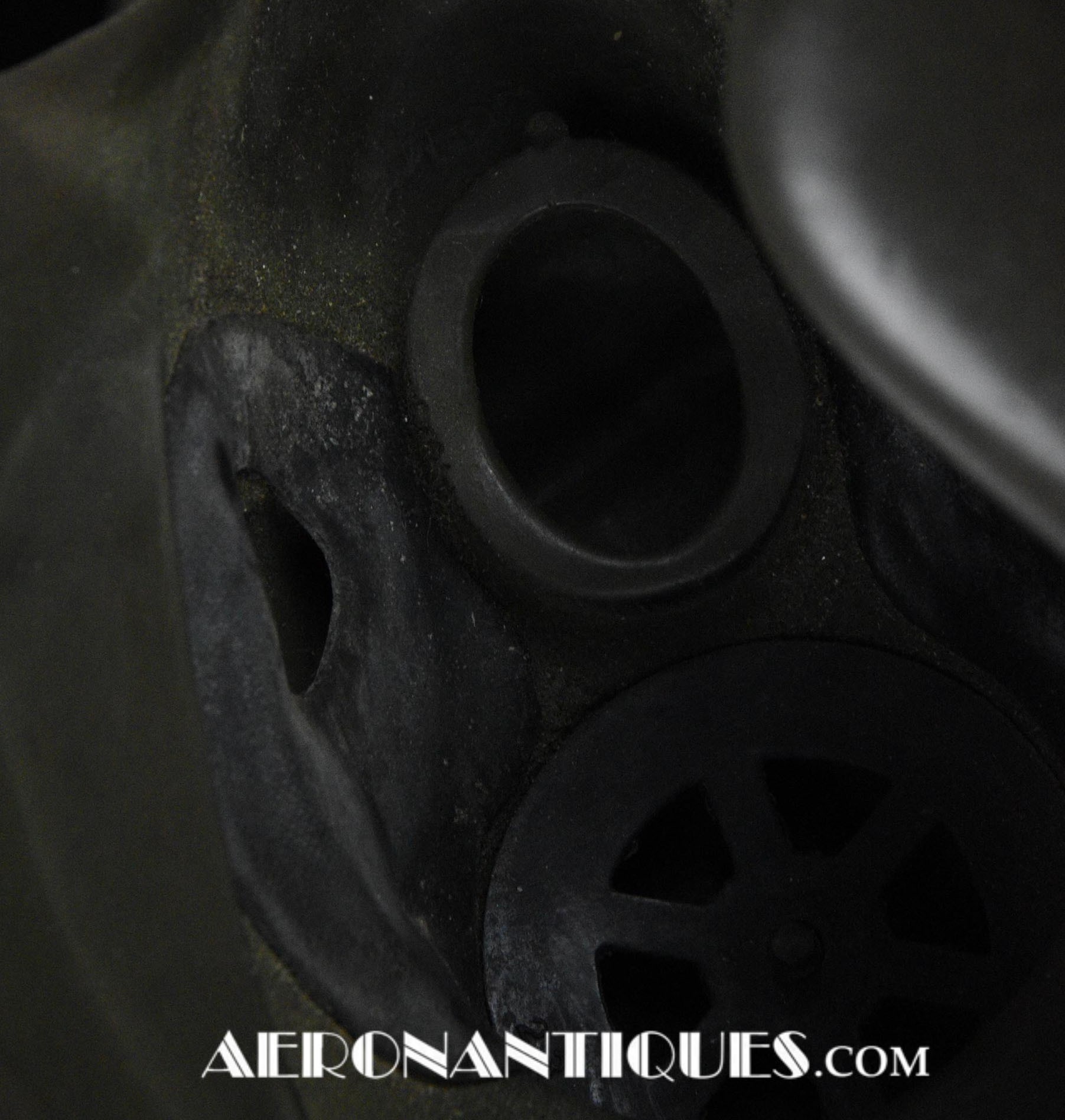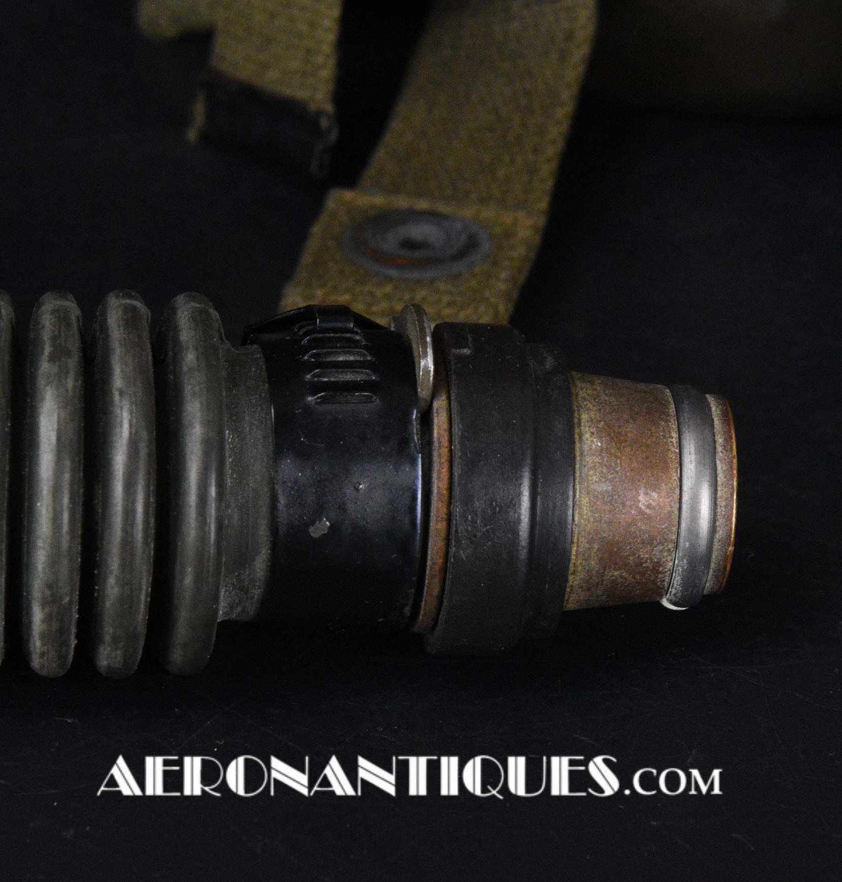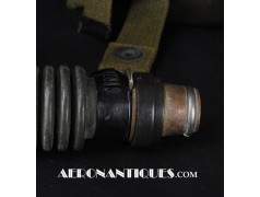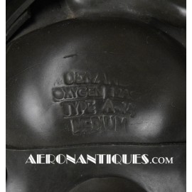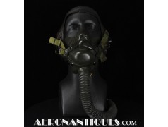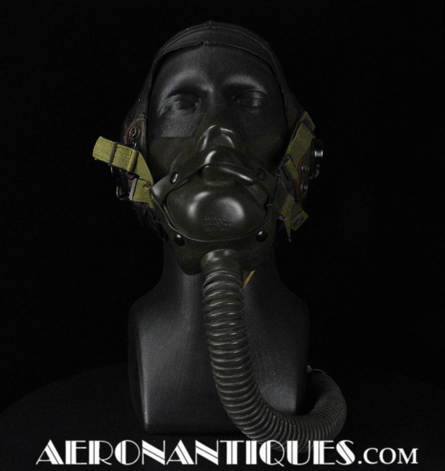 A-14 US Army Air Force regulation flying oxygen mask. Size MEDIUM. Dated 05/45. Made by OHIO CHEMICAL Co. Good condition, pliable with rubber fastening harness not torn as often seen on many examples. Black rubber anti-freeze roundels. Standardized on July 1943 this mask was issued to Army Air Force, Navy and USMC pilots during WWII. Helmet, goggles and display bust aren't included.