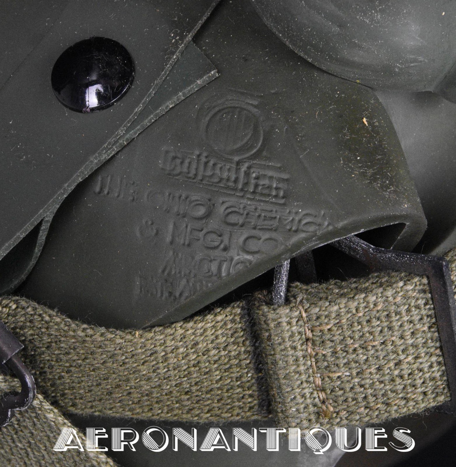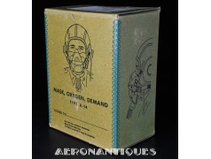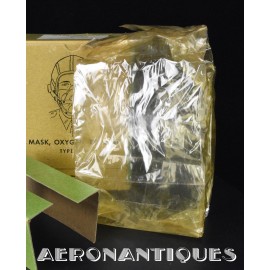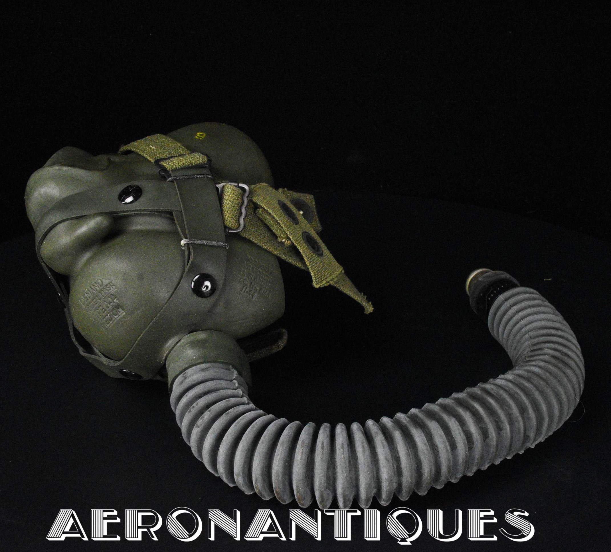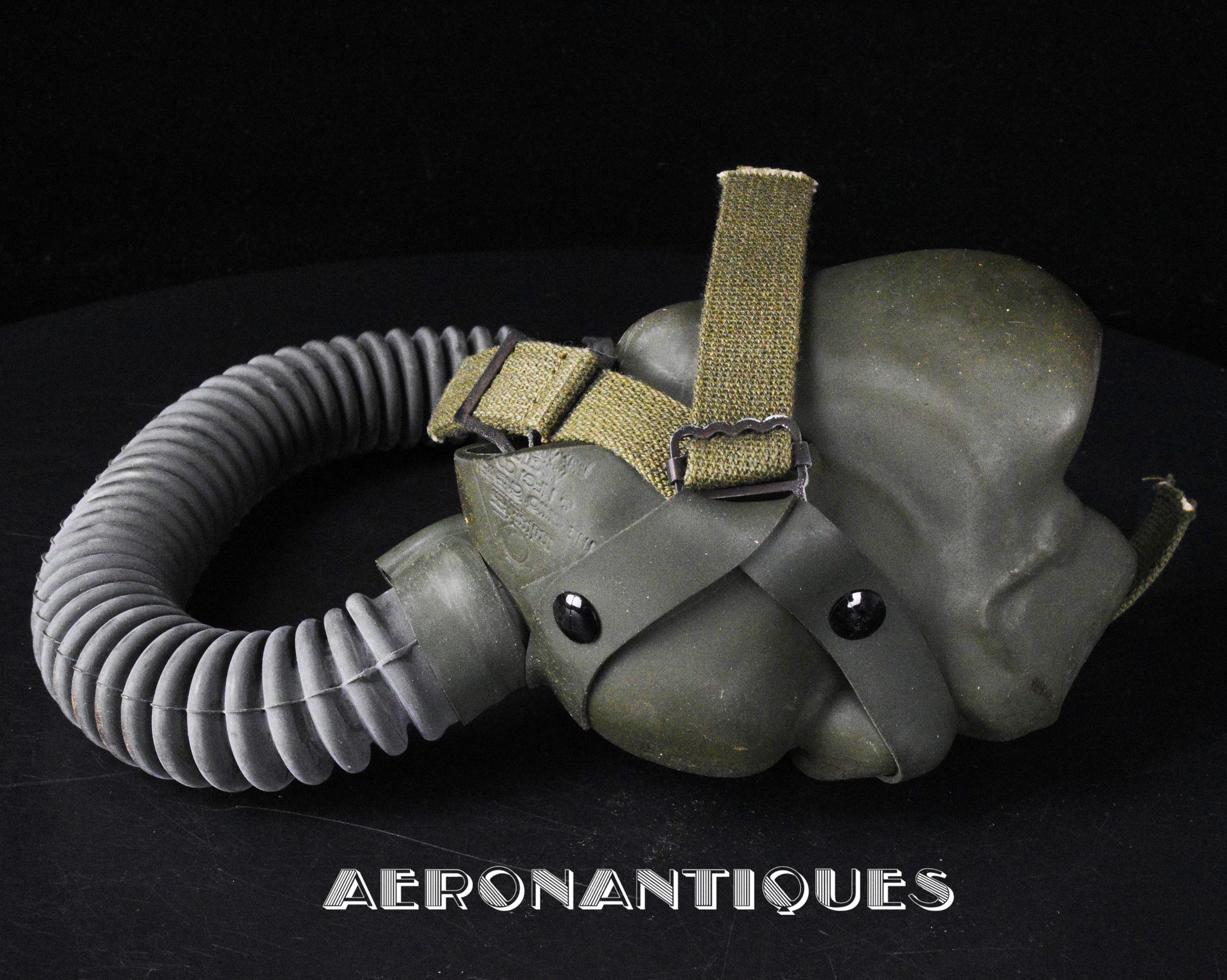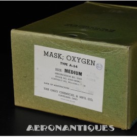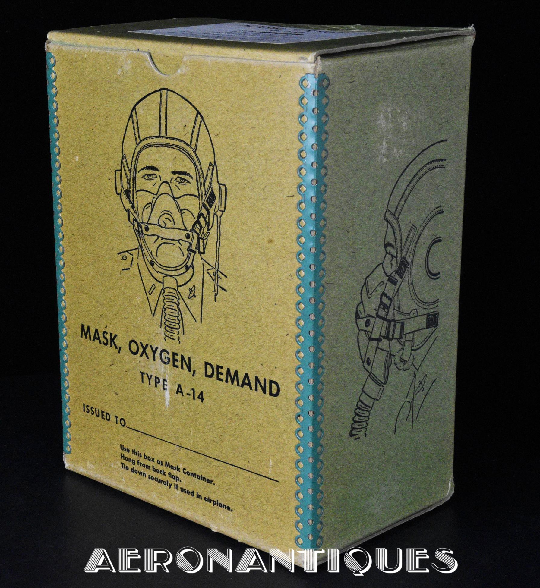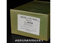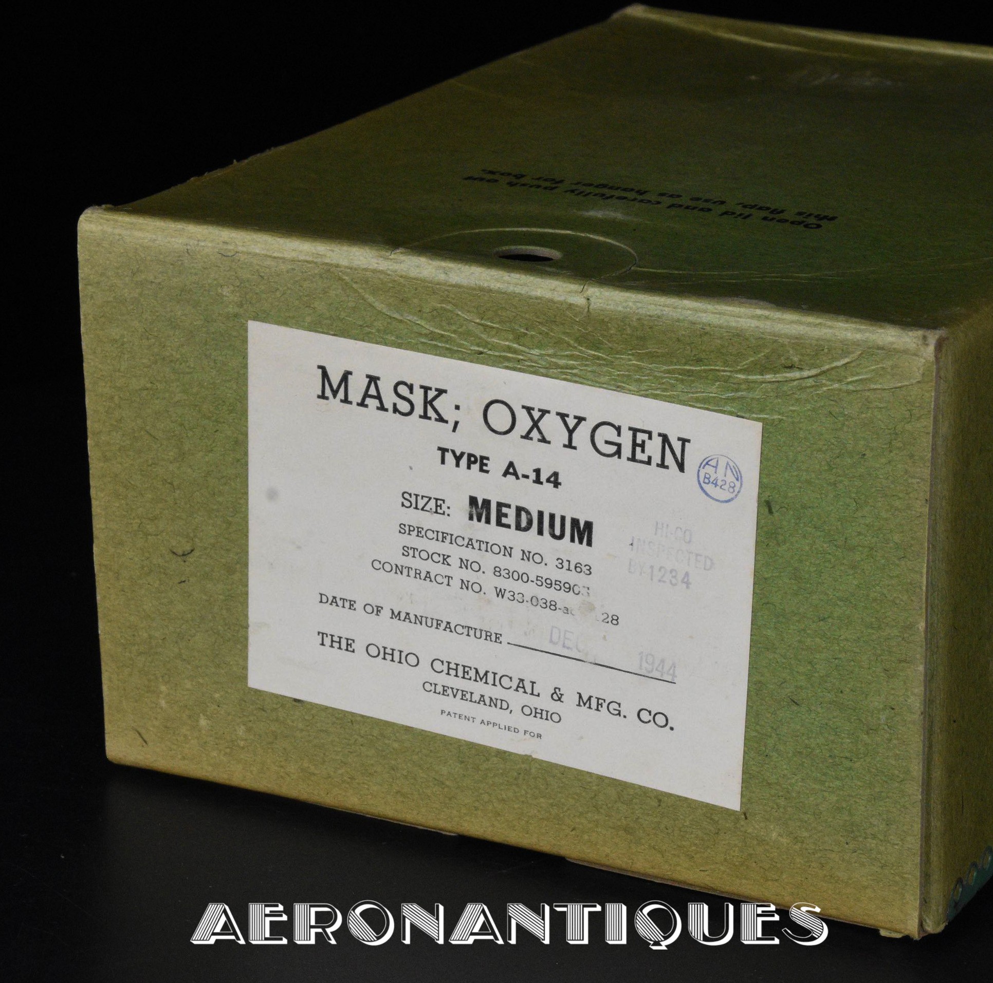 A-14 US Army Air Force regulation flying oxygen mask. Size MEDIUM. Dated 11/44. Made by OHIO CHEMICAL Co. Complete with storage box, instructions and accessories. New old stock, pliable with strong rubber fastening harness. Standardized on July 1943 this mask was issued to Army Air Force, Navy and USMC pilots during WWII. Helmet and display bust aren't included.