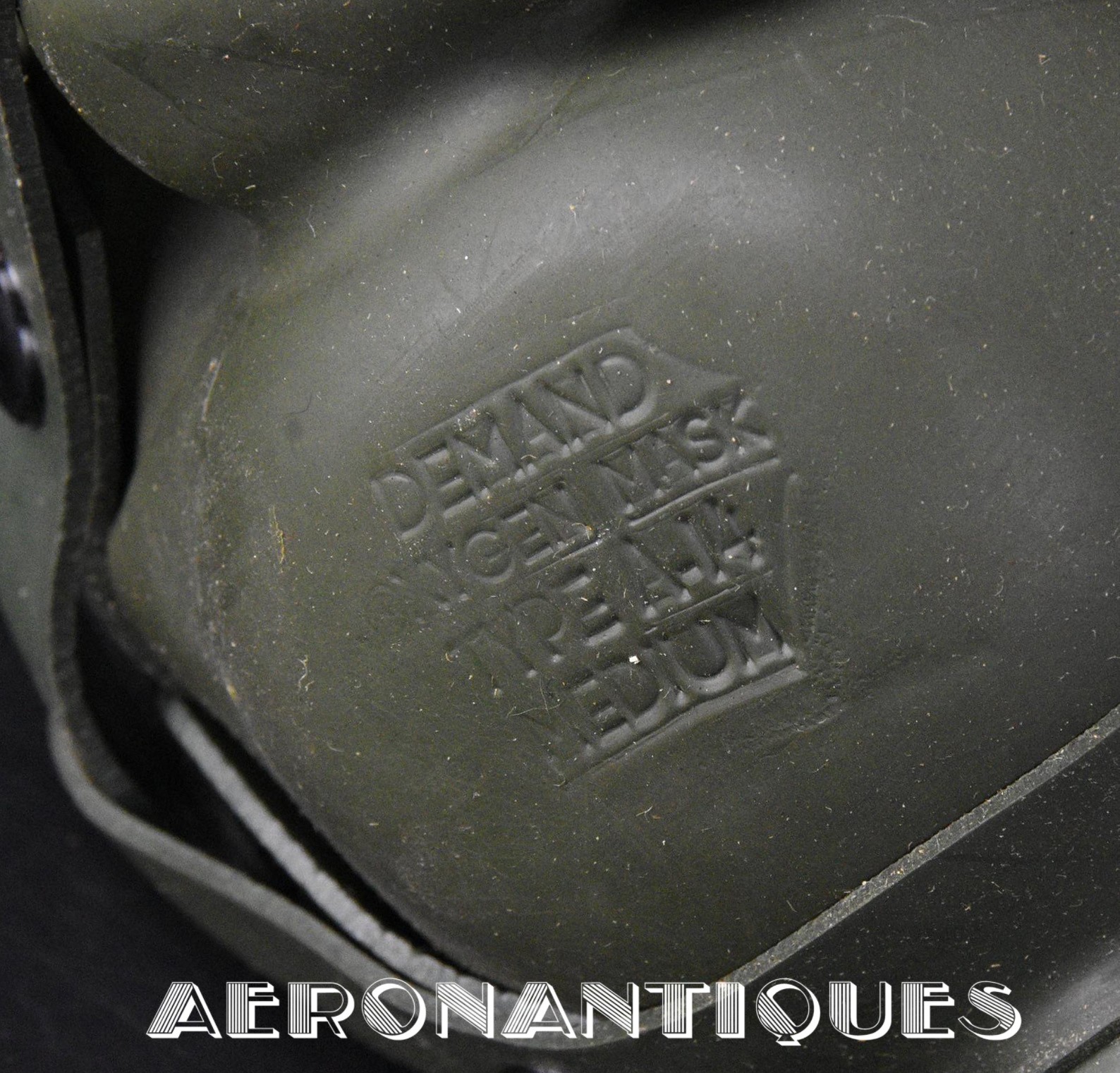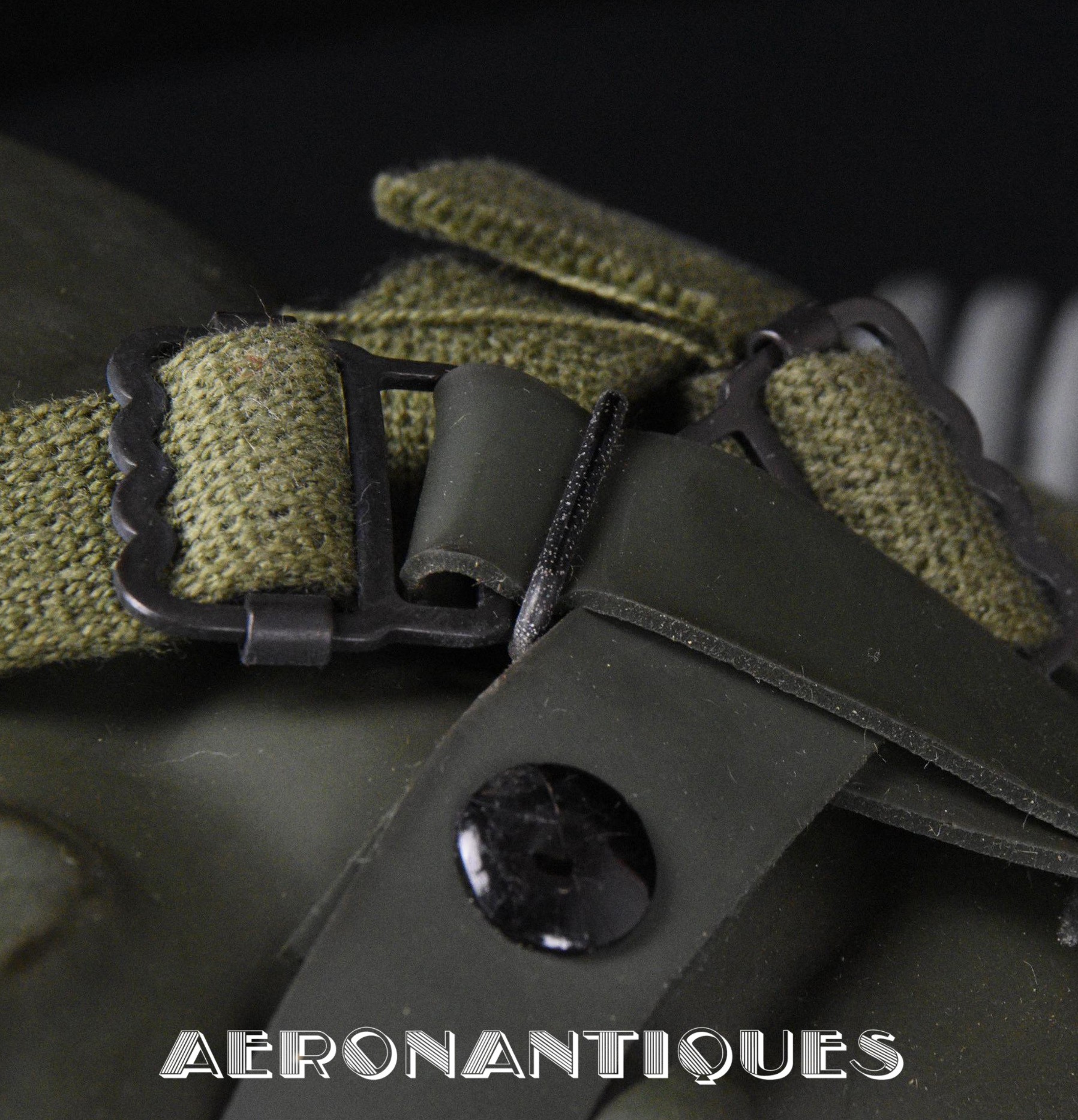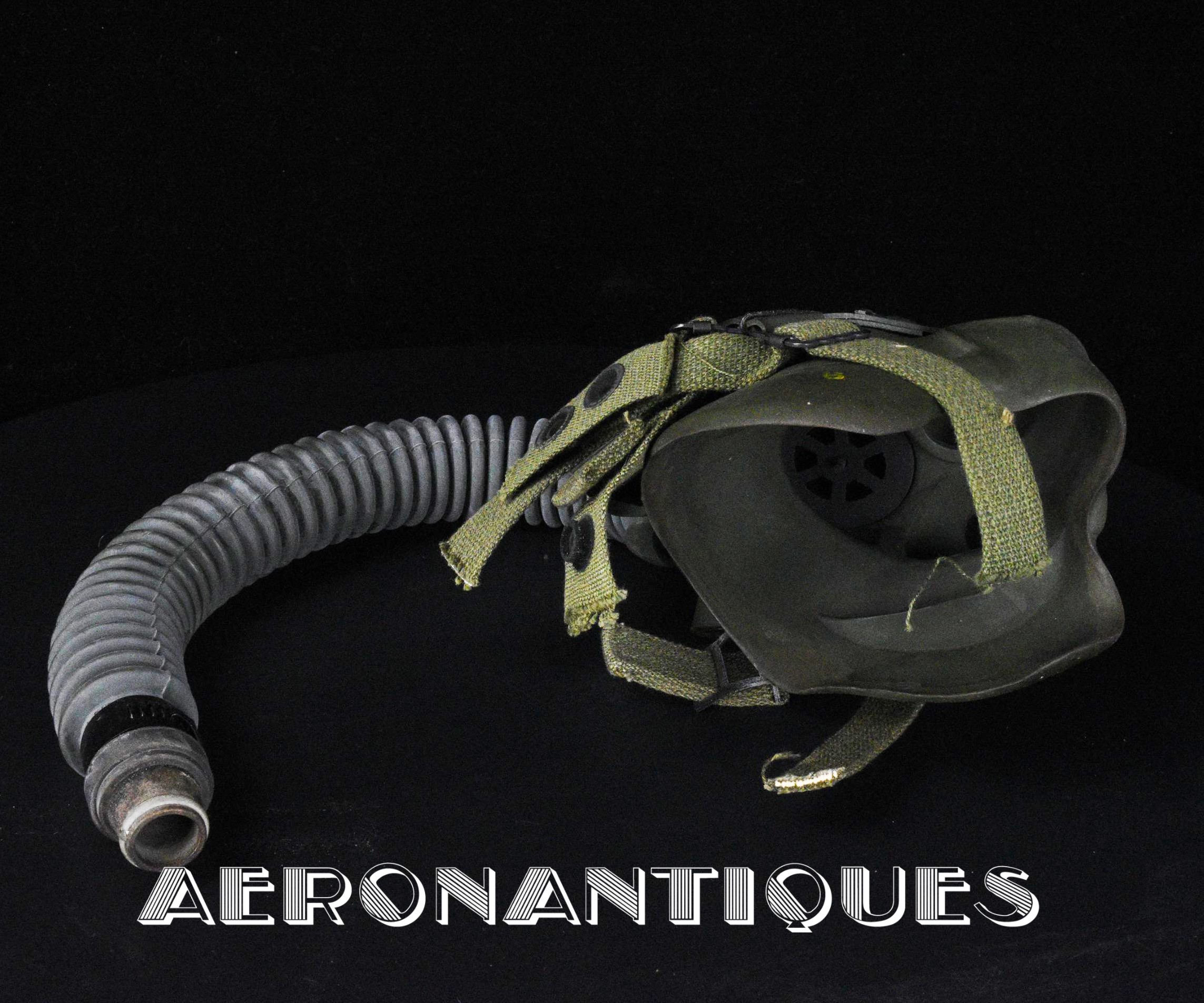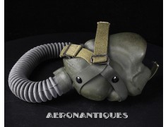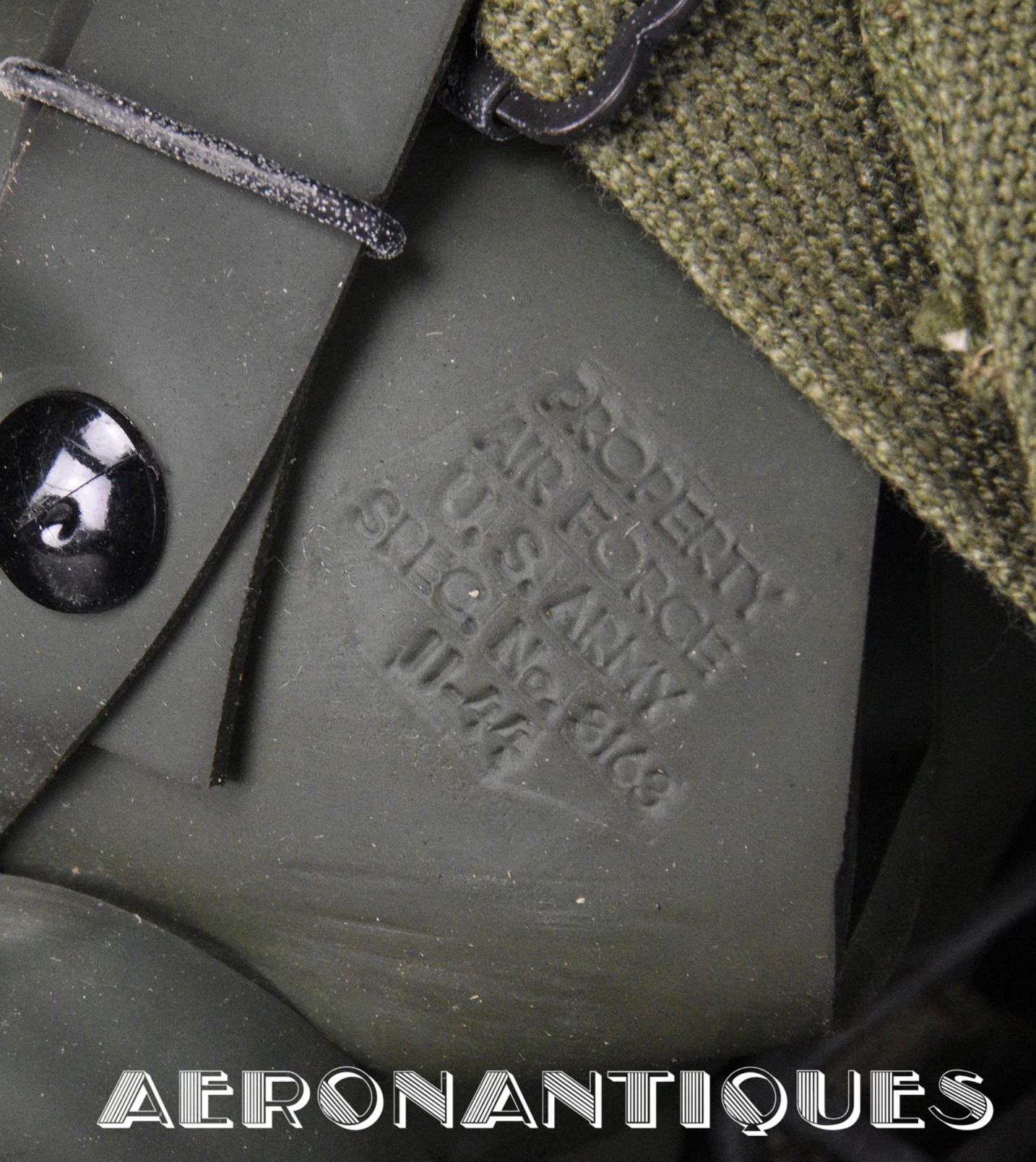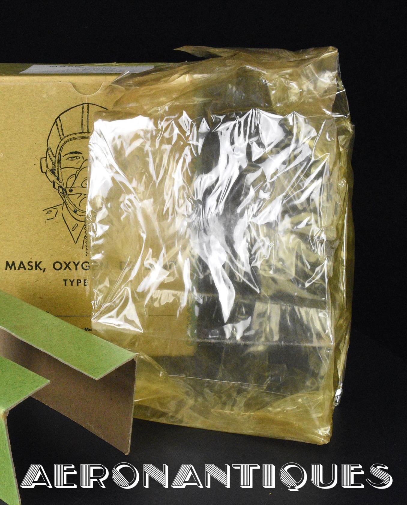 A-14 US Army Air Force regulation flying oxygen mask. Size MEDIUM. Dated 11/44. Made by OHIO CHEMICAL Co. Complete with storage box, instructions and accessories. New old stock, pliable with strong rubber fastening harness. Standardized on July 1943 this mask was issued to Army Air Force, Navy and USMC pilots during WWII. Helmet and display bust aren't included.
