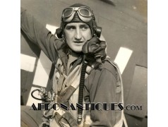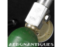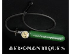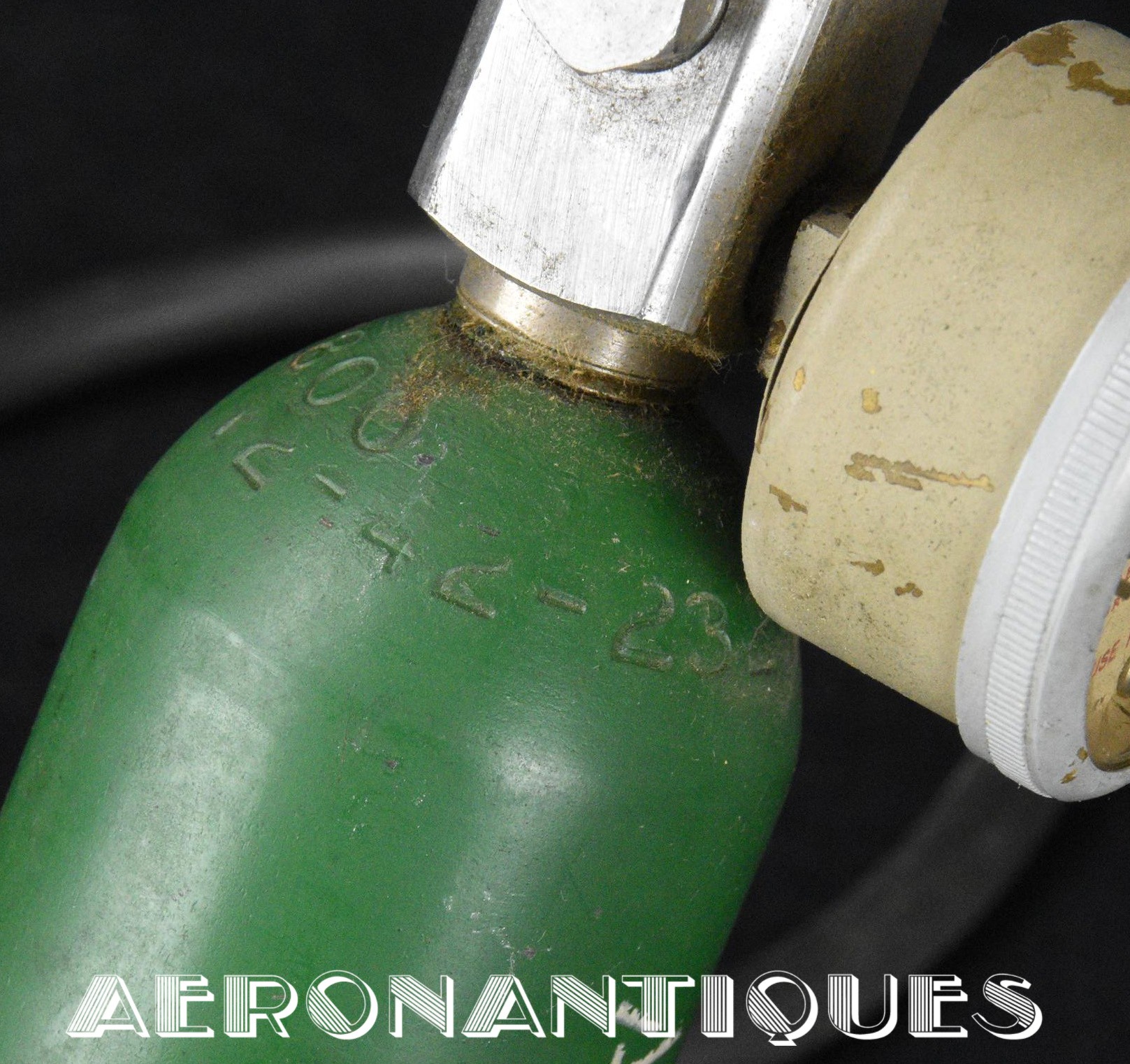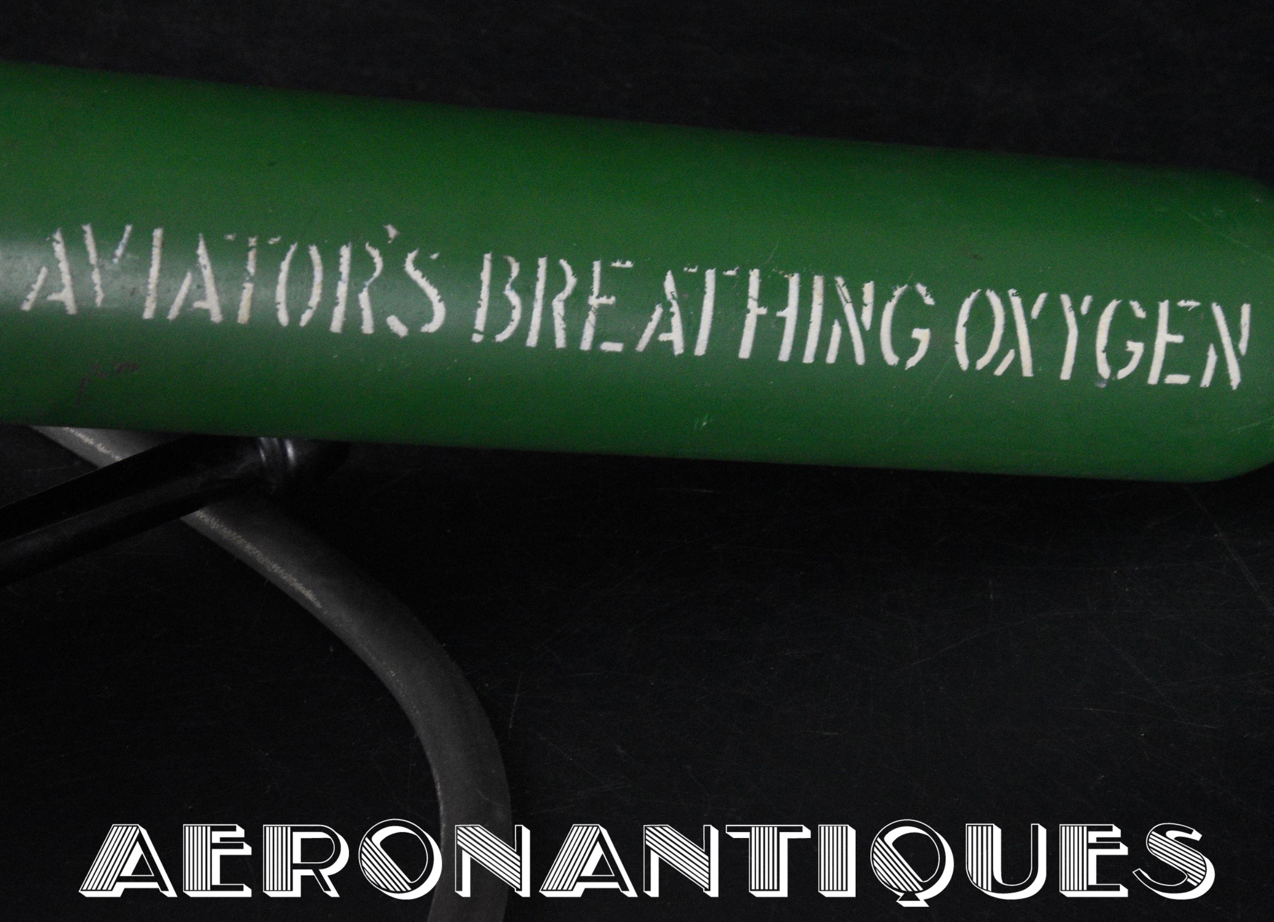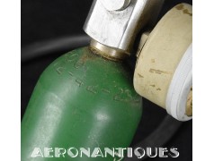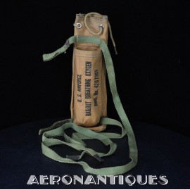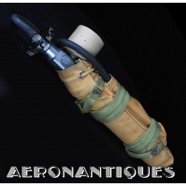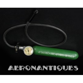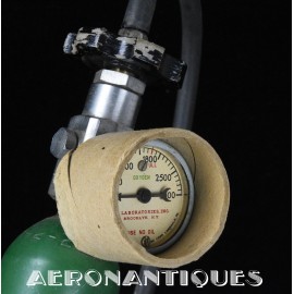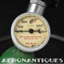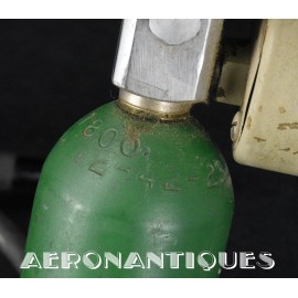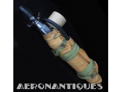 H-1 Bail Out oxygen bottle, complete with cover (full length fastening straps), original matching manometer (with original protection cardboard tube), tube and original mouth piece, for fighter pilots and bomber aircrews. 1st pattern with the wooden wheel valve. Dated 12/1942 on neck. Made by EA Laboratories. Designed to provide 10 minutes of oxygen at high altitude in case of failure of the aircraft main oxygen system or to bail out if the airplane couldn't be taken to a lower altitude before abandoning it. Usually strapped on the thigh or parachute's harness as can be seen on this period pic of 8th Air Force Ace Francis Gabreski. Mint condition.