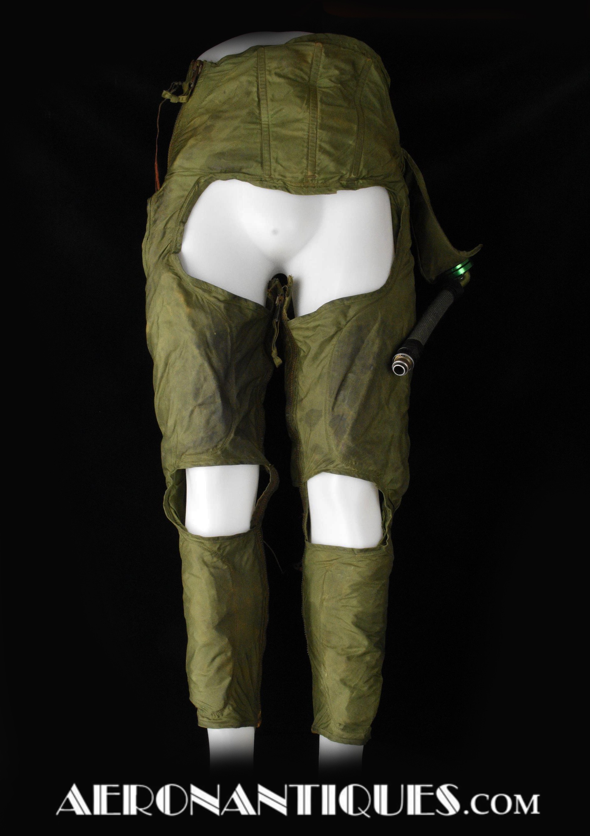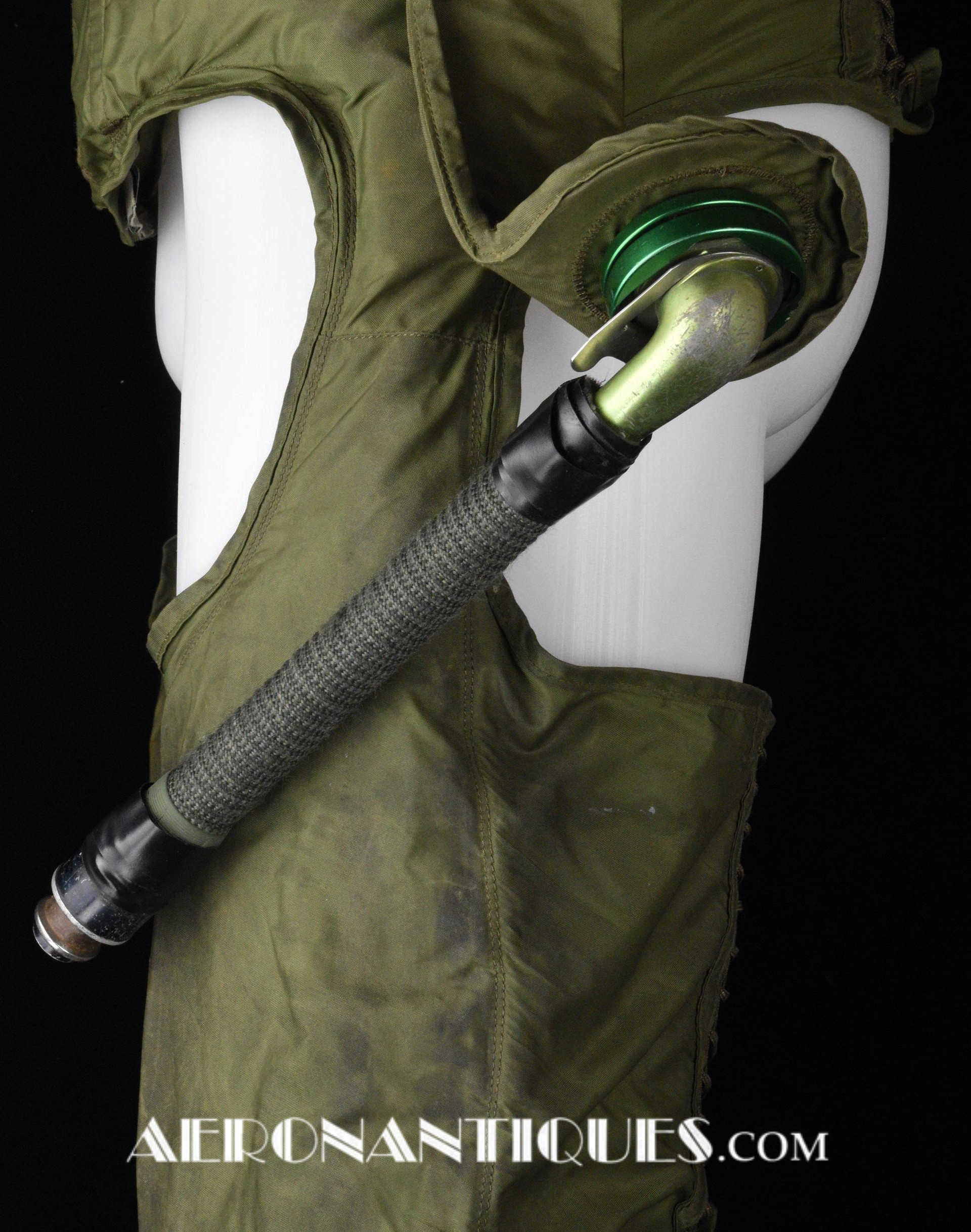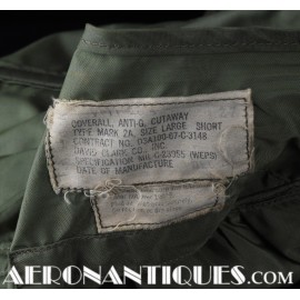 Vietnam era 1967 dated US Navy pilots Mark 2A anti-blackout coveralls. Zippered legs. Size LARGE/SHORT. Removable air supply hose. Issued to US Navy jet pilots until the early 70's. All the zippers are in working condition. Scarce item. The removable hose and fastening device is often missing which isn't the case with this one.